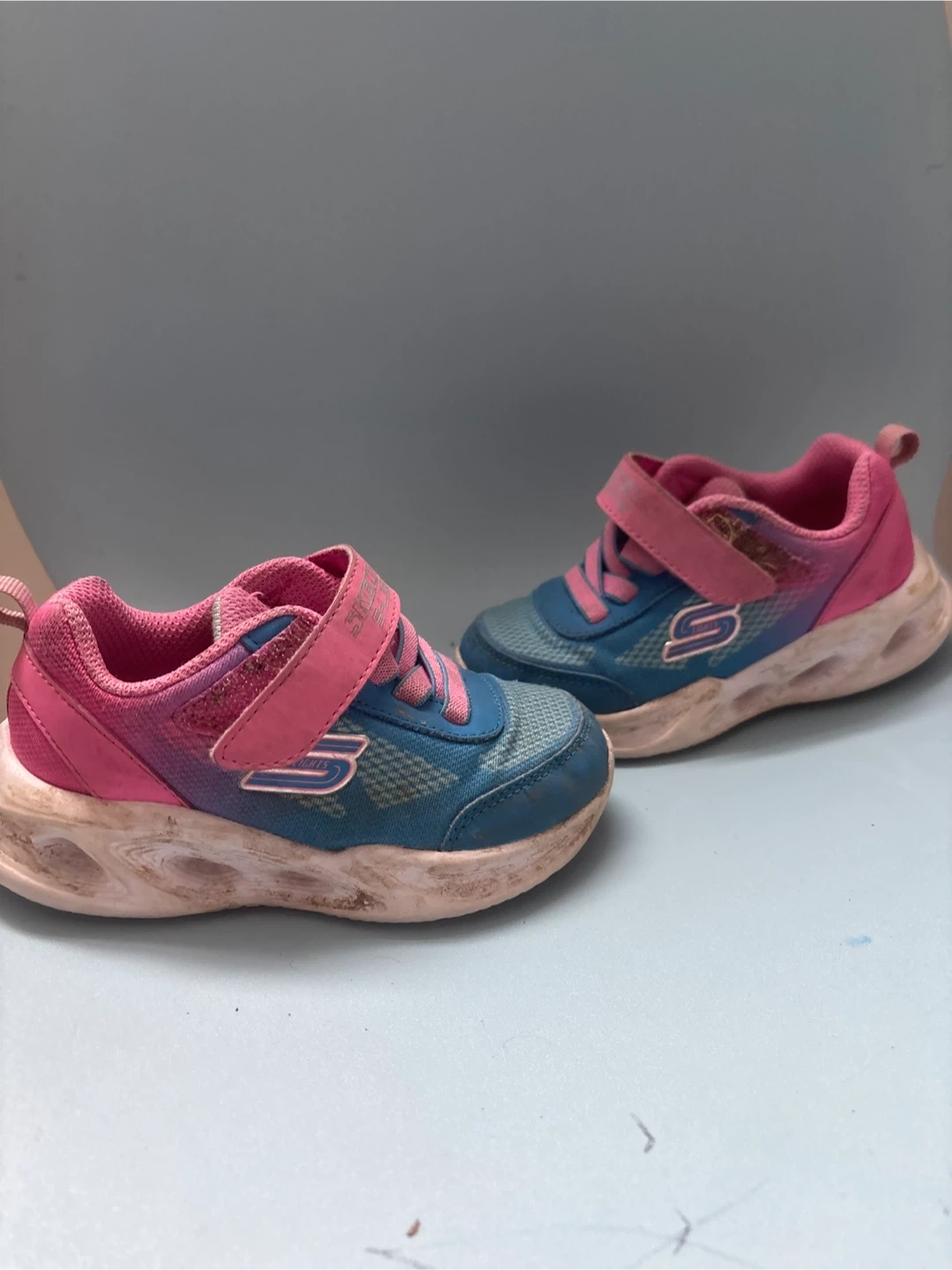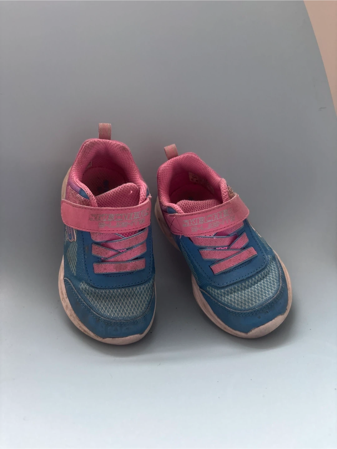 Selling a pair of Skechers kid S-lighted sneakers in size 7. They are blue and pink. Please see photos for condition!