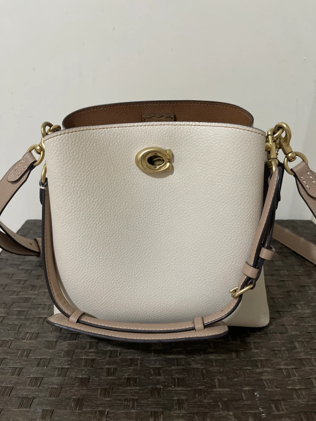 Selling a cute Coach bucket bag in ivory and taupe. It's in great condition and perfect for everyday use! The neutral colors make it easy to match with any outfit