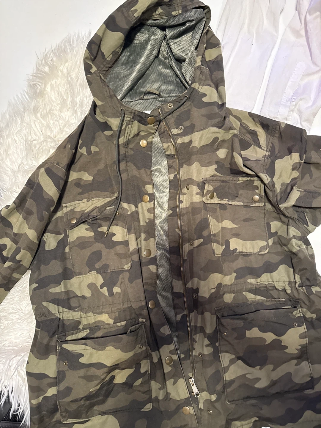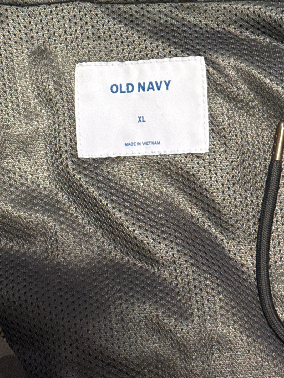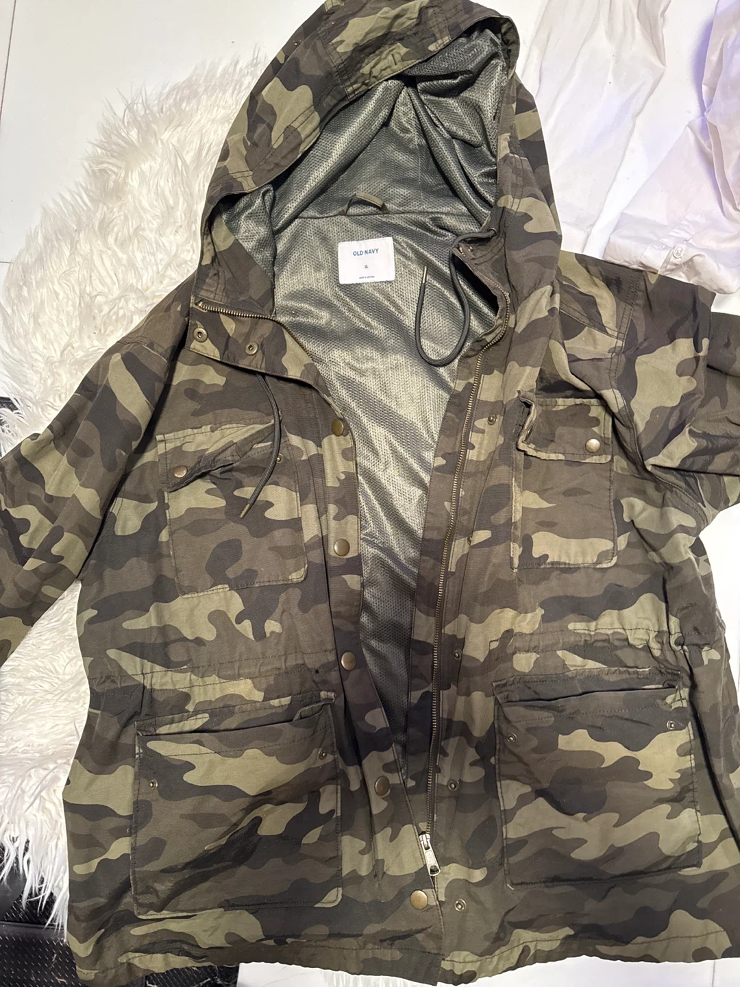 I'm selling an Old Navy hooded jacket in size XL. It features a stylish camouflage print and is in great condition. Perfect for adding a touch of utility to your wardrobe!