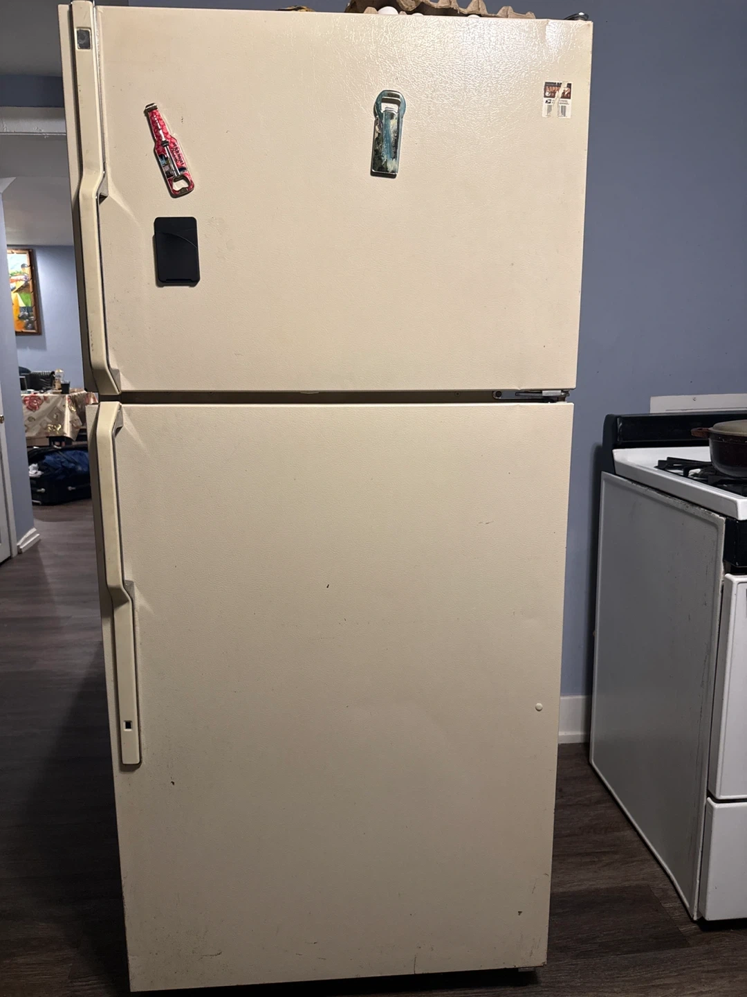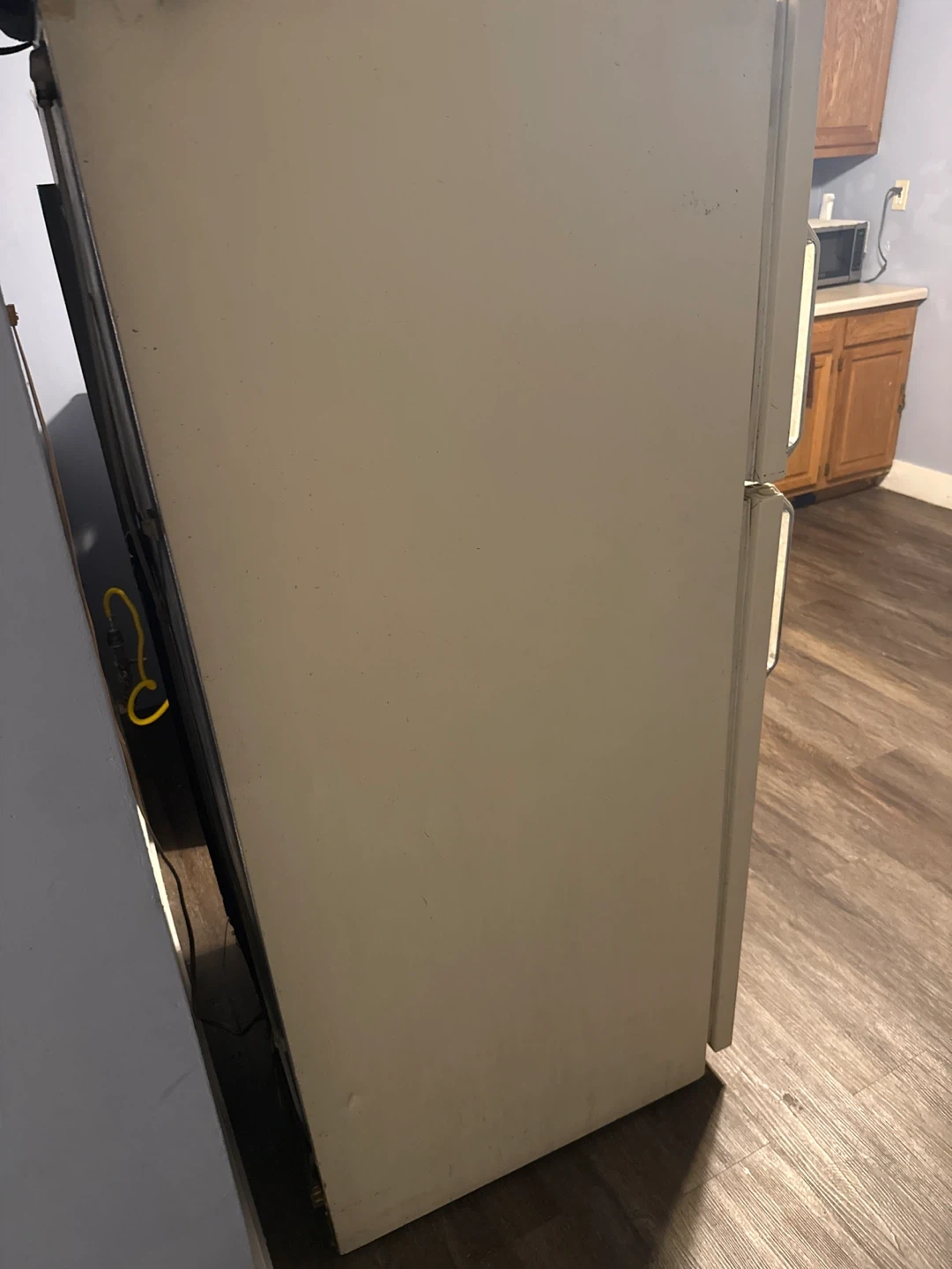 Selling a used refrigerator with a top freezer. It's in good working condition and ready for a new home. Perfect for a small apartment or as a secondary fridge!