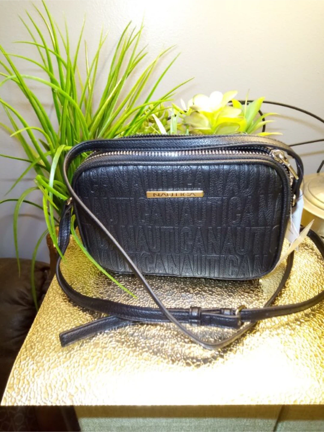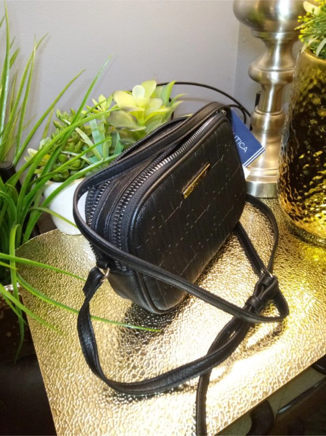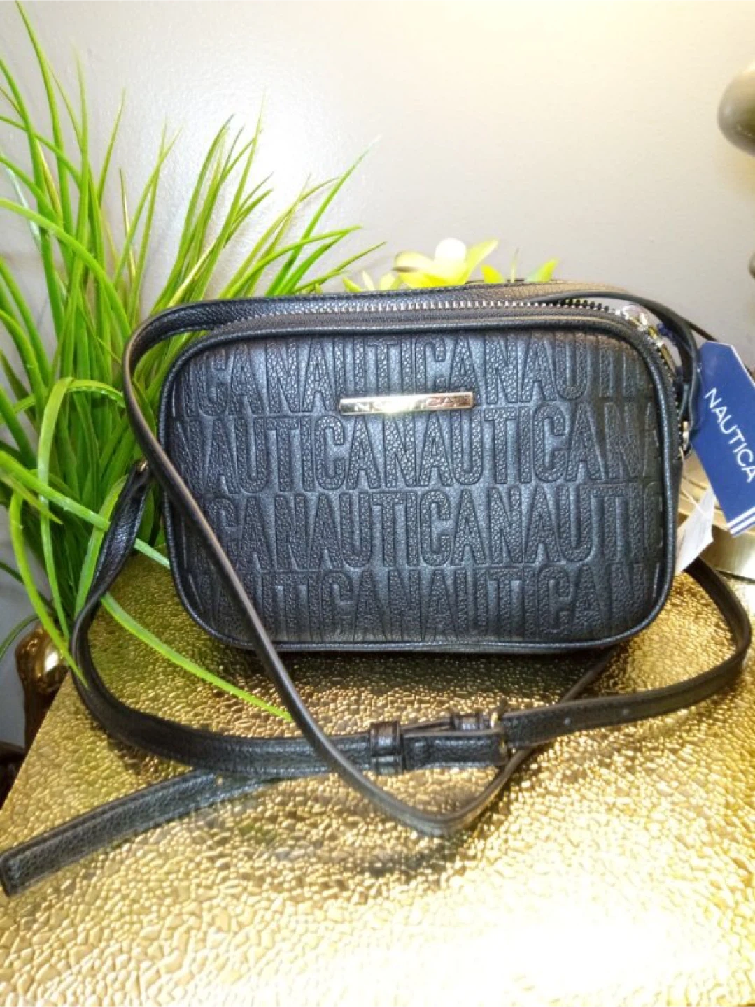 This is a cute black crossbody bag from Nautica! It features an embossed Nautica logo pattern and a convenient adjustable strap. Perfect for everyday use!