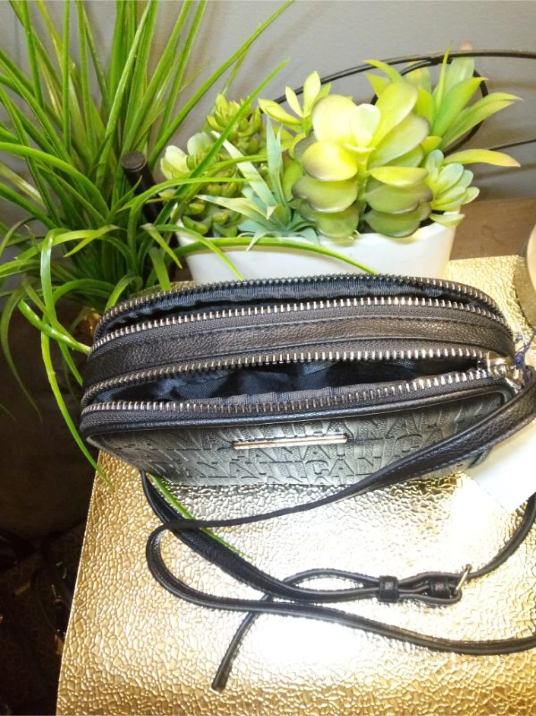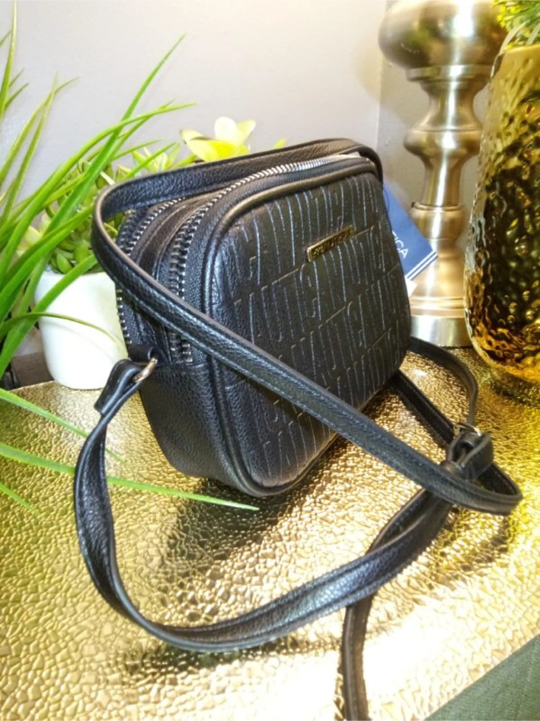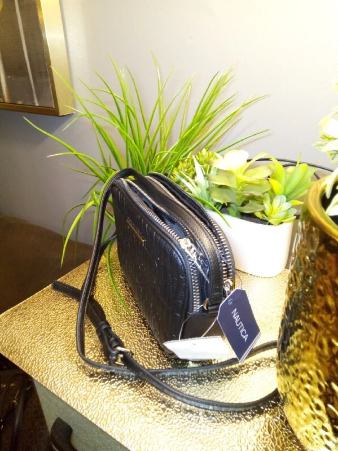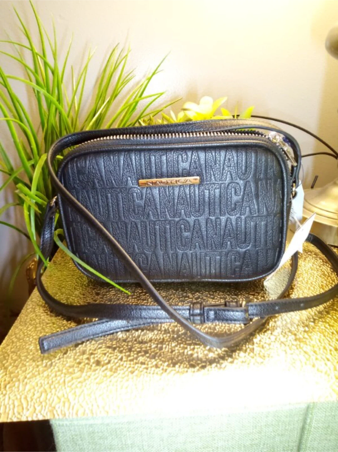 This is a cute black crossbody bag from Nautica! It features an embossed Nautica logo pattern and a convenient adjustable strap. Perfect for everyday use!