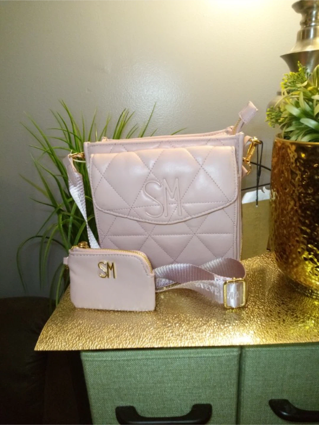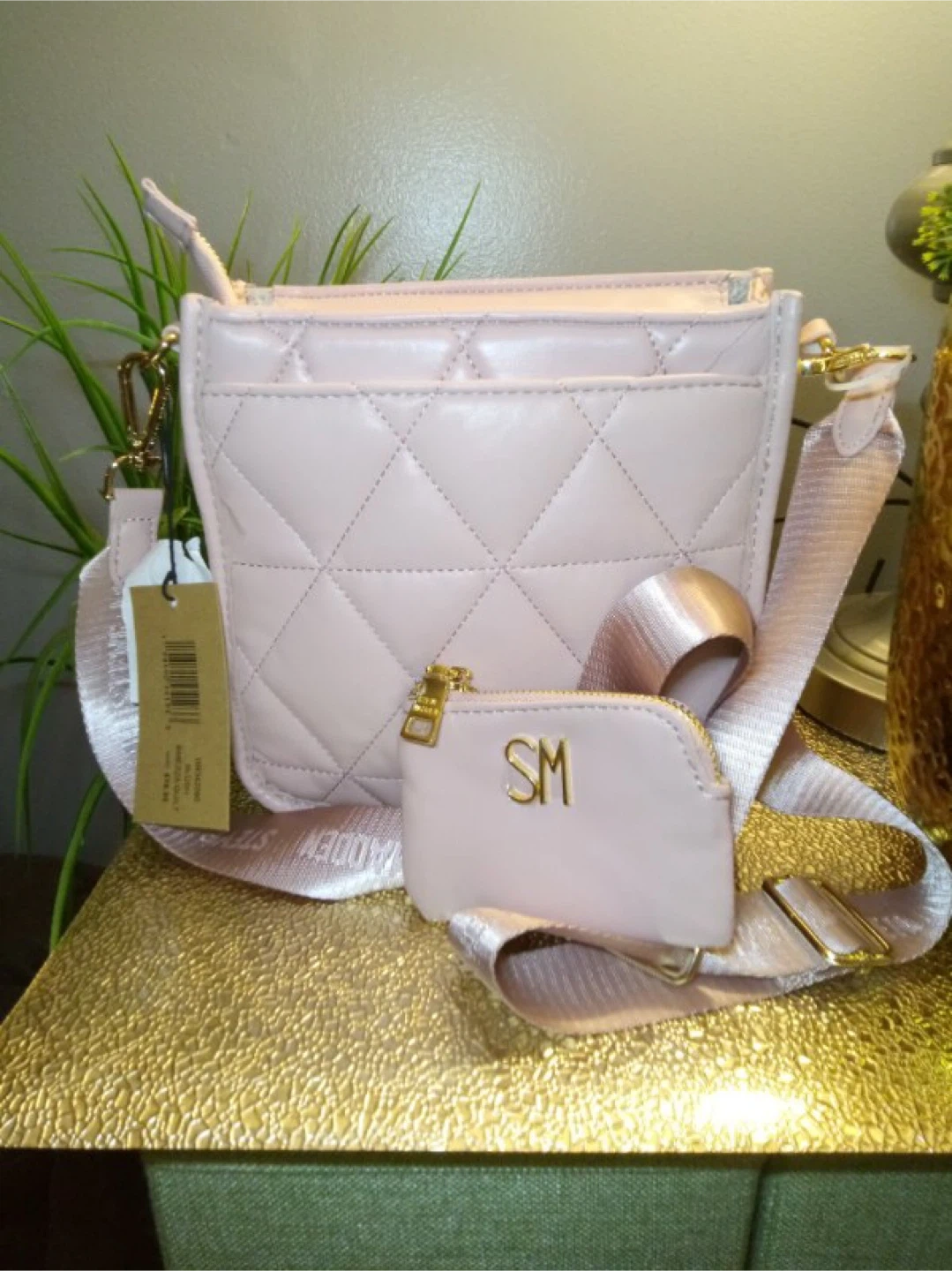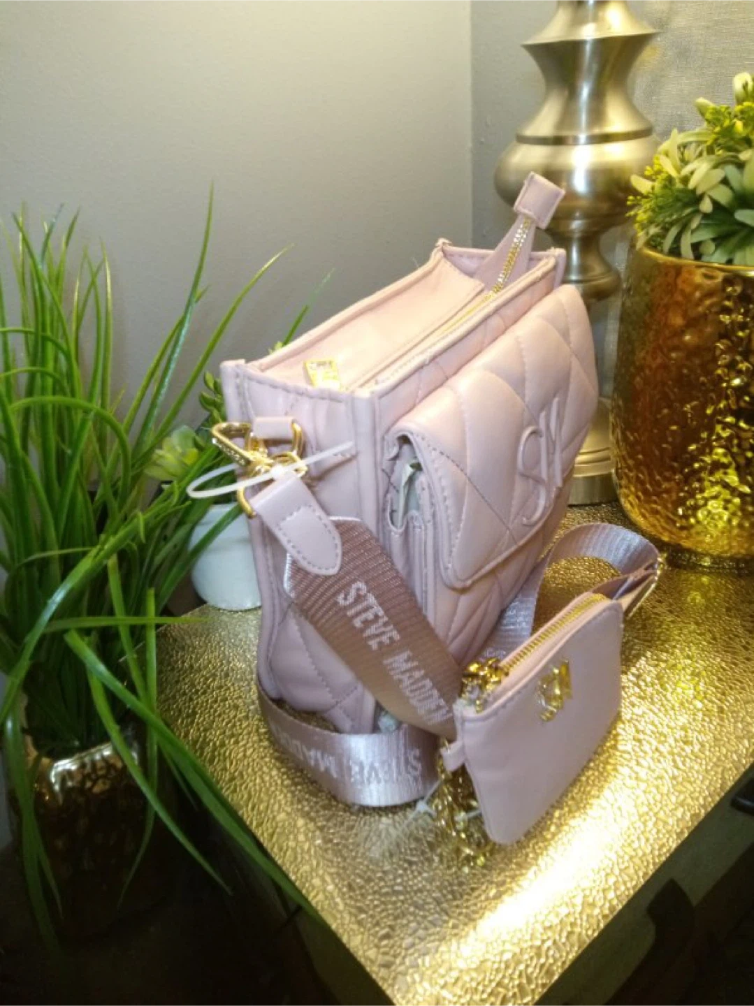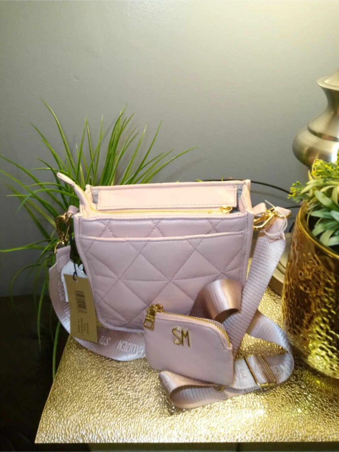 Selling a cute Steve Madden crossbody bag in a lovely pink color! It comes with a matching coin purse, perfect for keeping your essentials organized. The bag features a stylish quilted design with the Steve Madden logo. Great for everyday use or a night out!