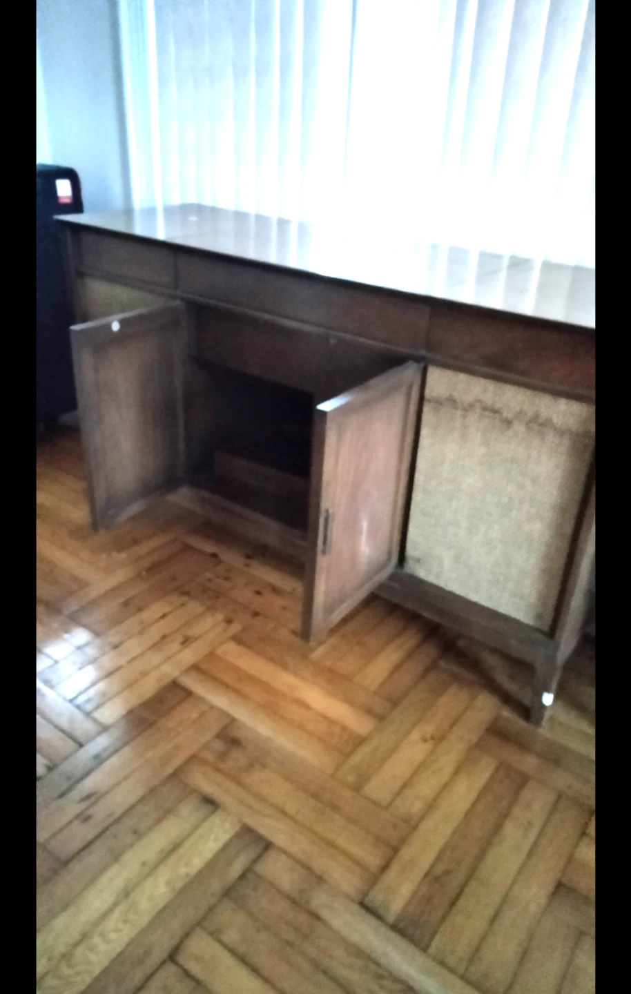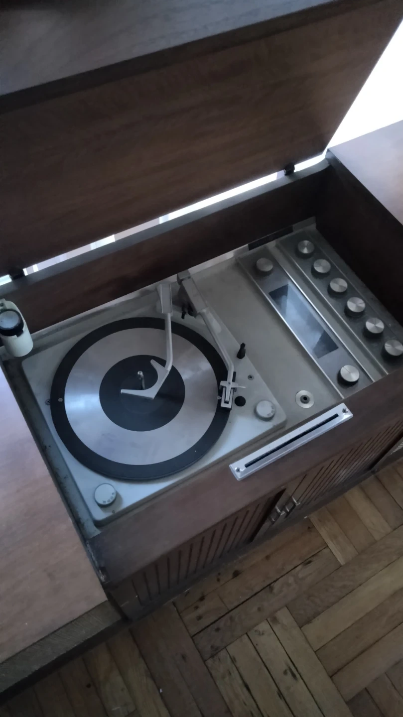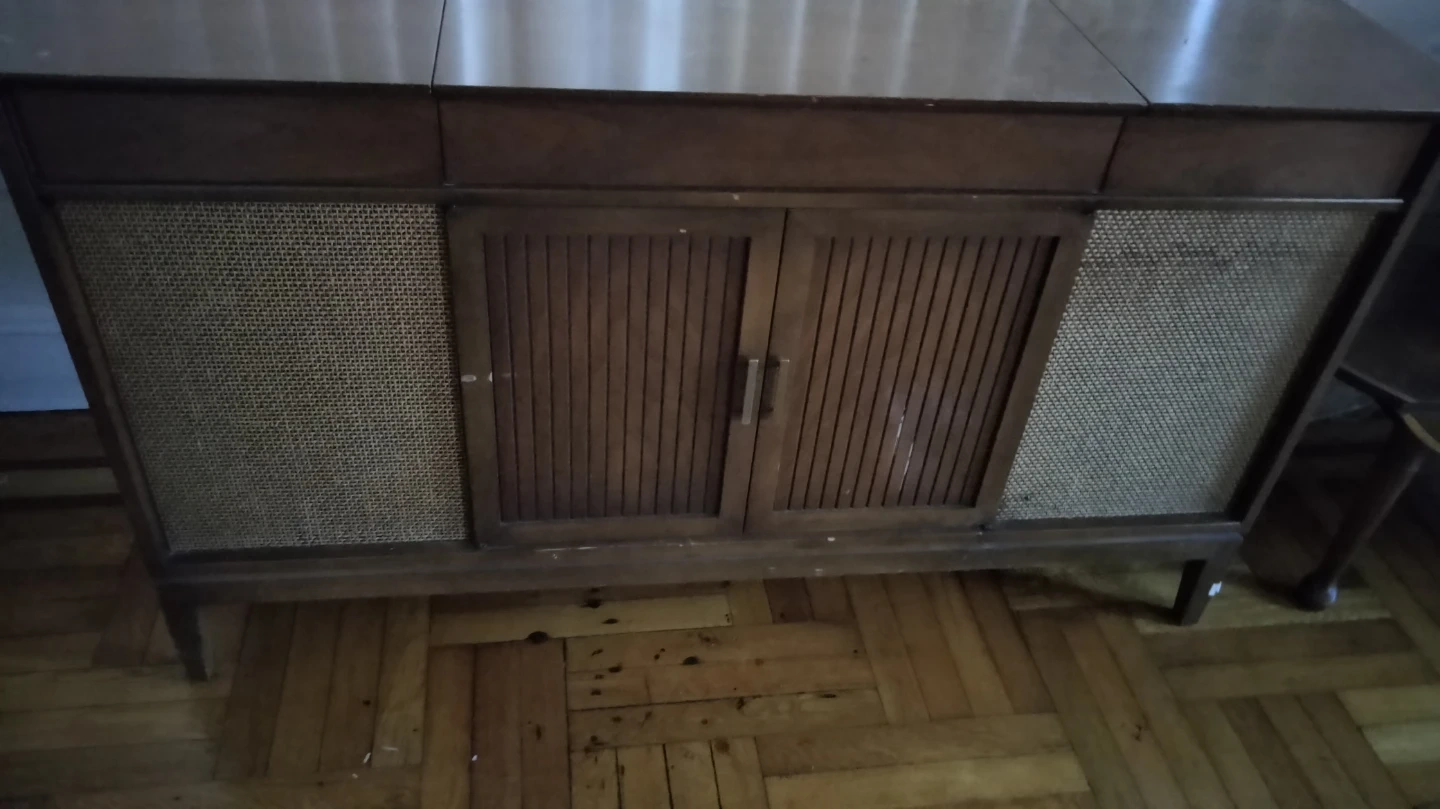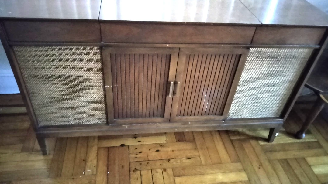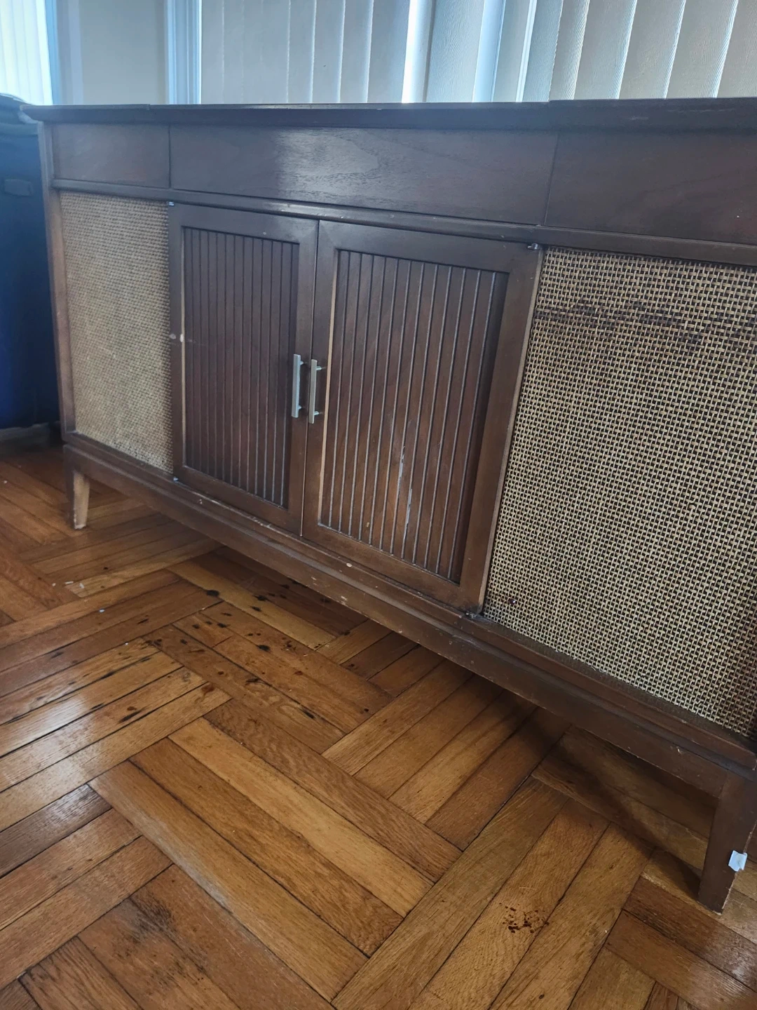 Selling a vintage record player cabinet. It has a cool retro look with a wood finish and woven speaker covers. The cabinet features storage compartments and a built-in record player. Perfect for adding a touch of mid-century style to your home!