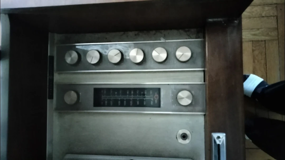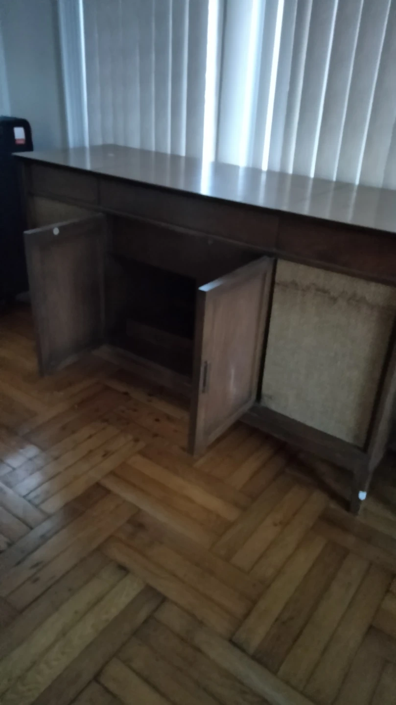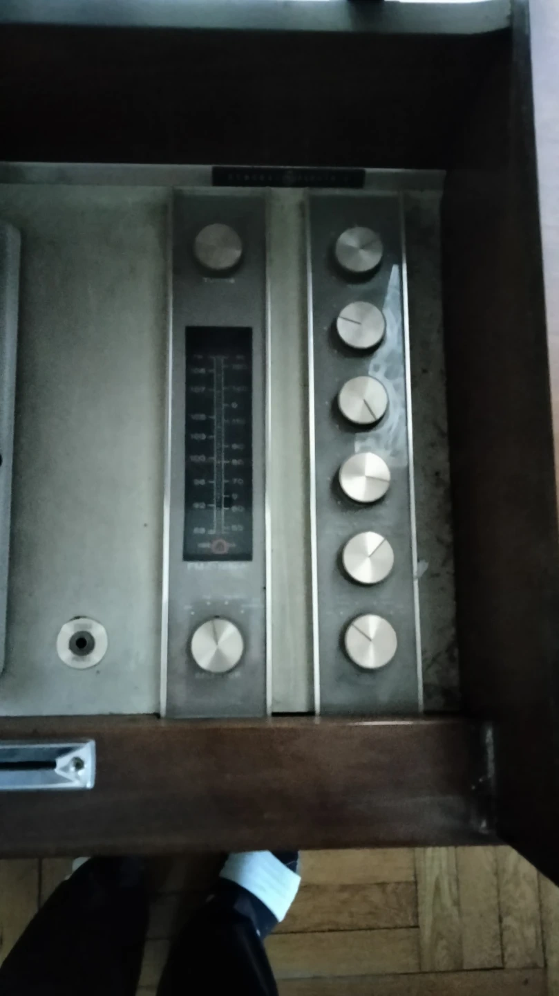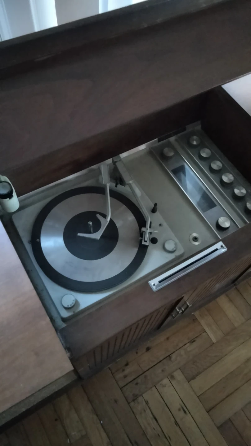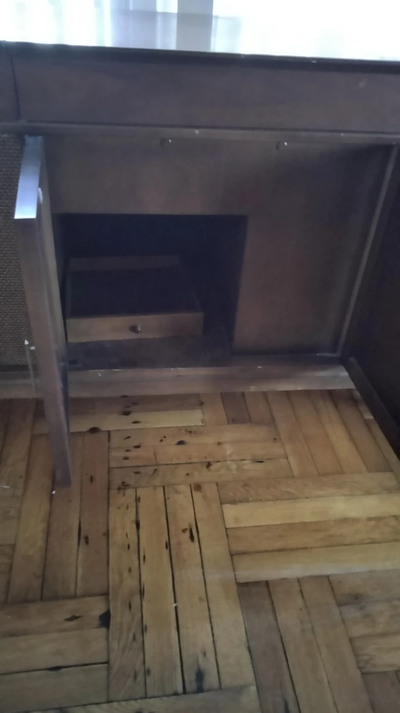 Selling a vintage record player cabinet. It has a cool retro look with a wood finish and woven speaker covers. The cabinet features storage compartments and a built-in record player. Perfect for adding a touch of mid-century style to your home!