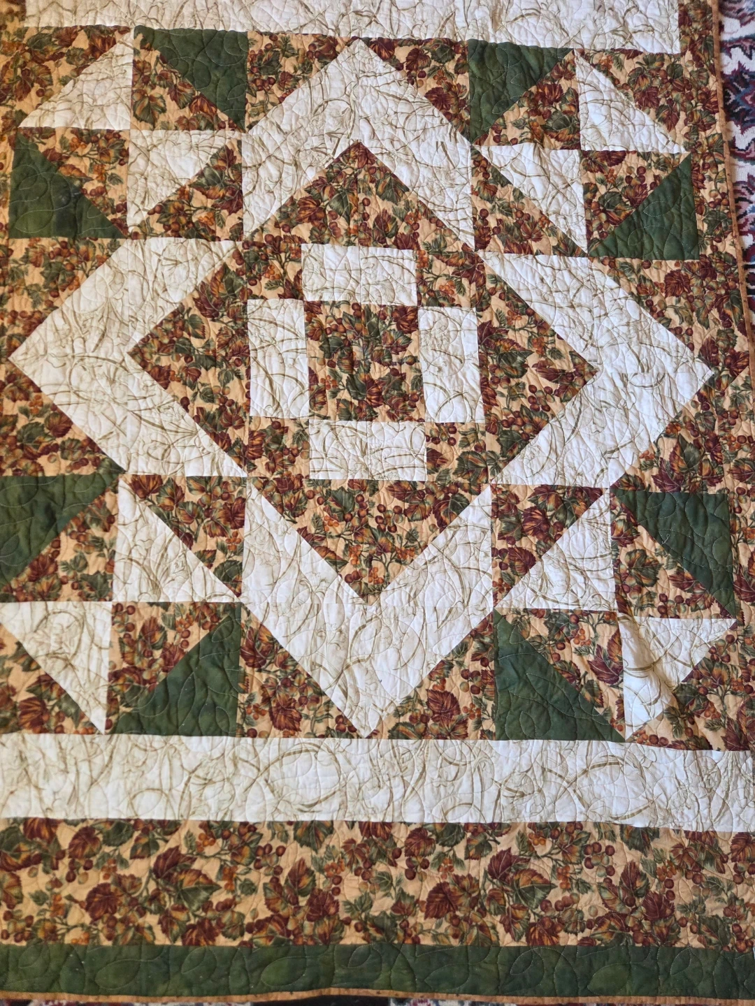 Selling a lovely handmade quilted throw blanket. It features a unique pattern with earth-tone floral prints, cream, and green accents. It's in great condition and would be perfect for adding a cozy touch to your home!