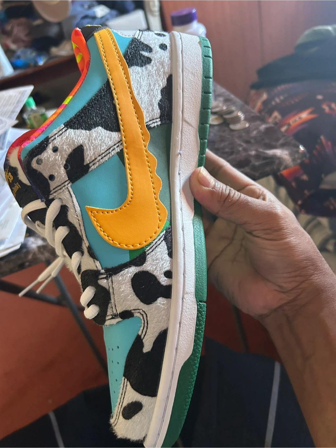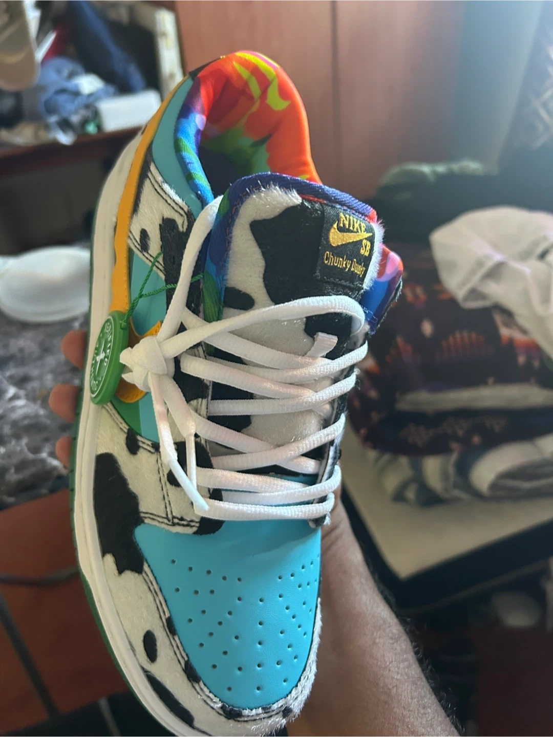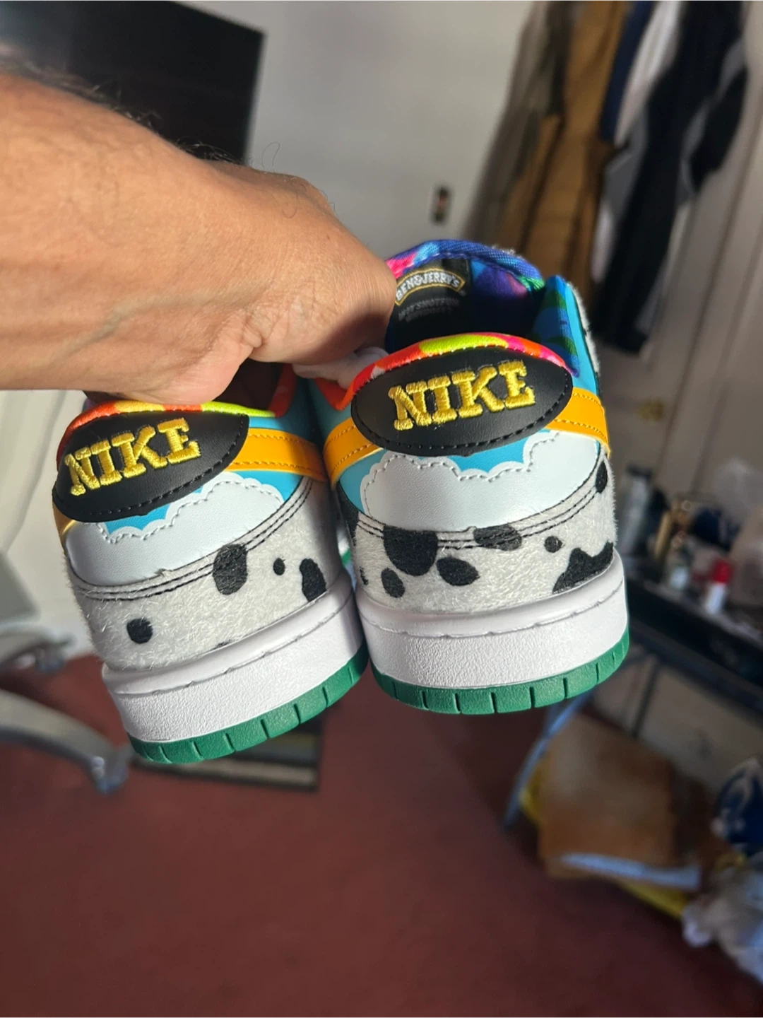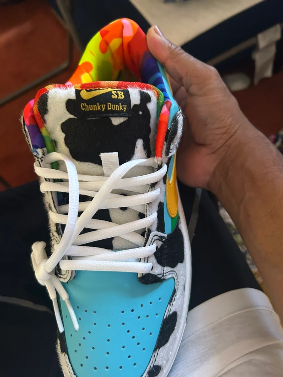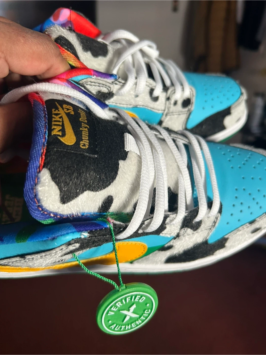 Selling a pair of Nike SB Dunk Lows in the Ben & Jerry's Chunky Dunky colorway! These sneakers feature a unique design with cow print, blue sky, and melting swoosh details. A fun and eye-catching addition to any sneaker collection