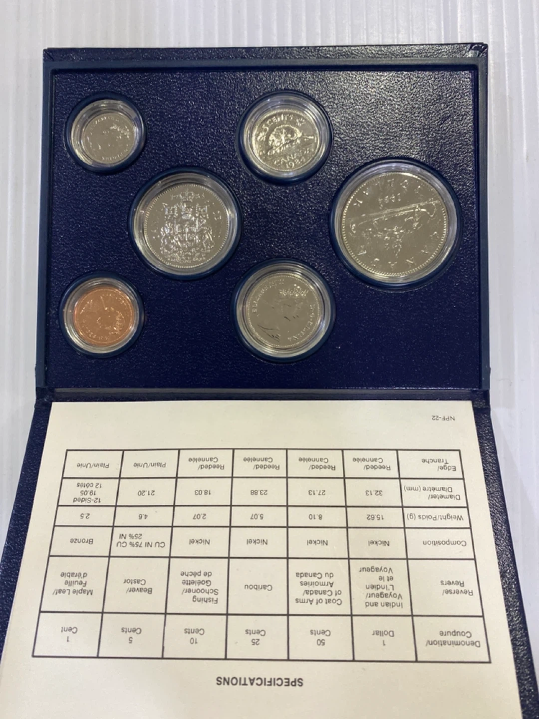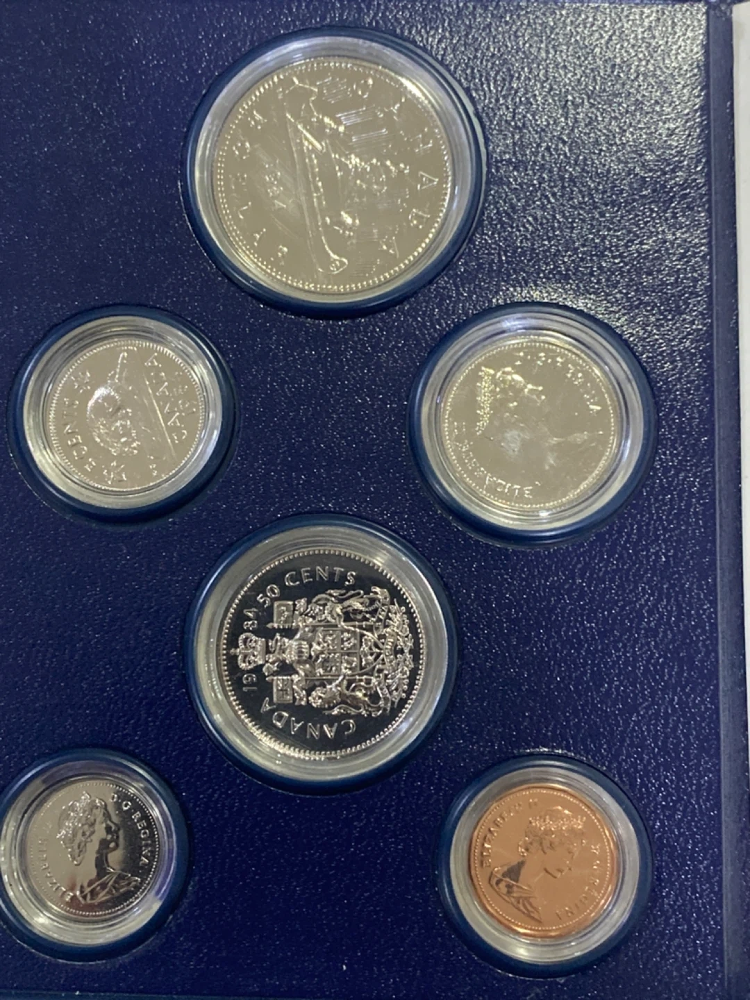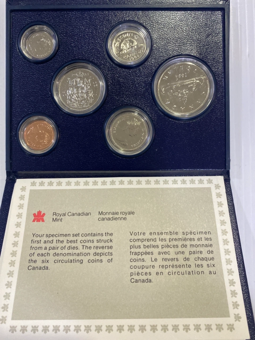 Selling a 1984 Royal Canadian Mint specimen set! It contains the first and the best coins struck from a pair of dies. The reverse of each denomination depicts the six circulating coins of Canada. Comes in its original case
