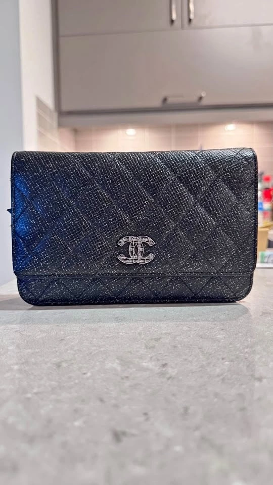 Limited edition Chanel WOC, the material is a Black Glitter Calfskin - subtle sparkles and very gorgeous to see in person!