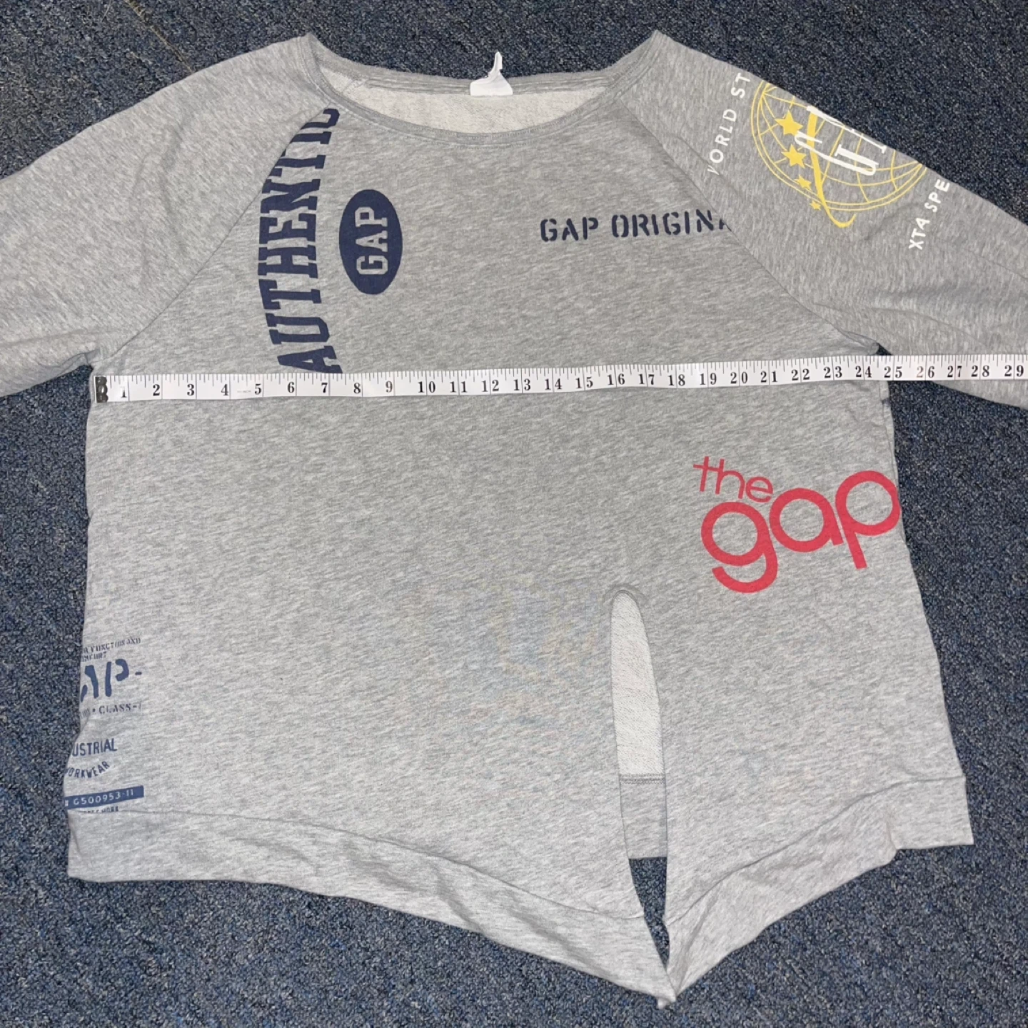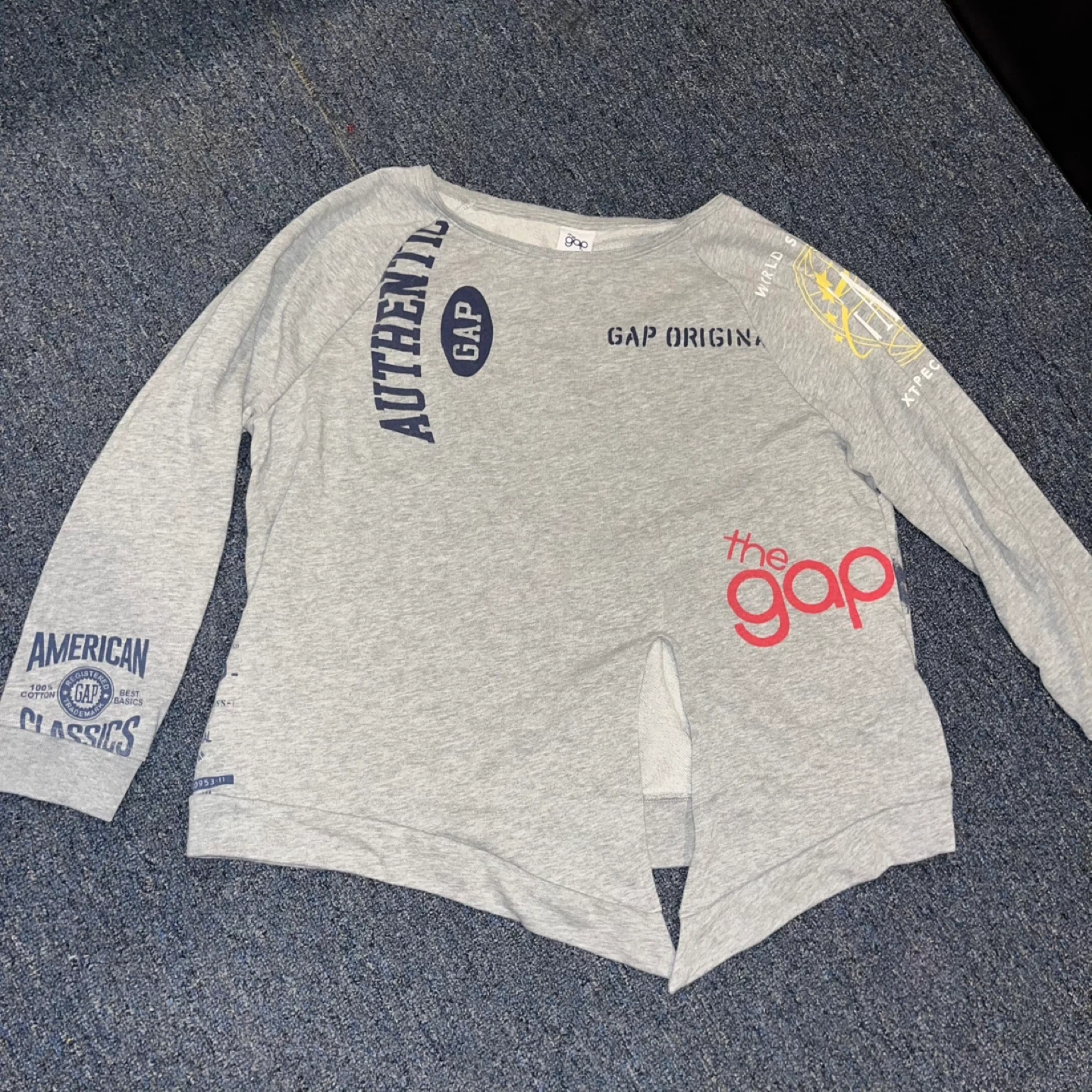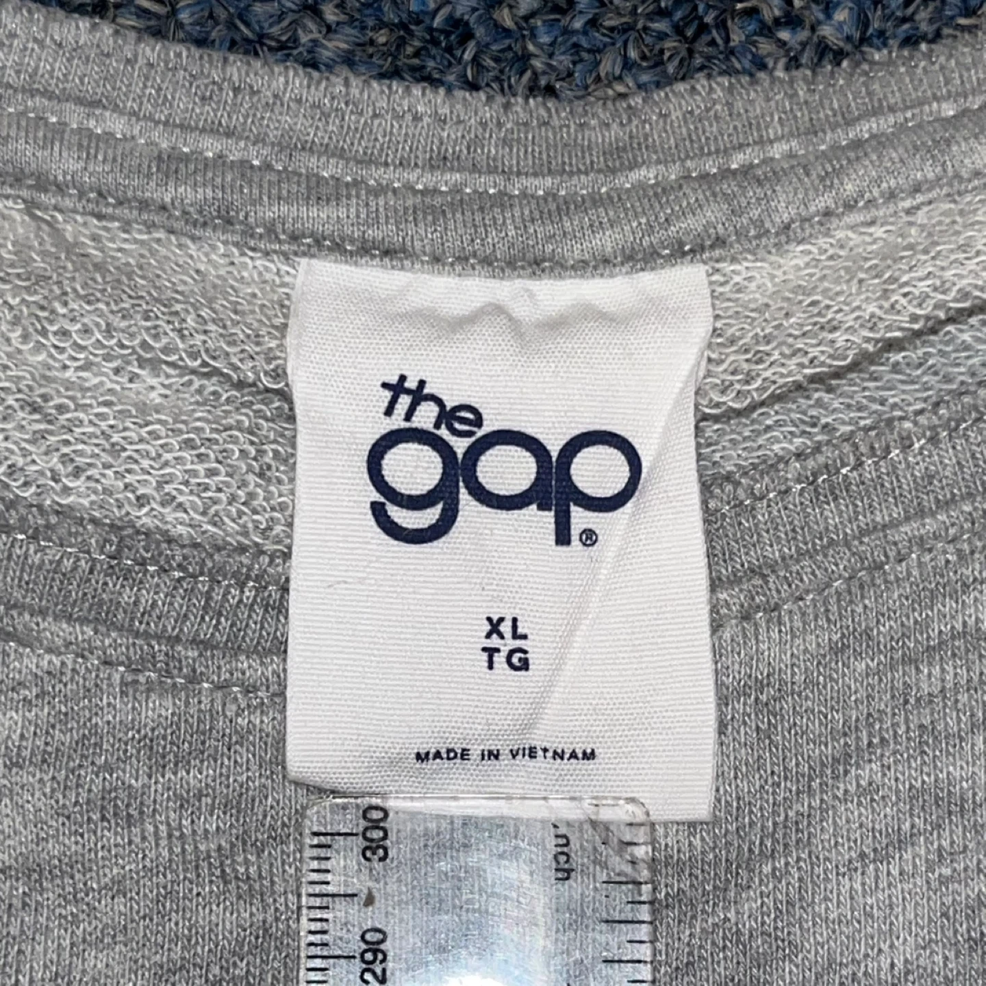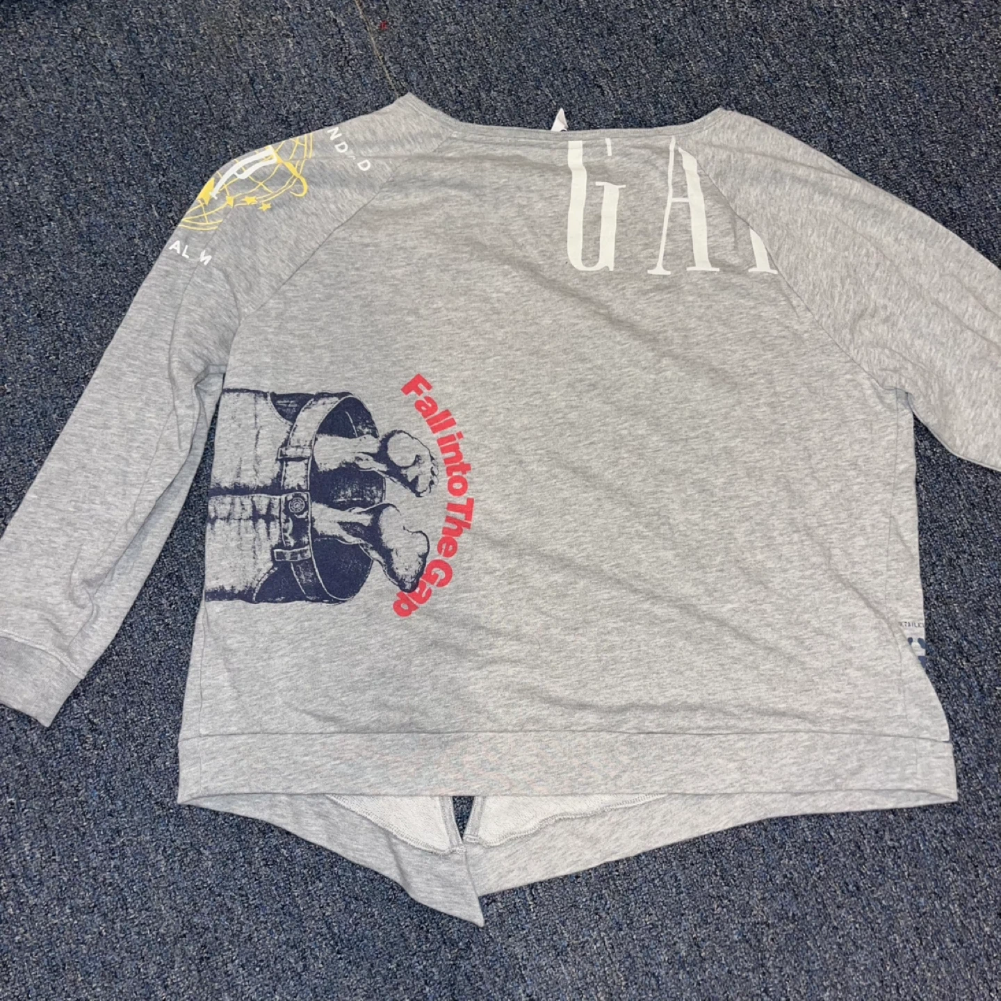 Casual gray pull-over sweater with bold graphics. Features the old GAP logo tag and tie-waist design.