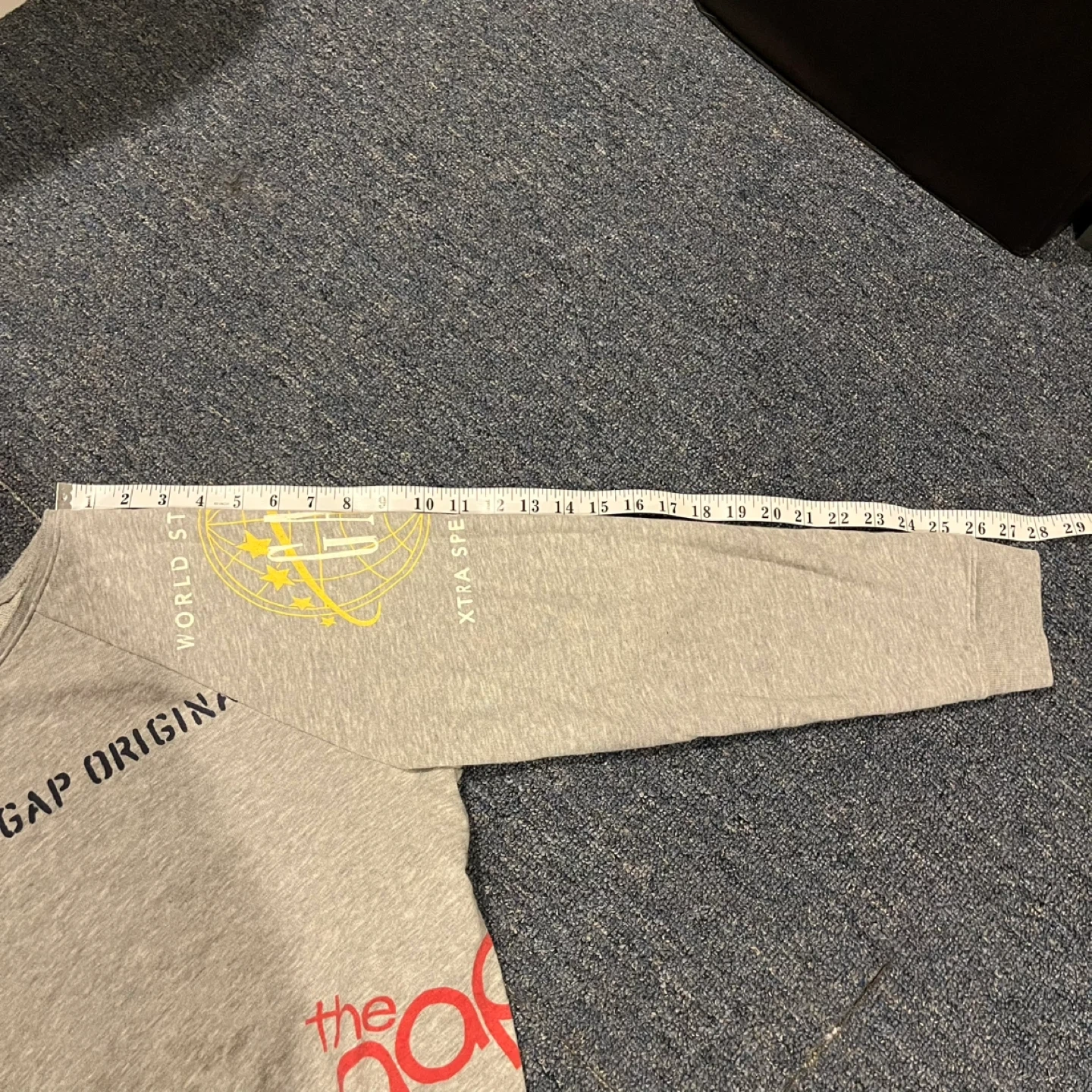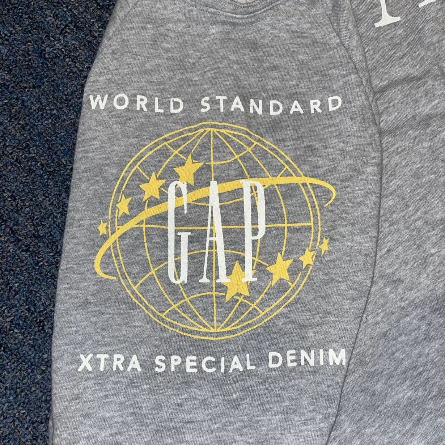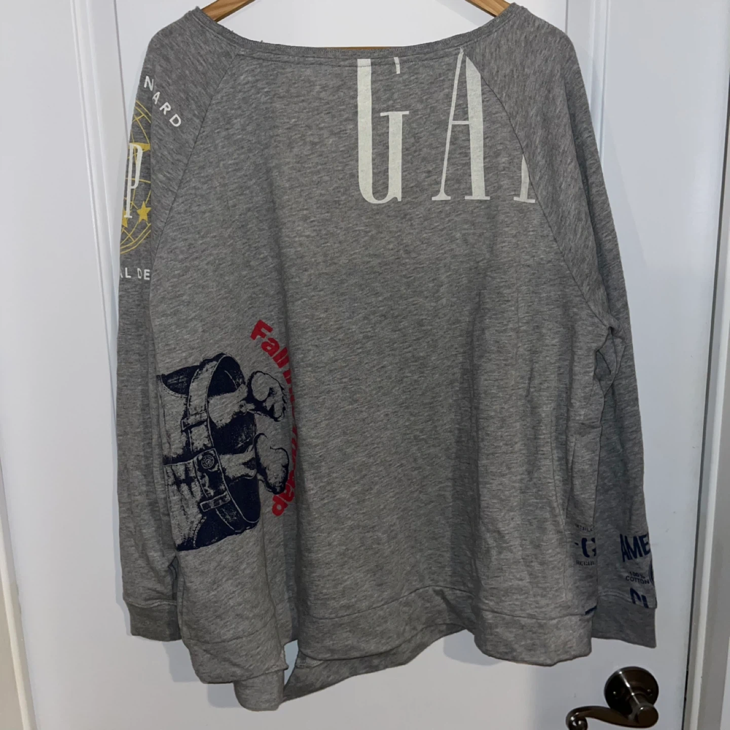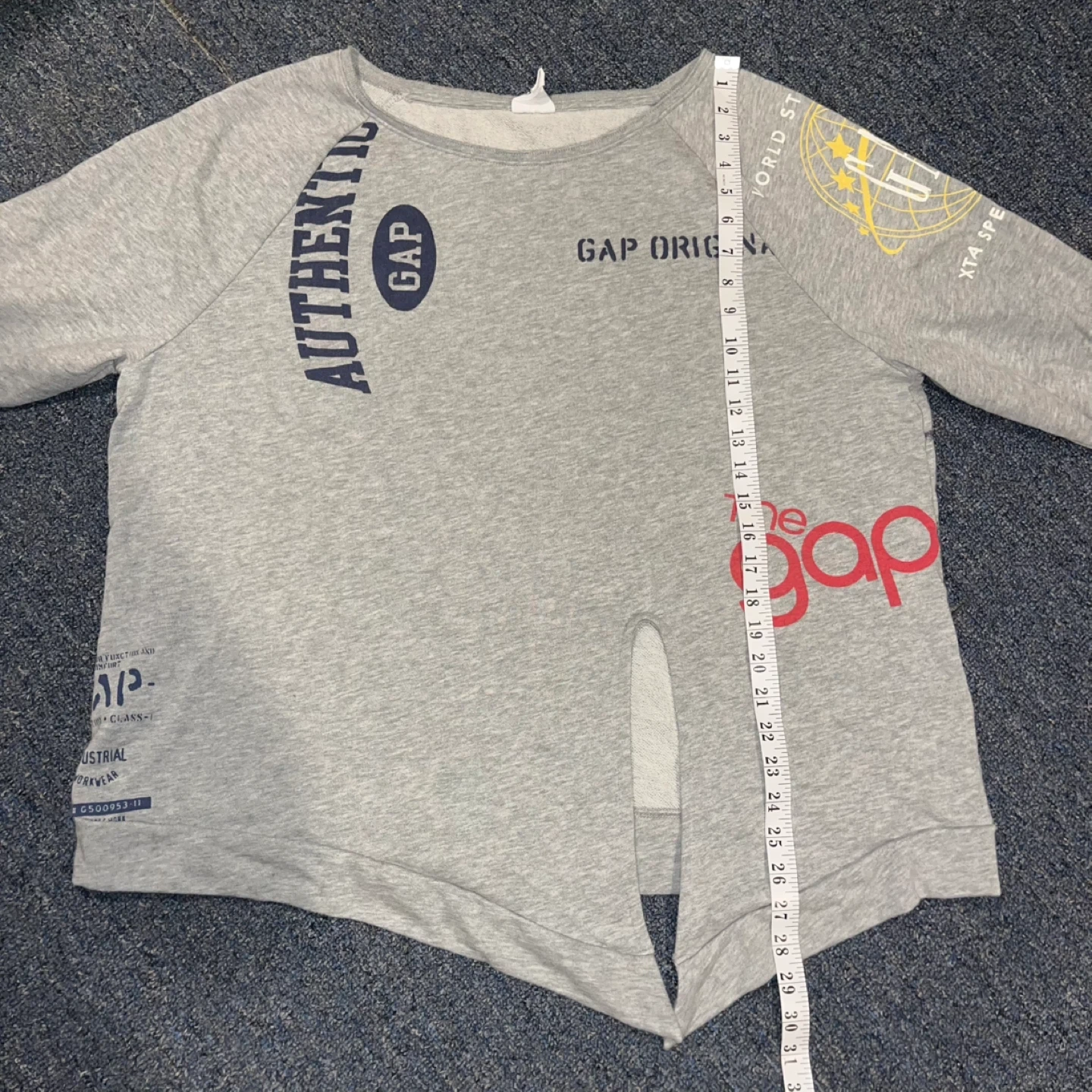 Casual gray pull-over sweater with bold graphics. Features the old GAP logo tag and tie-waist design.