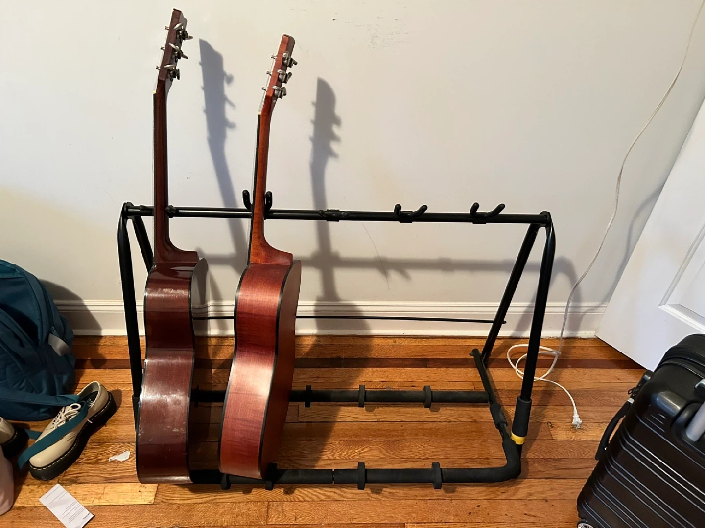 Selling a sturdy guitar stand that can hold up to 5 guitars. It's in great shape and perfect for any musician looking to keep their instruments organized and safe.