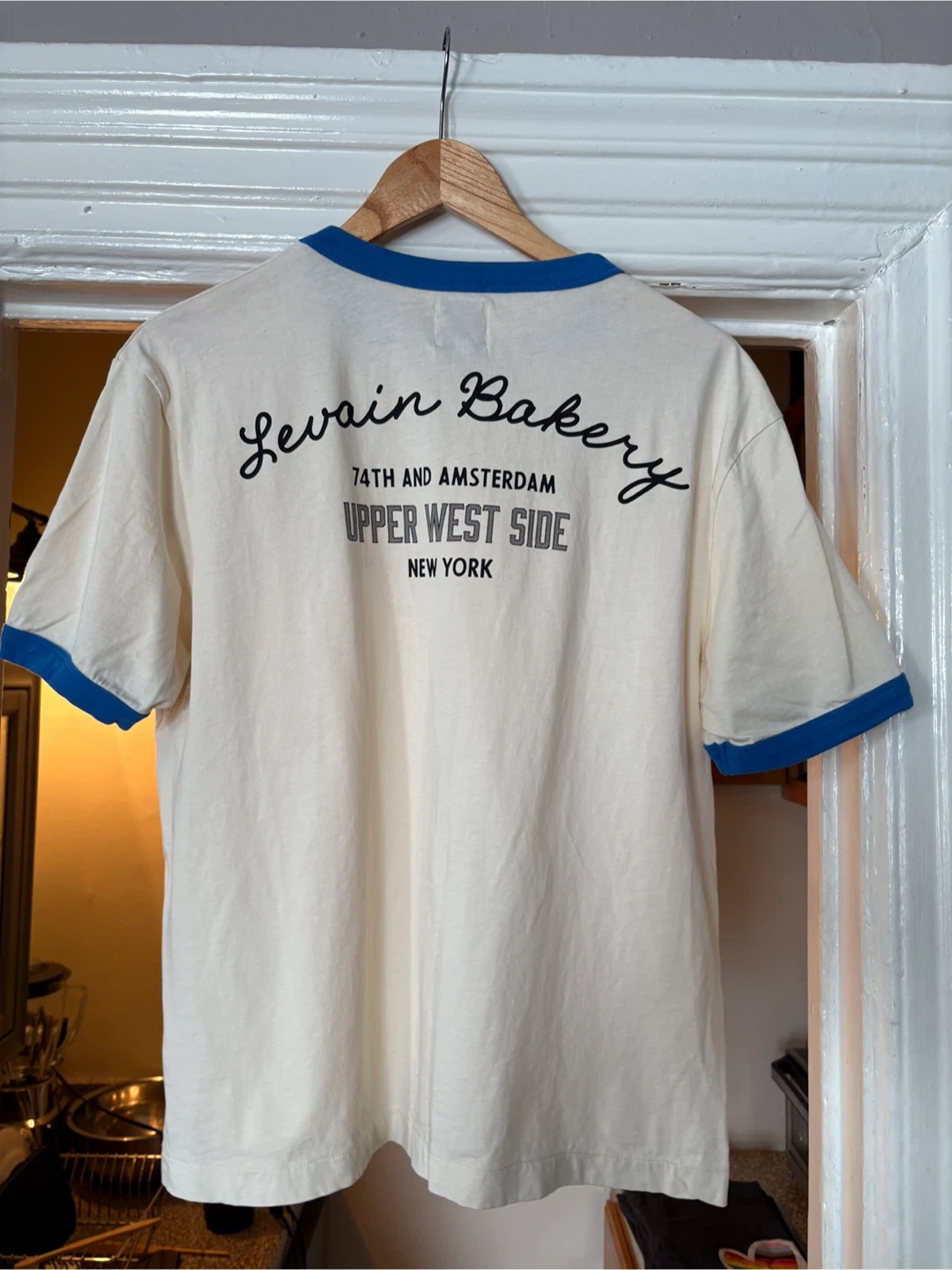 Limited Edition natural color sport tee, piped in royal blue around the neck and arms. Levain logo and establishment screen printed on black in front with upper west side branding on back. Men’s size medium, never worn.