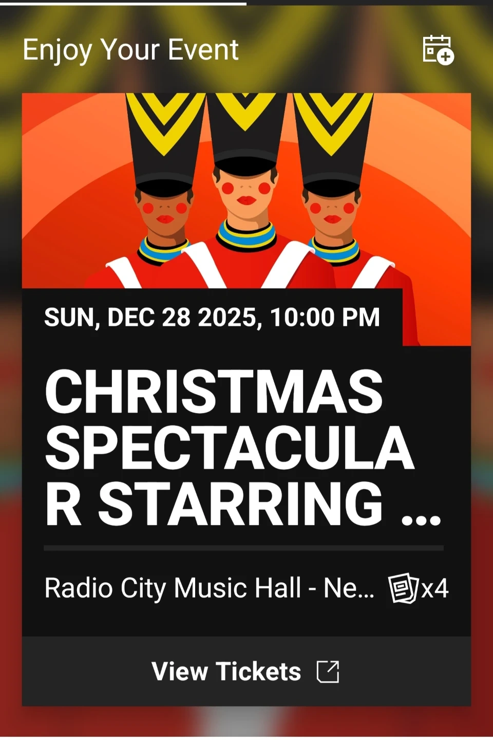 Selling 1 ticket to the Christmas Spectacular Starring... at Radio City Music Hall. The show is on Sunday, December 28, 2025, at 10:00 PM. Enjoy your event!