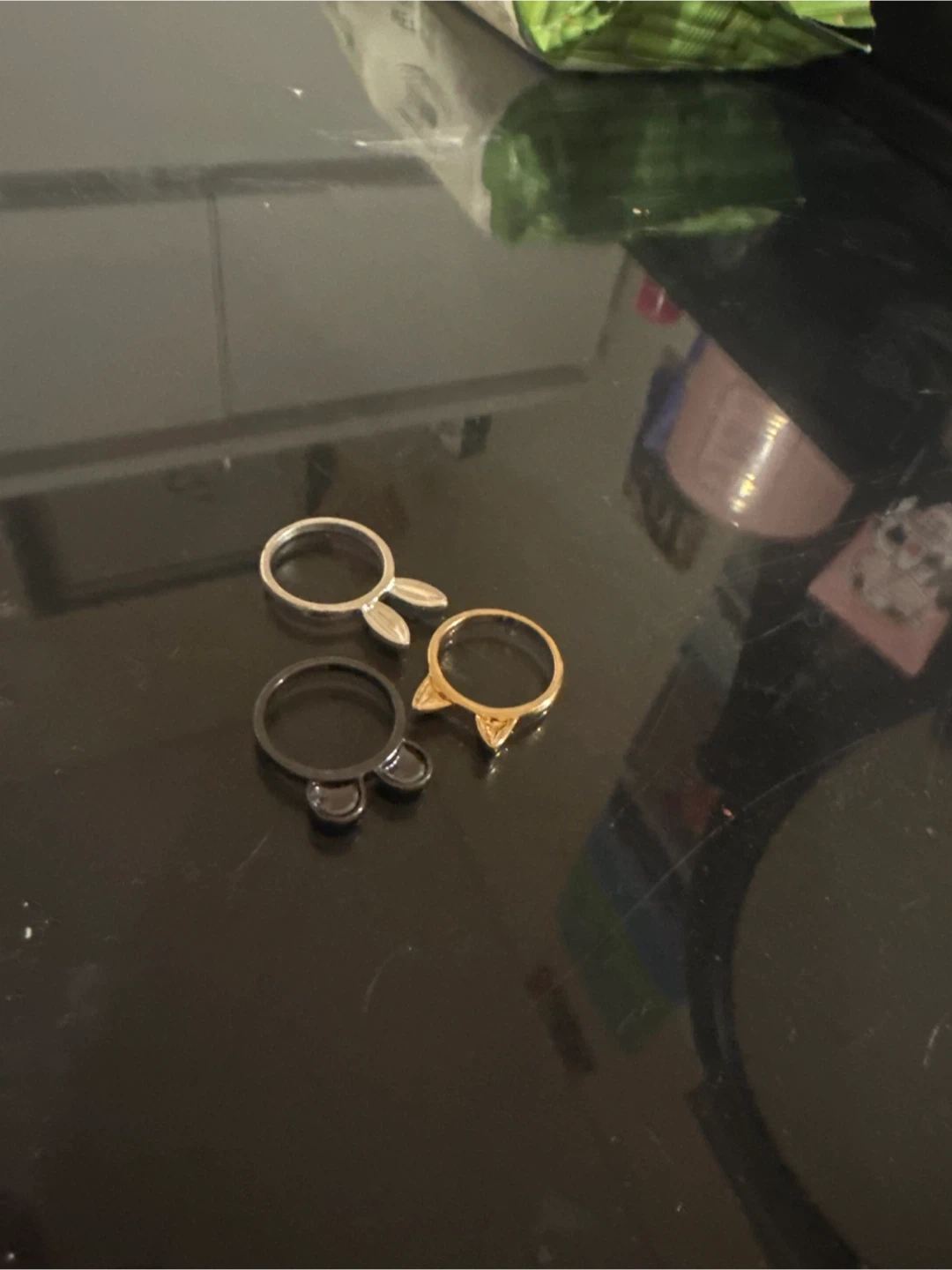 Selling a set of three adorable rings! There's a gold cat ring, a silver bunny ring, and a black Mickey Mouse ring. They're super cute and in great condition!