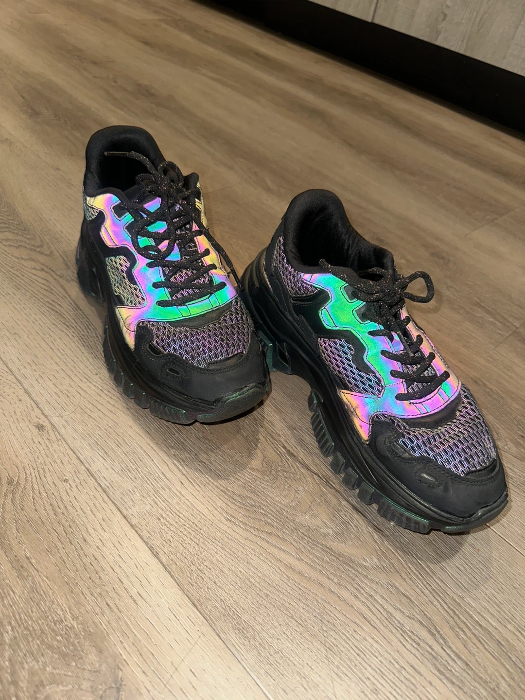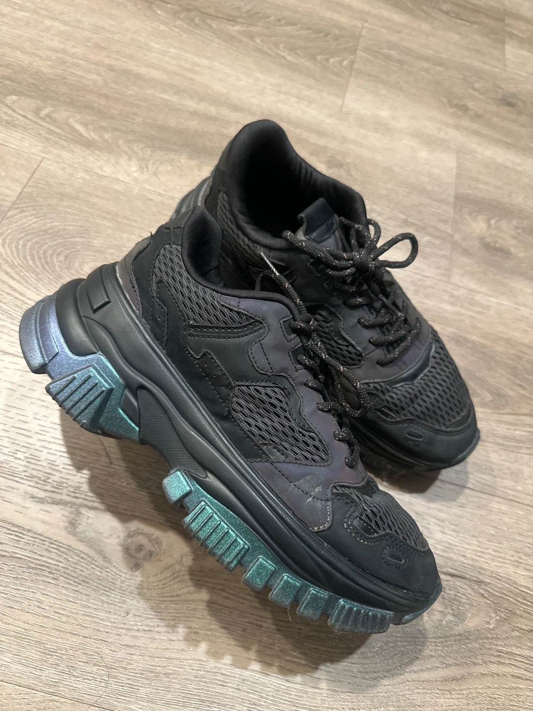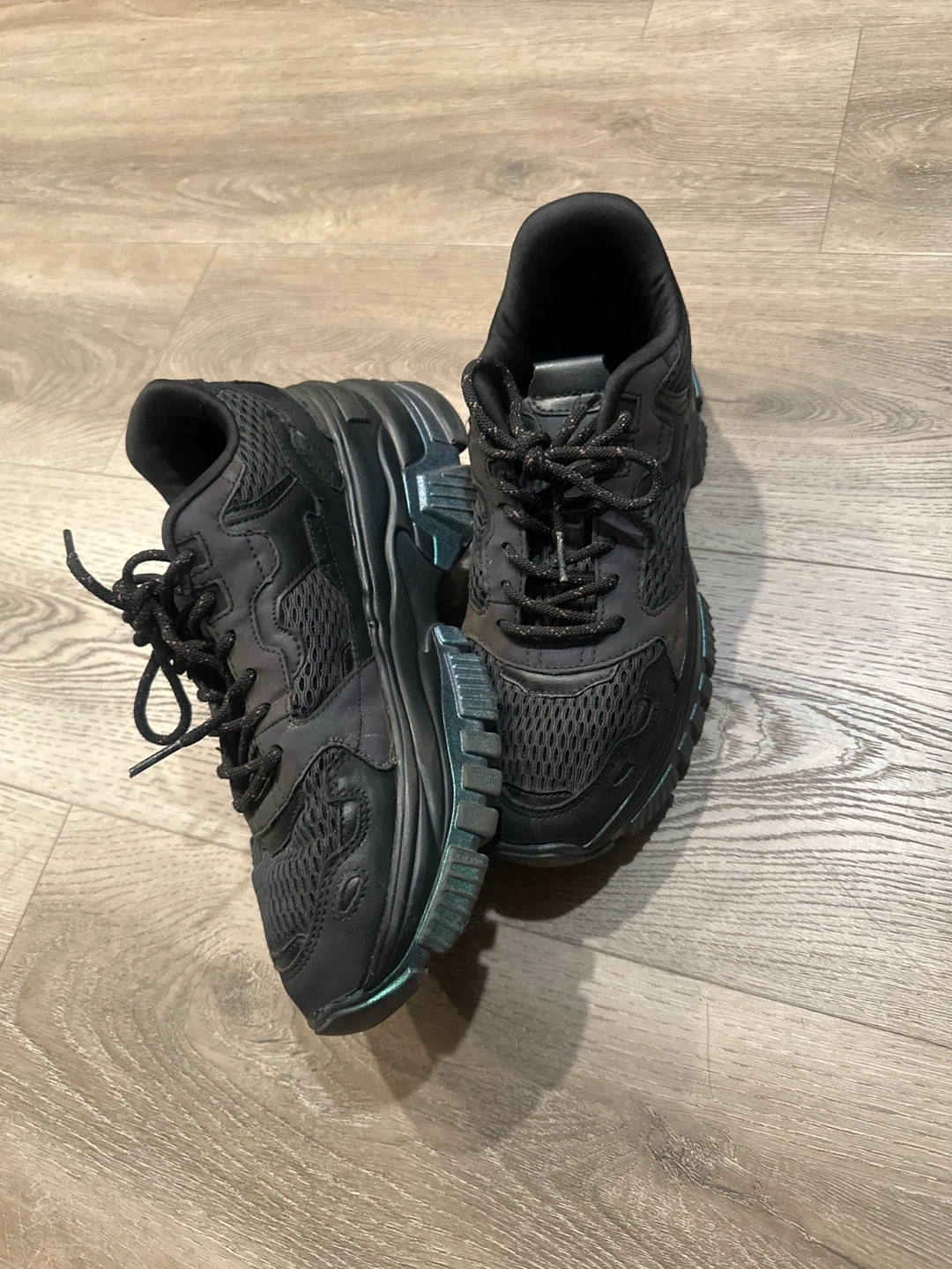 These are some cool black chunky sneakers! They have a unique iridescent detail on the soles and accents, giving them a bit of extra flair.