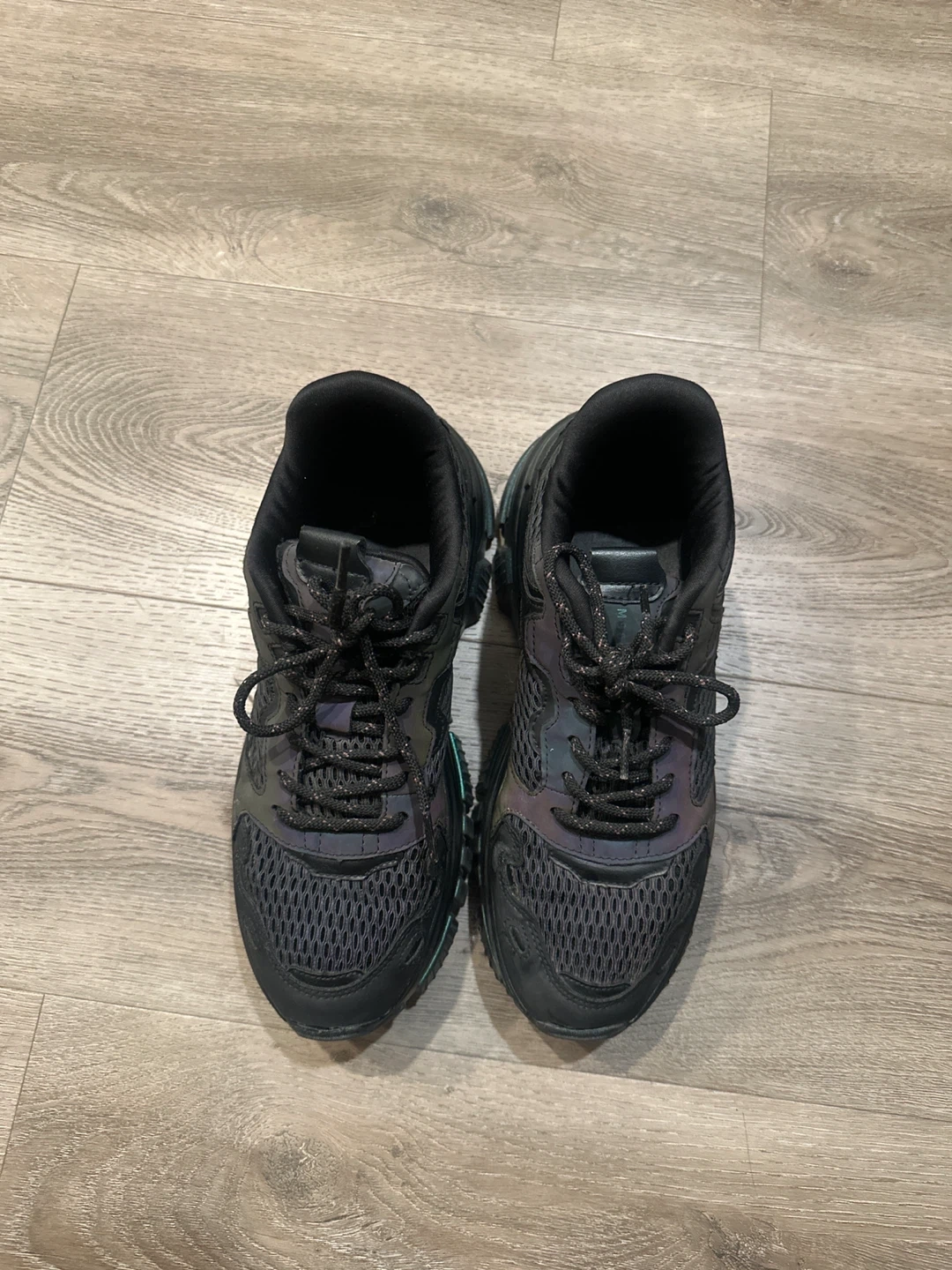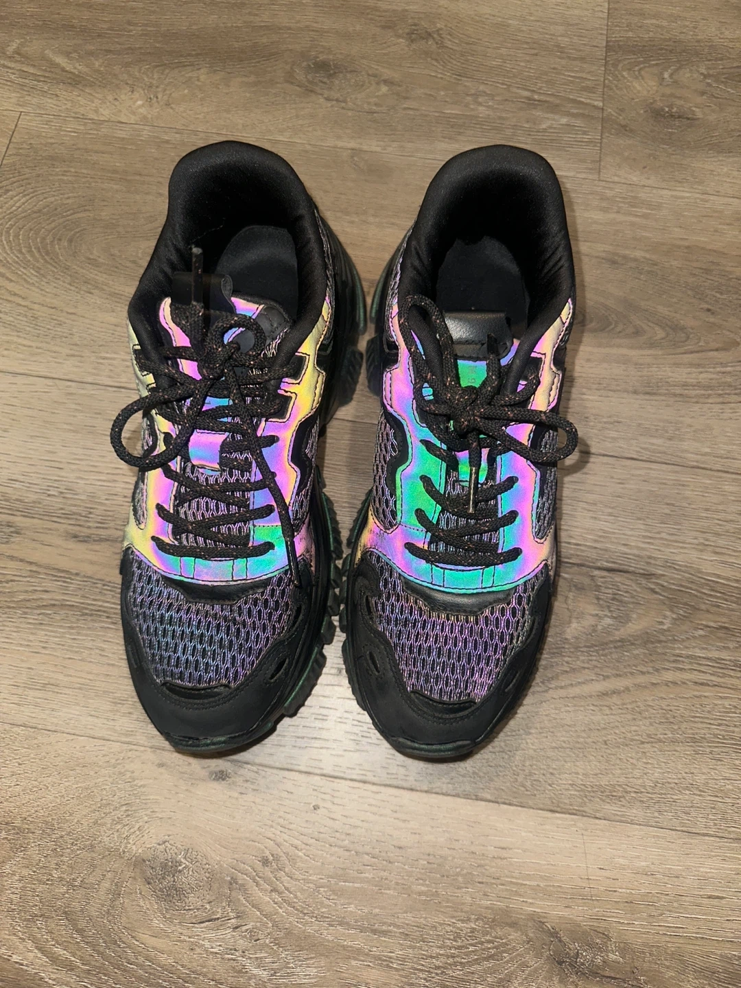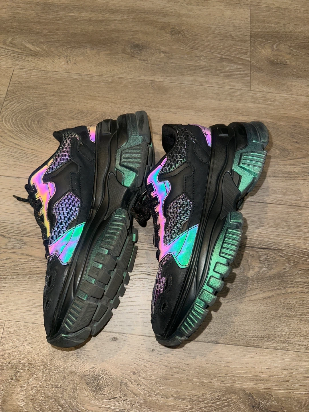 These are some cool black chunky sneakers! They have a unique iridescent detail on the soles and accents, giving them a bit of extra flair.