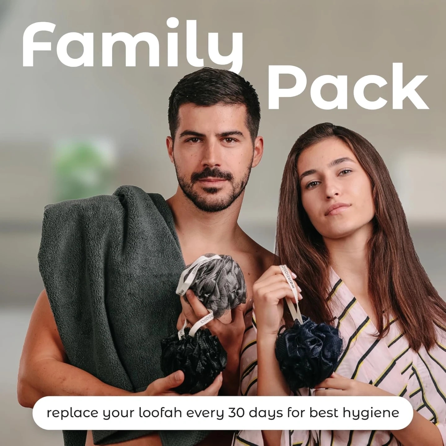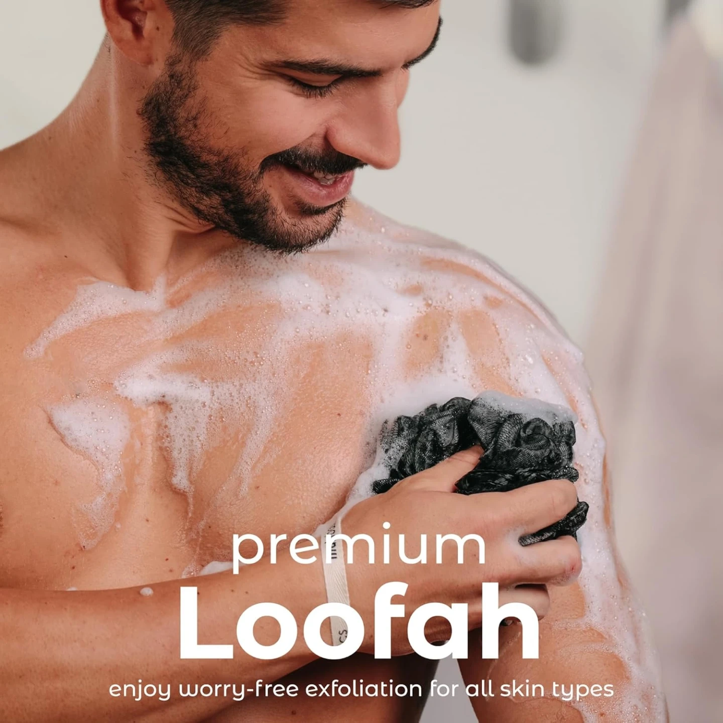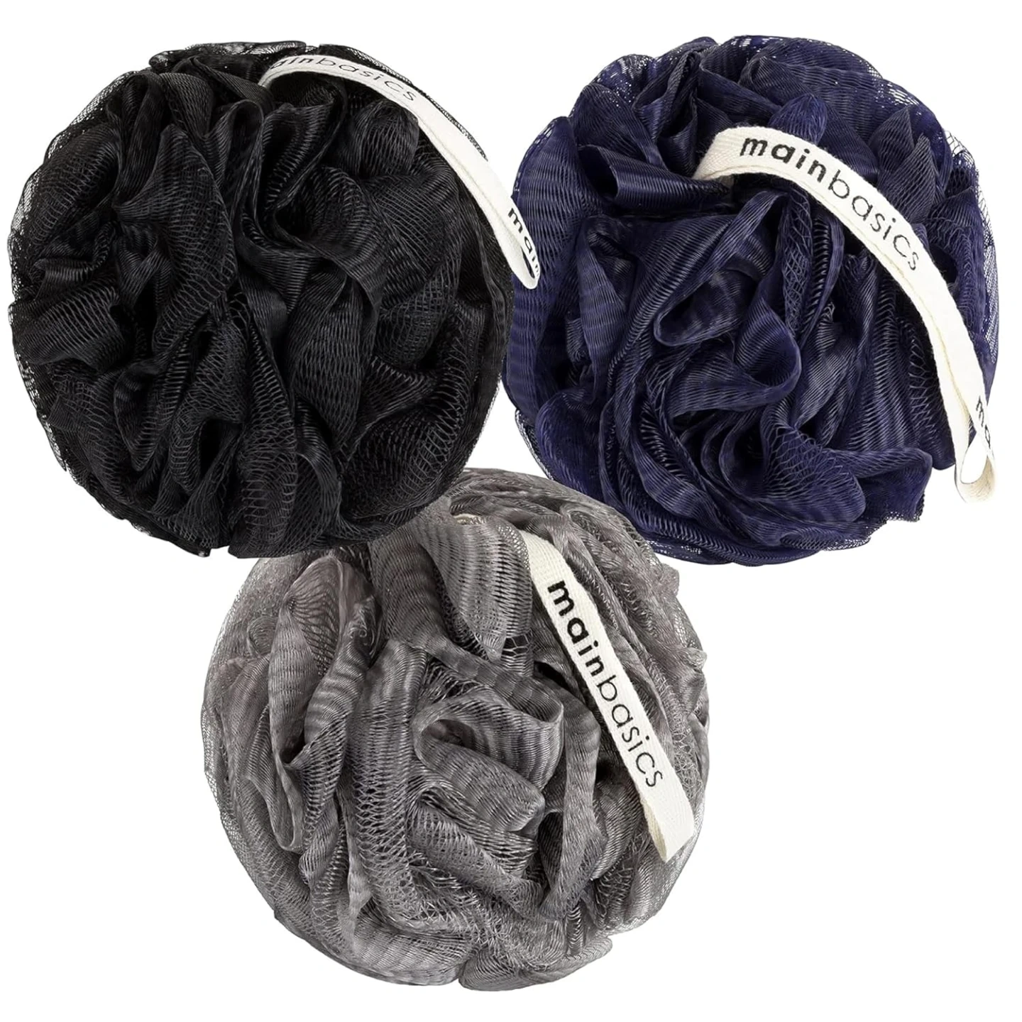 MainBasics Bath Shower Loofah Sponge Pouf Body Scrubber Exfoliator Body Wash Sponge (Set of 3, Black Ice)