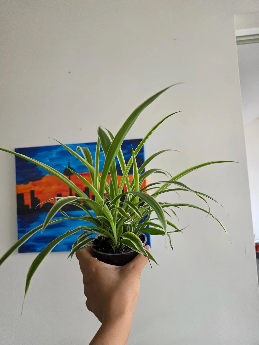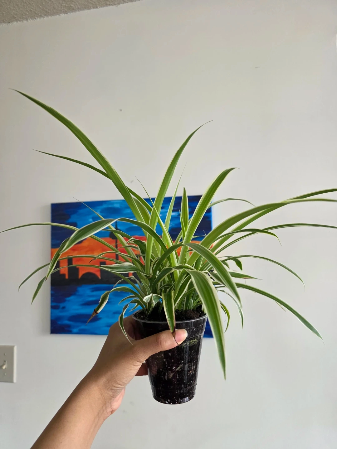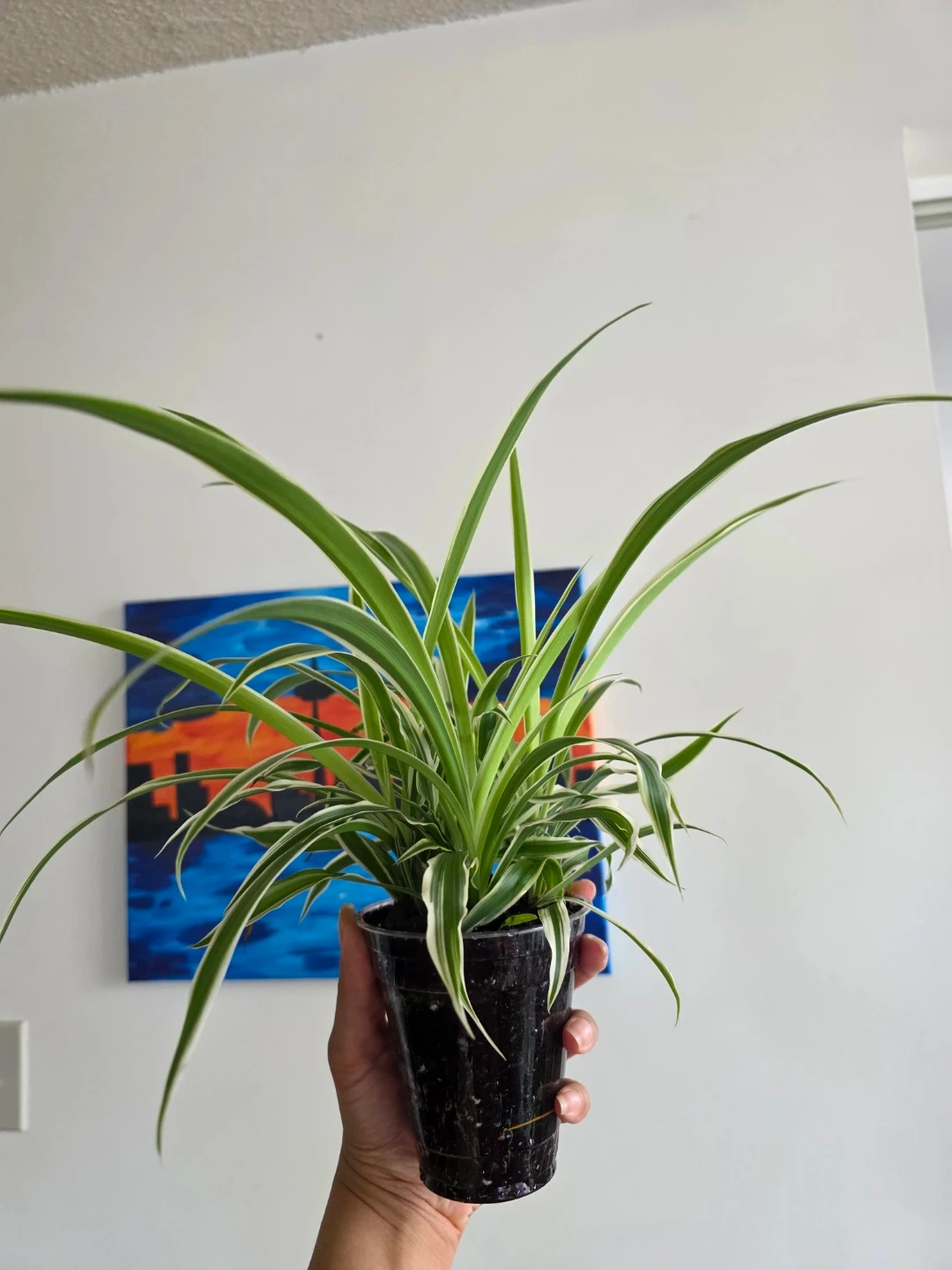 Selling a medium sized spider plant in a small clear plastic pot. It's perfect for adding a touch of greenery to your space.