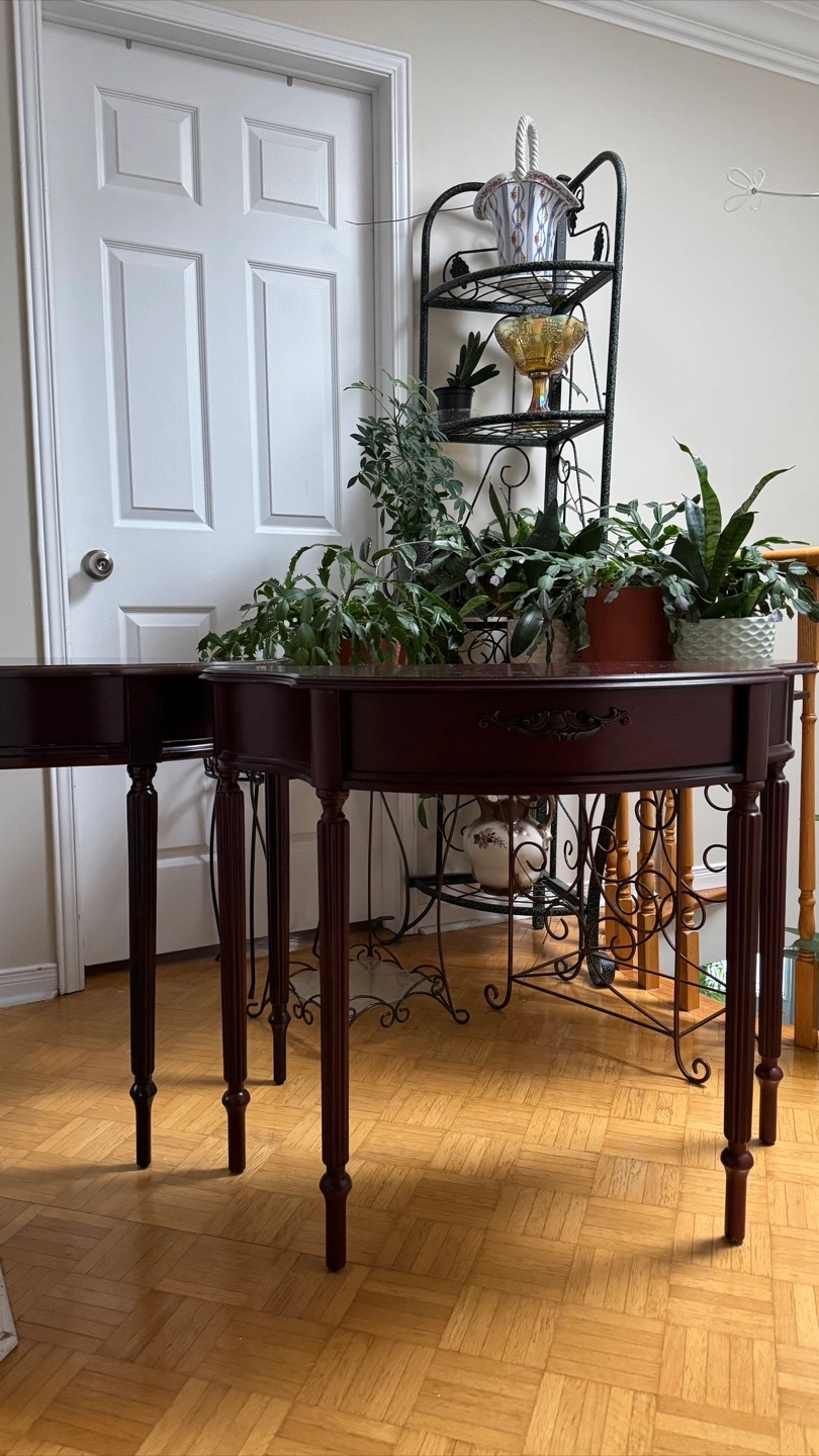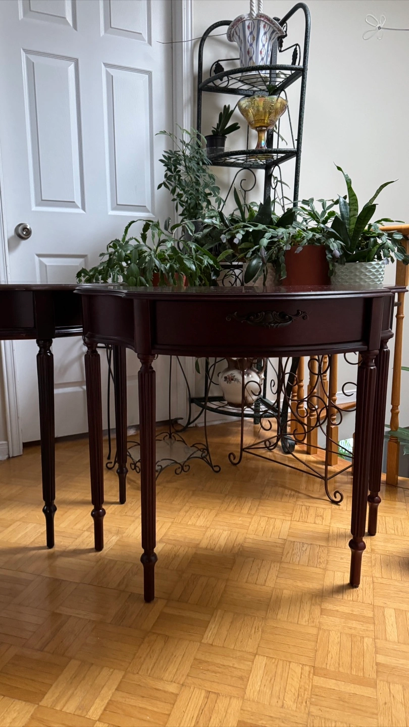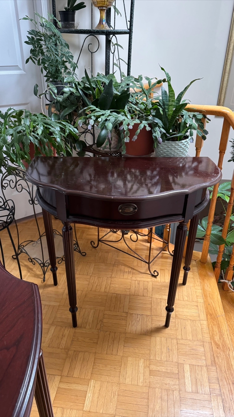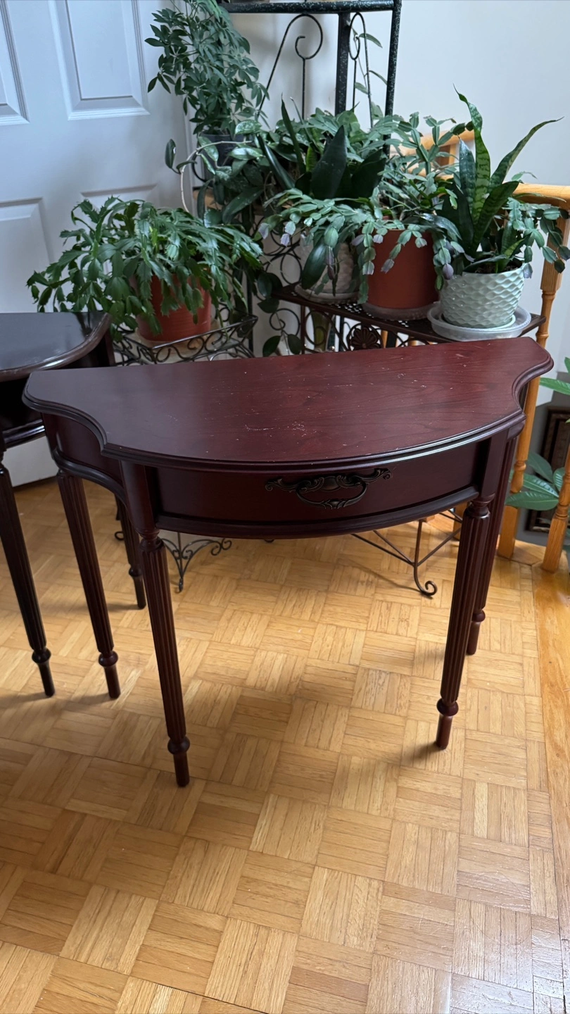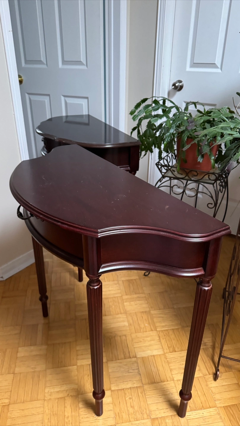 Selling a pair of dark red, half-moon shaped entryway tables. They have a classic design with a small drawer. Perfect for adding a touch of elegance to your entryway or hallway!