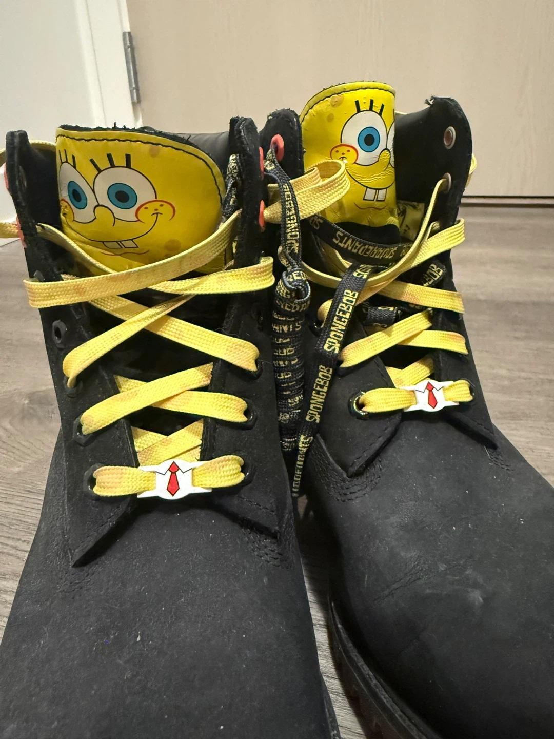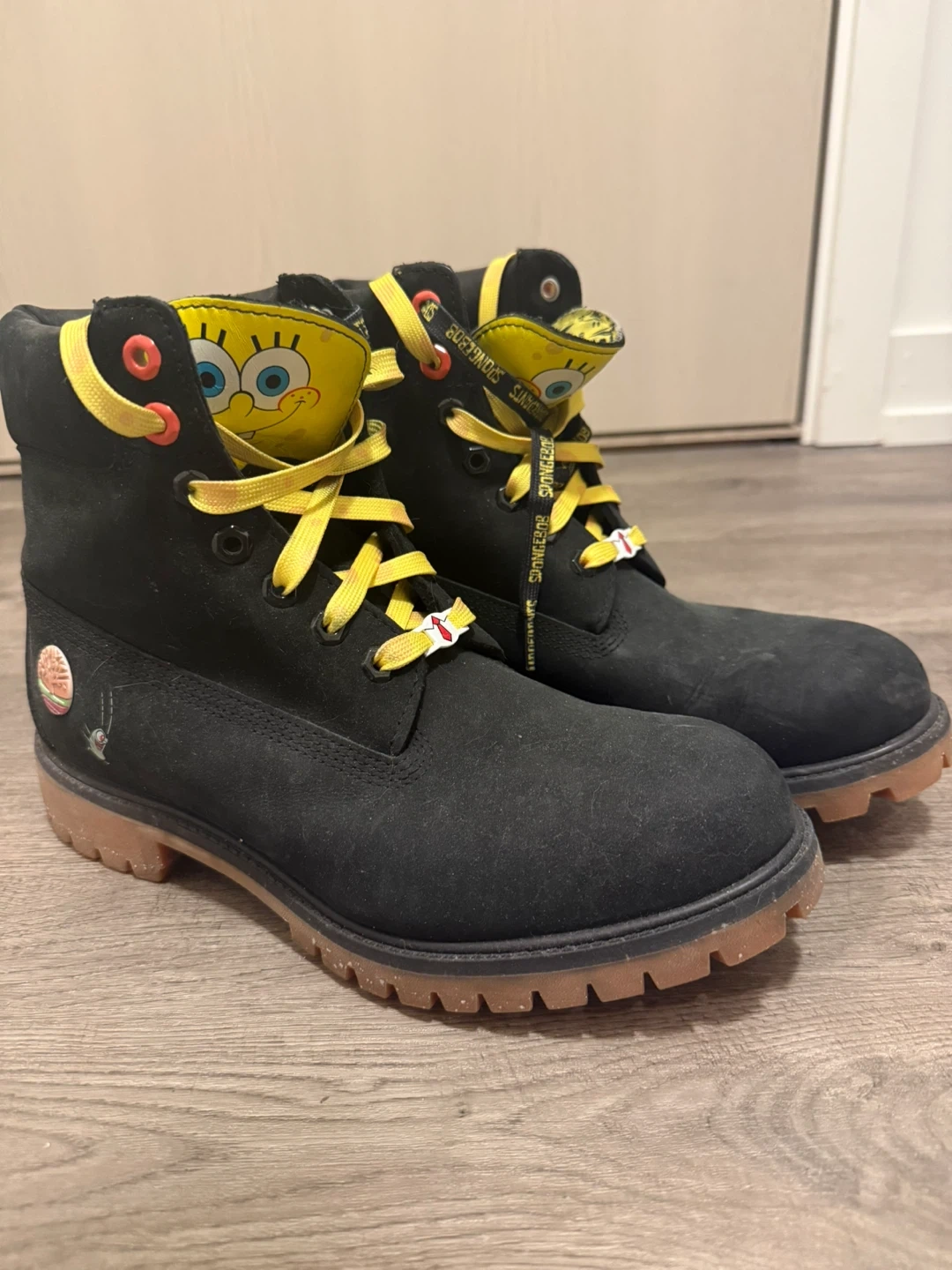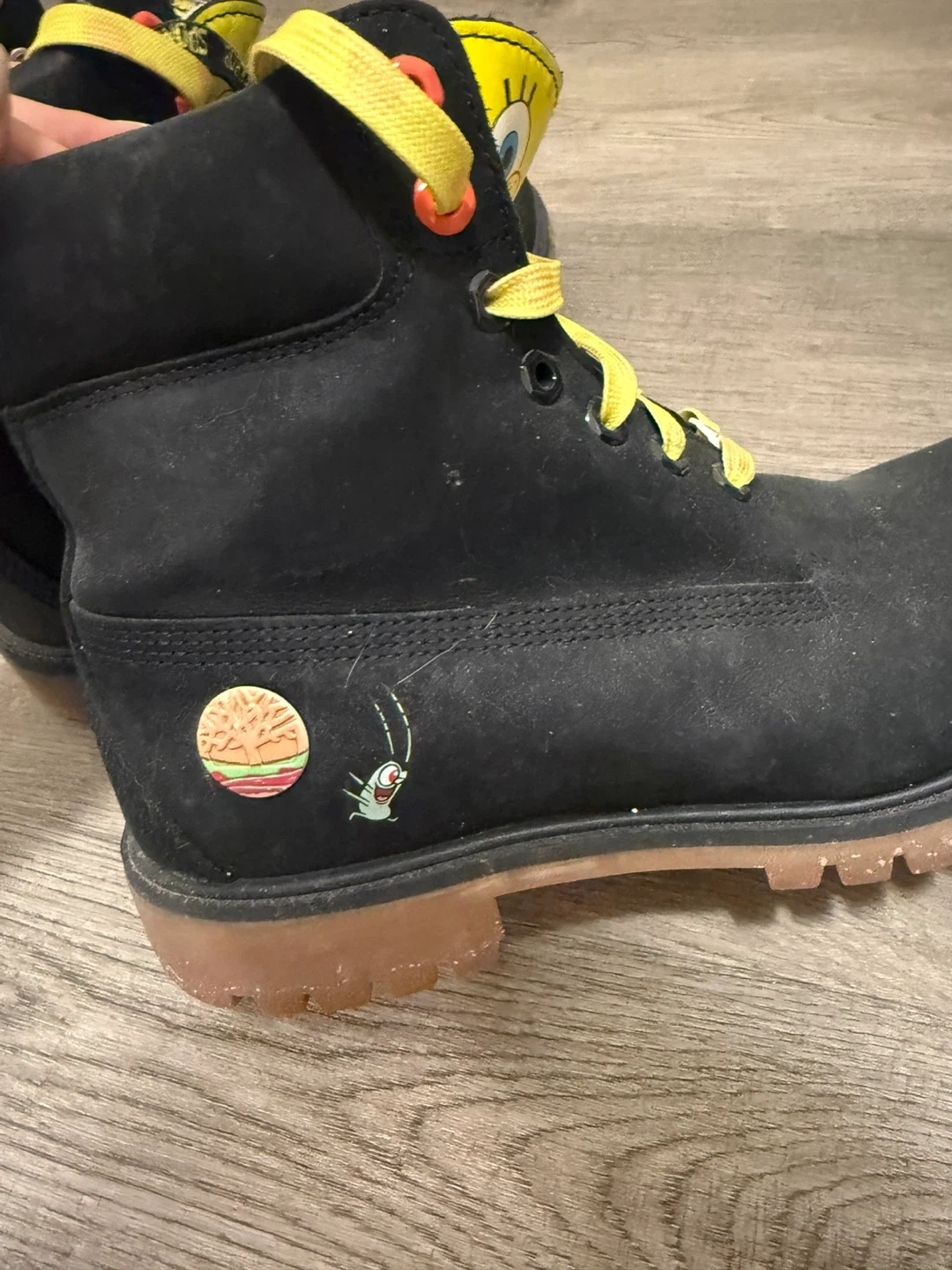 Selling a pair of Timberland boots with a Spongebob design! They are a US size 10. The boots are black with yellow laces and Spongebob details. They're in great condition and ready for a new owner