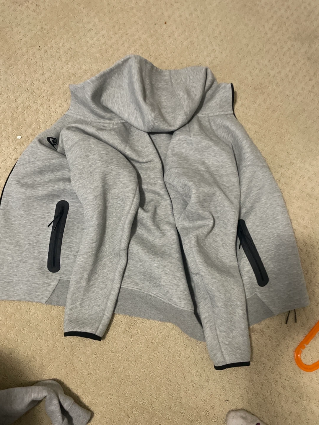 Selling a Nike Tech Fleece hoodie in grey, size medium. It's in great condition and ready for a new owner! authentic, im only selling it because i’ve grown out of it.