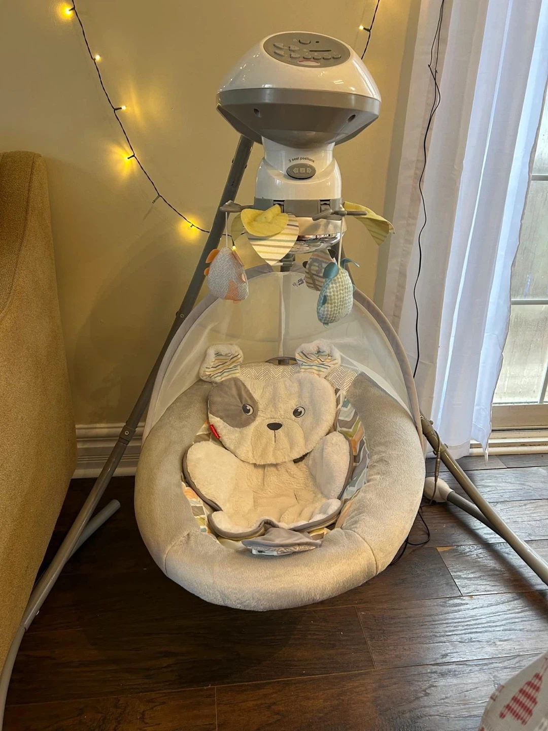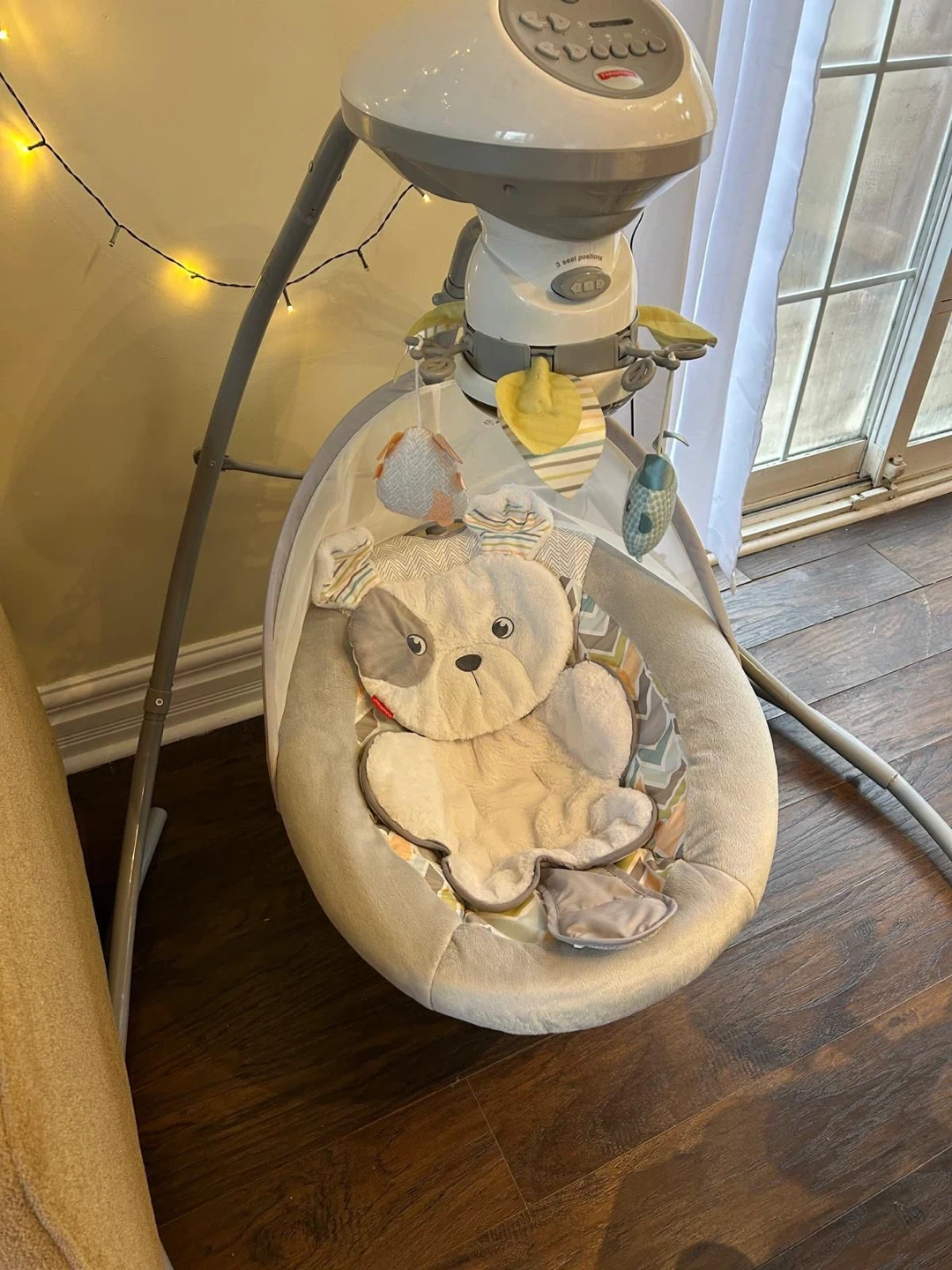 Selling a Fisher-Price baby swing in great condition! This swing has a cute dog design and hanging toys to keep your little one entertained. It's perfect for soothing and relaxing your baby.
