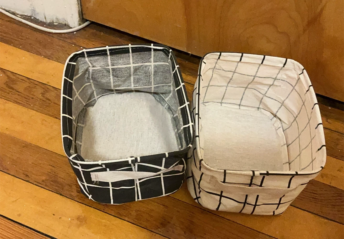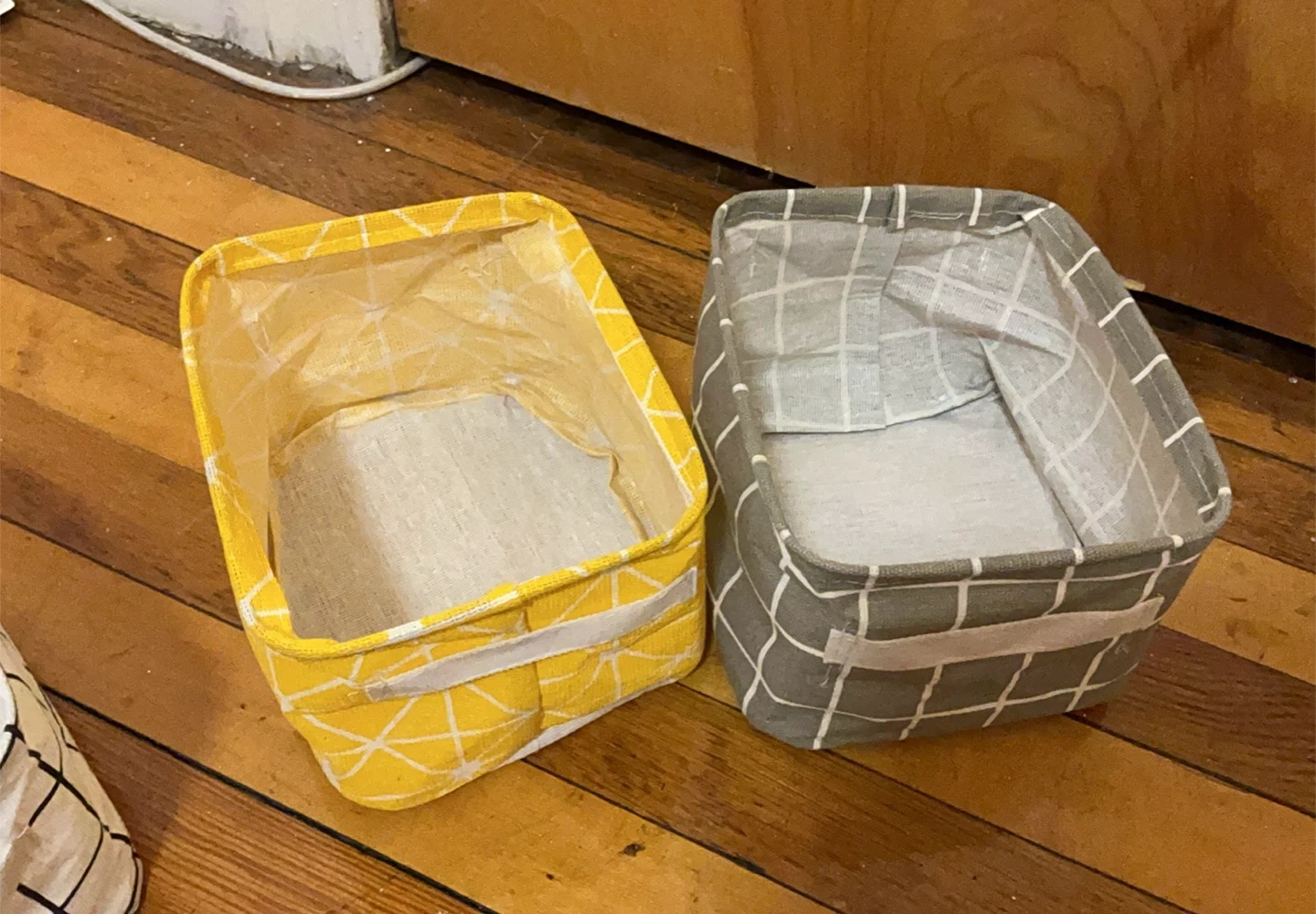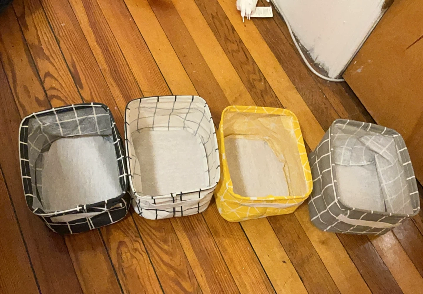 Selling a set of four fabric storage baskets! They come in black, white, yellow, and gray with a grid pattern. Perfect for organizing your space!