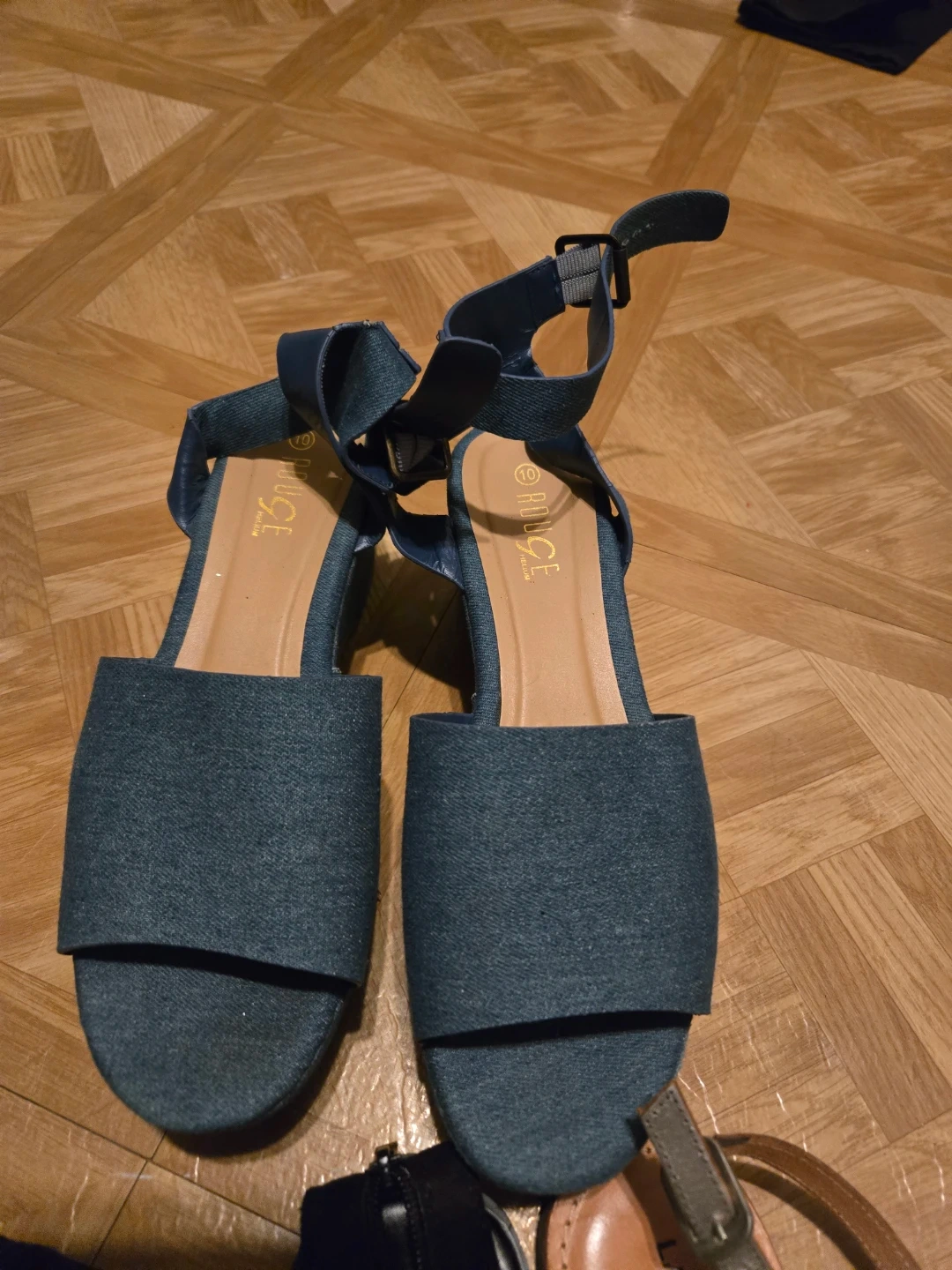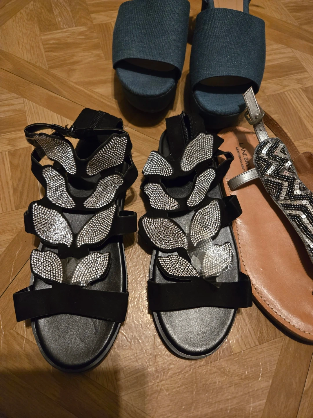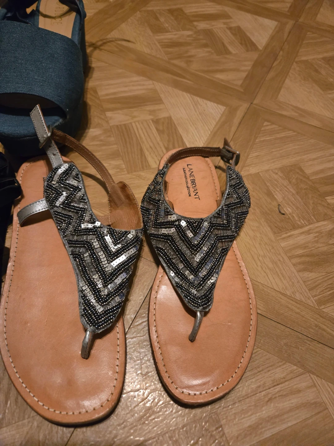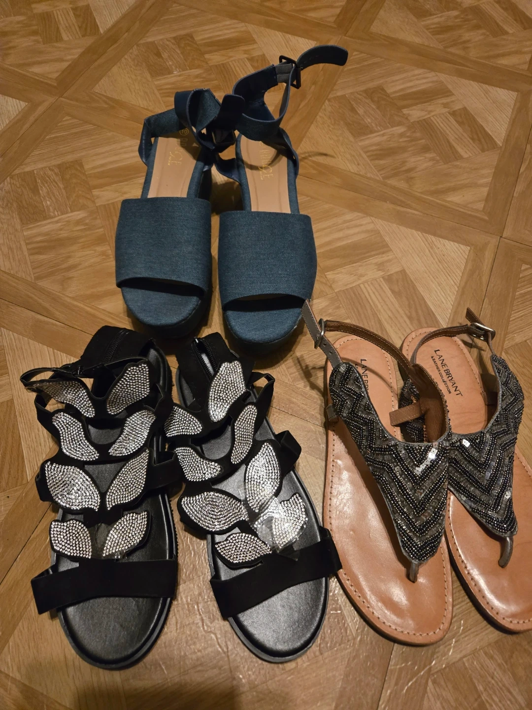 Selling a set of sandals including a pair from Lane Bryant and H Halston. The Lane Bryant sandals are a tan color with silver and black beaded embellishments. The H Halston sandals are a blue denim color.