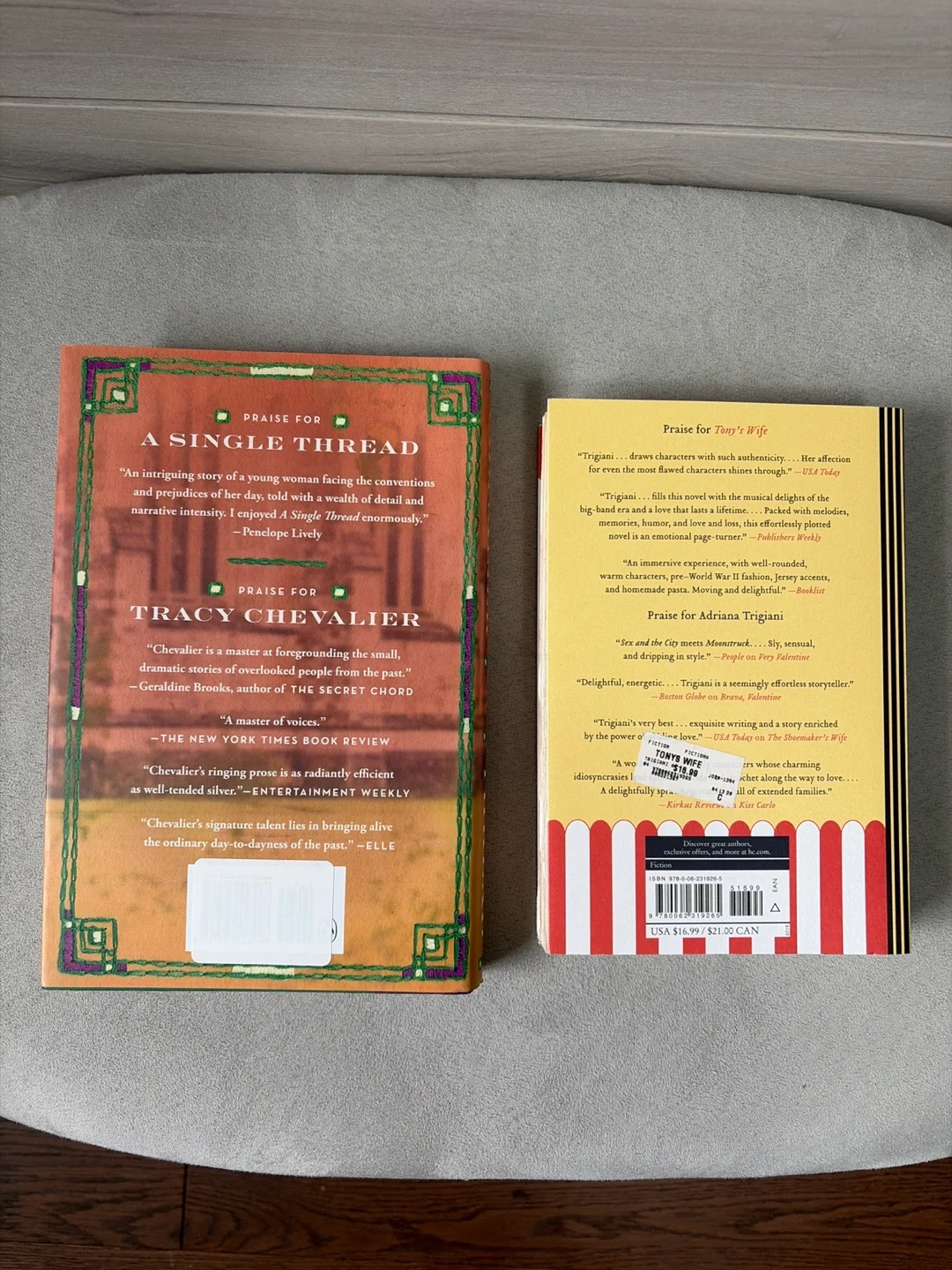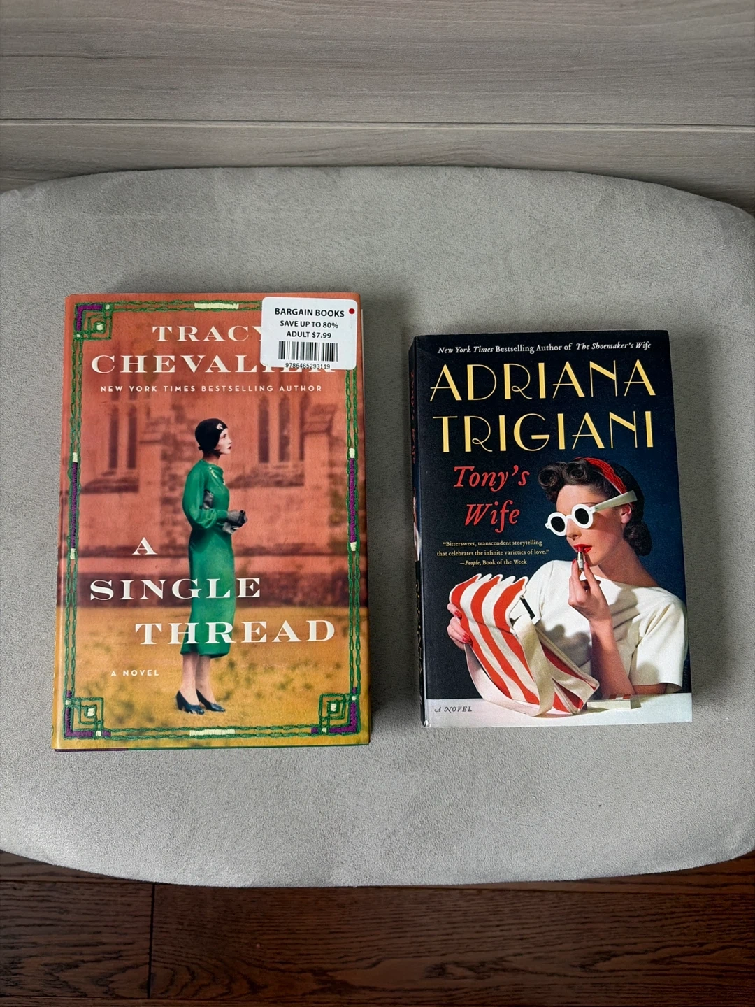 Selling two historical fiction novels: A Single Thread by Tracy Chevalier and Tony's Wife by Adriana Trigiani. Both are new and ready for a new reader!