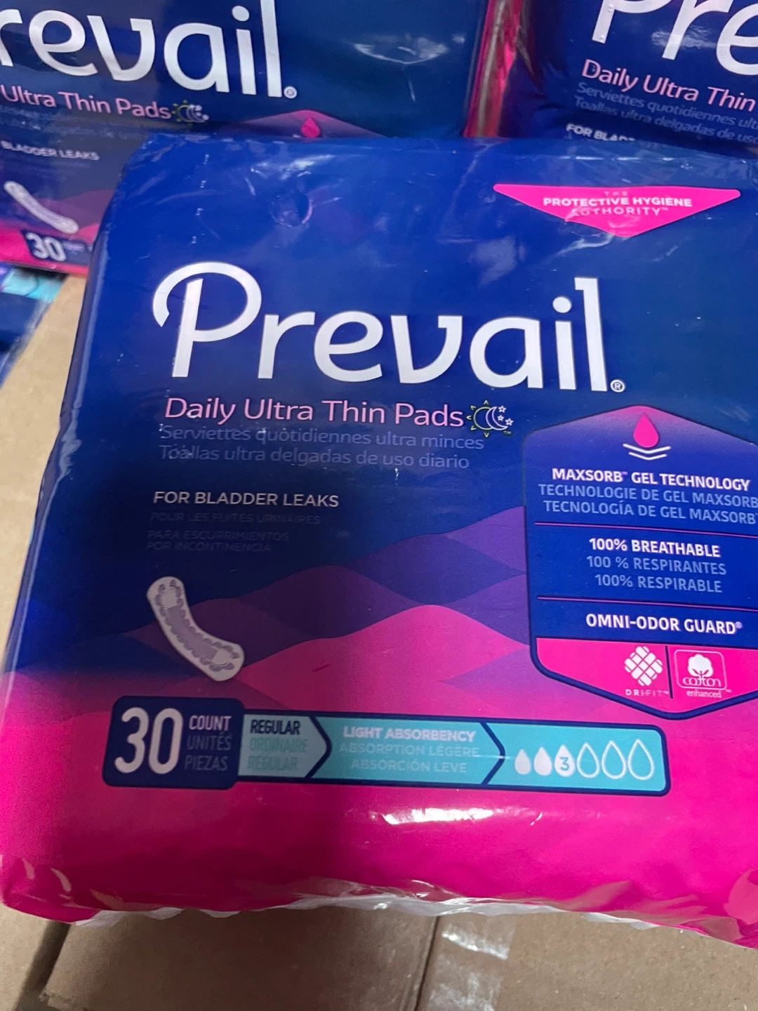 Selling 12 packages of Prevail Daily Ultra Thin Pads. These are designed for bladder leaks and come in a pack of 30. They feature MaxSorb Gel Technology and are 100% breathable with Omni-Odor Guard for added protection