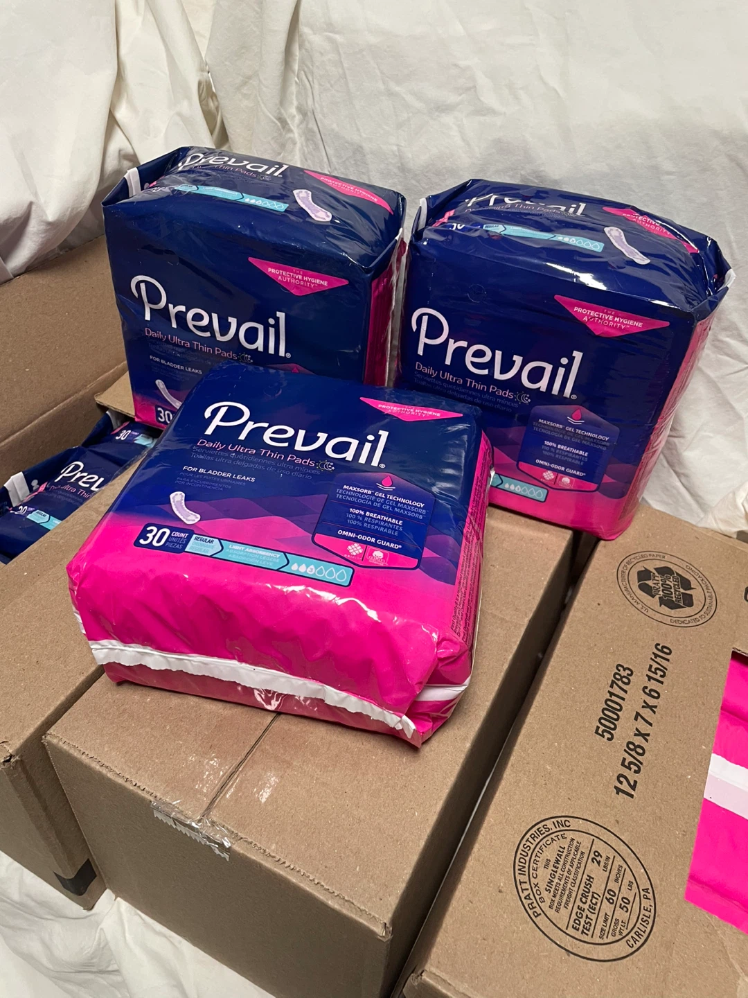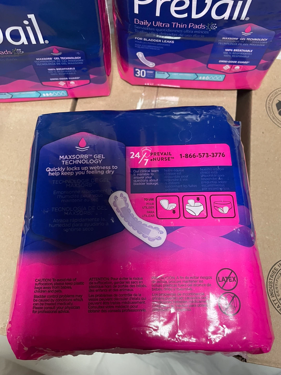 Selling 12 packages of Prevail Daily Ultra Thin Pads. These are designed for bladder leaks and come in a pack of 30. They feature MaxSorb Gel Technology and are 100% breathable with Omni-Odor Guard for added protection