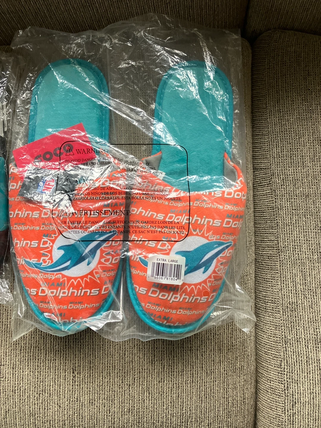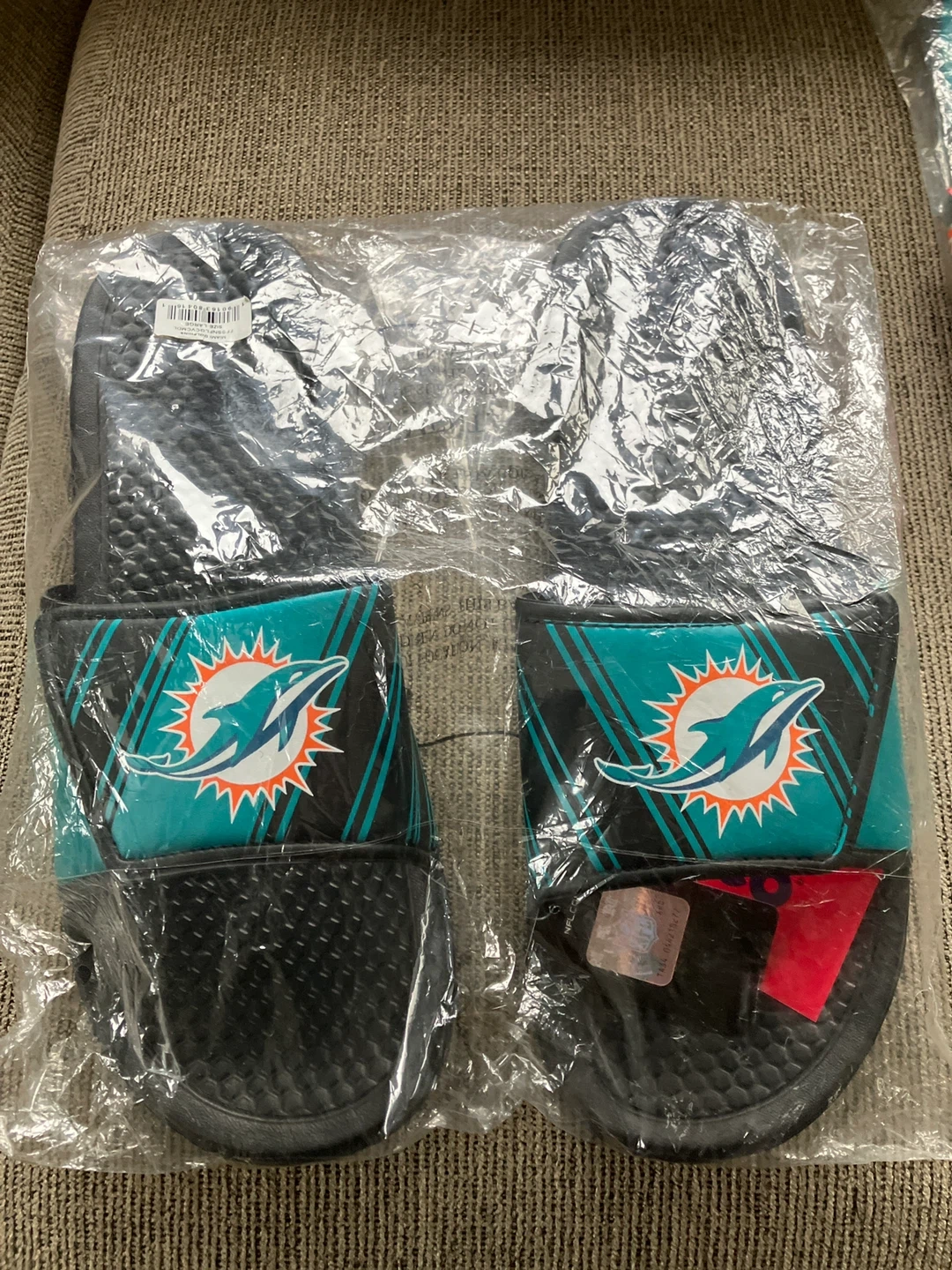 I'm selling a pair of Miami Dolphins slides and slippers, both brand new and still in their original packaging! They feature the iconic Dolphins logo and colors. Perfect for any Dolphins fan!