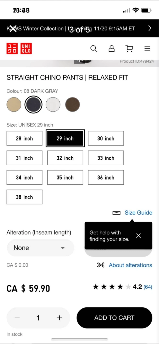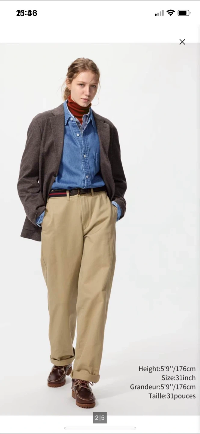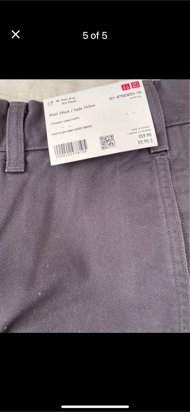 These are brand new Uniqlo Straight Chino Pants in dark gray, size 29 inch. The pants have a relaxed fit and double-besom back pockets. Originally bought for $59.90!