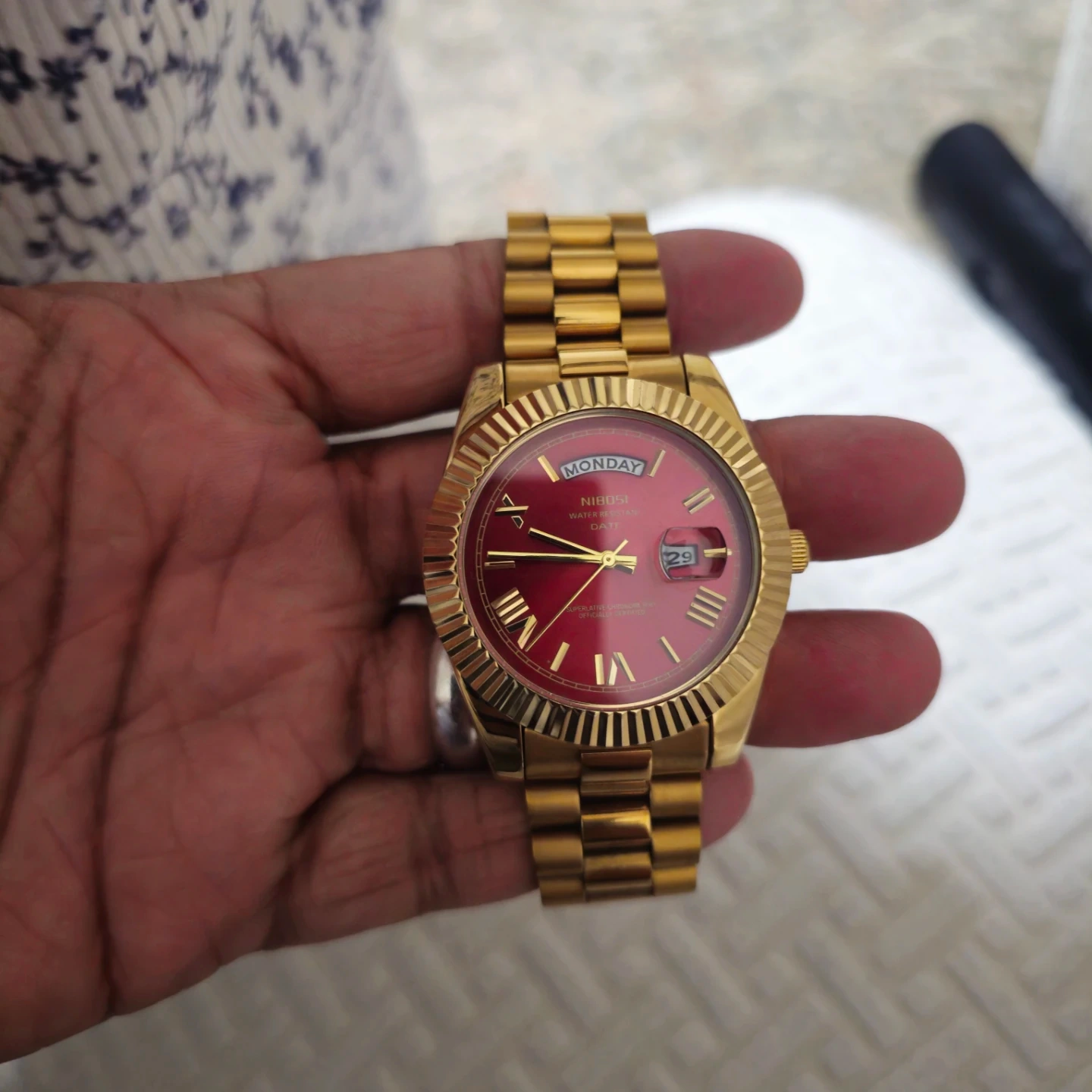 Selling a Nibosi watch with a striking red face and gold band. It shows the day and date. It's in good condition and ready for a new owner!