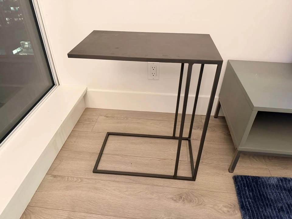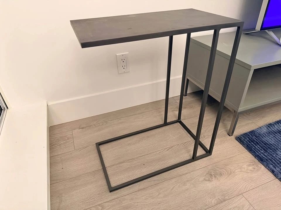 CB2 Mill C side table in excellent condition. This is a sleek, modern C-shaped accent table designed to slide easily under a sofa or chair, making it perfect as a side table, laptop table, or compact workspace surface.