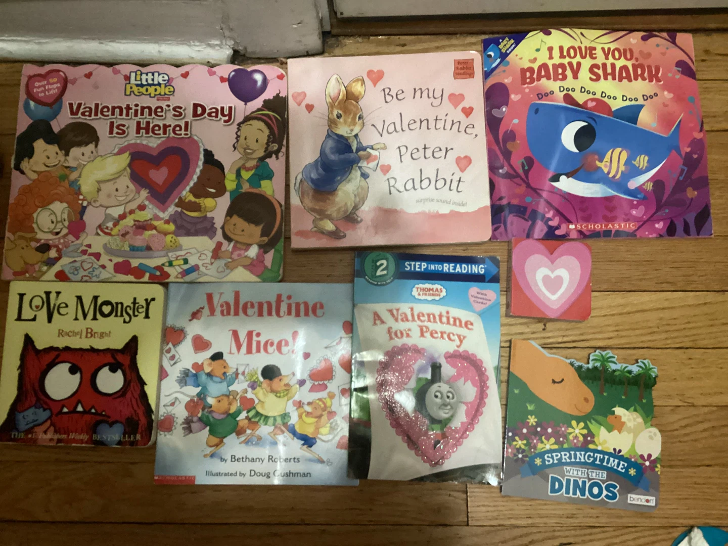 This is a collection of six children's books perfect for Valentine's Day. Titles include 'Little People: Valentine's Day Is Here!', 'Be My Valentine, Peter Rabbit', 'I Love You, Baby Shark', 'Love Monster', 'Valentine Mice!', and 'A Valentine for Percy'. Also included is 'Springtime with the Dinos'.