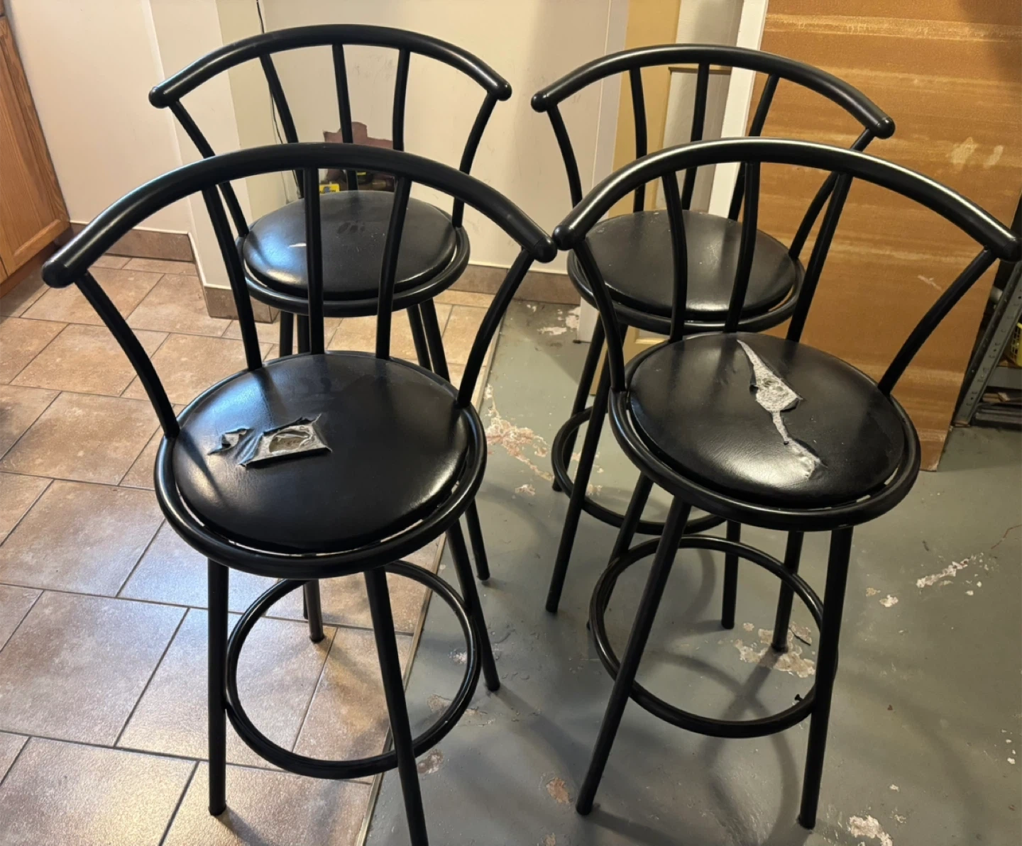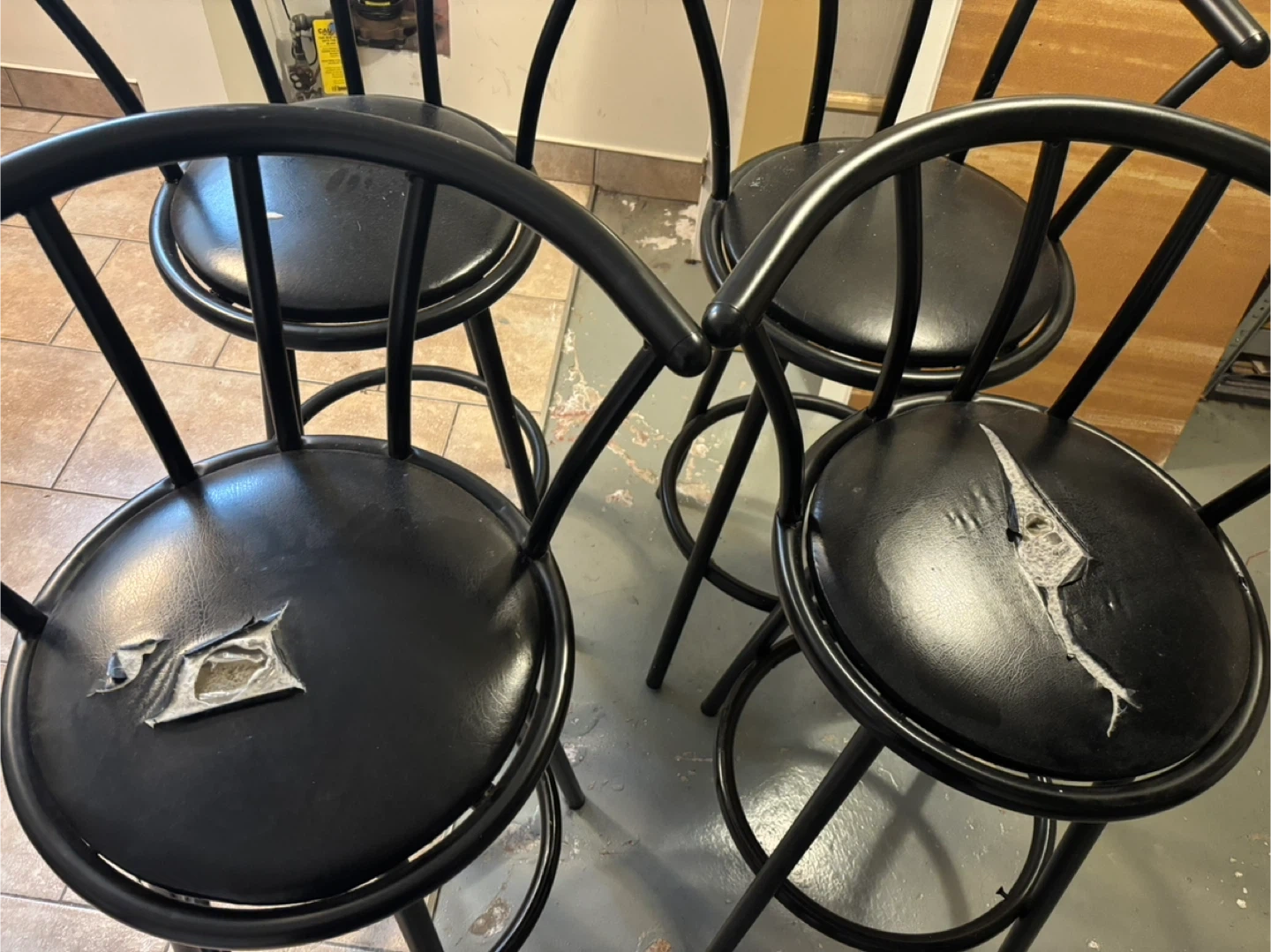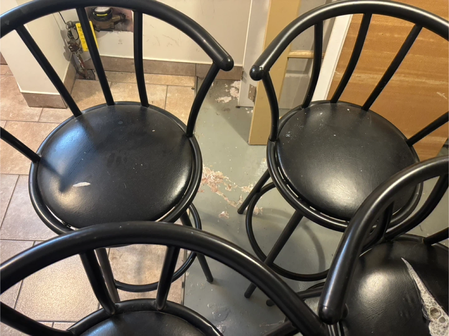 Selling a set of four black bar stools. They have some wear and tear on the seats, as shown in the photos. Selling as is. But they still have plenty of life left for casual use after reupholstered Great for a kitchen island or bar area!