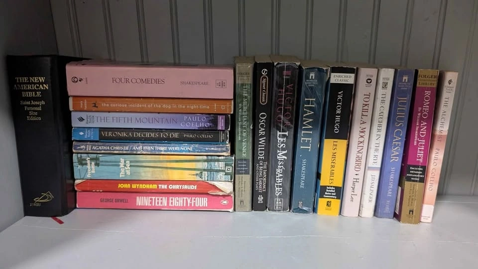 Selling a mixed collection of books in good to fair condition. Includes a variety of classics, fiction, and non-fiction titles from well-known authors such as Shakespeare, George Orwell, Paulo Coelho, Oscar Wilde, Victor Hugo, Bill Bryson, Robert Greene, Seth Godin, and more.