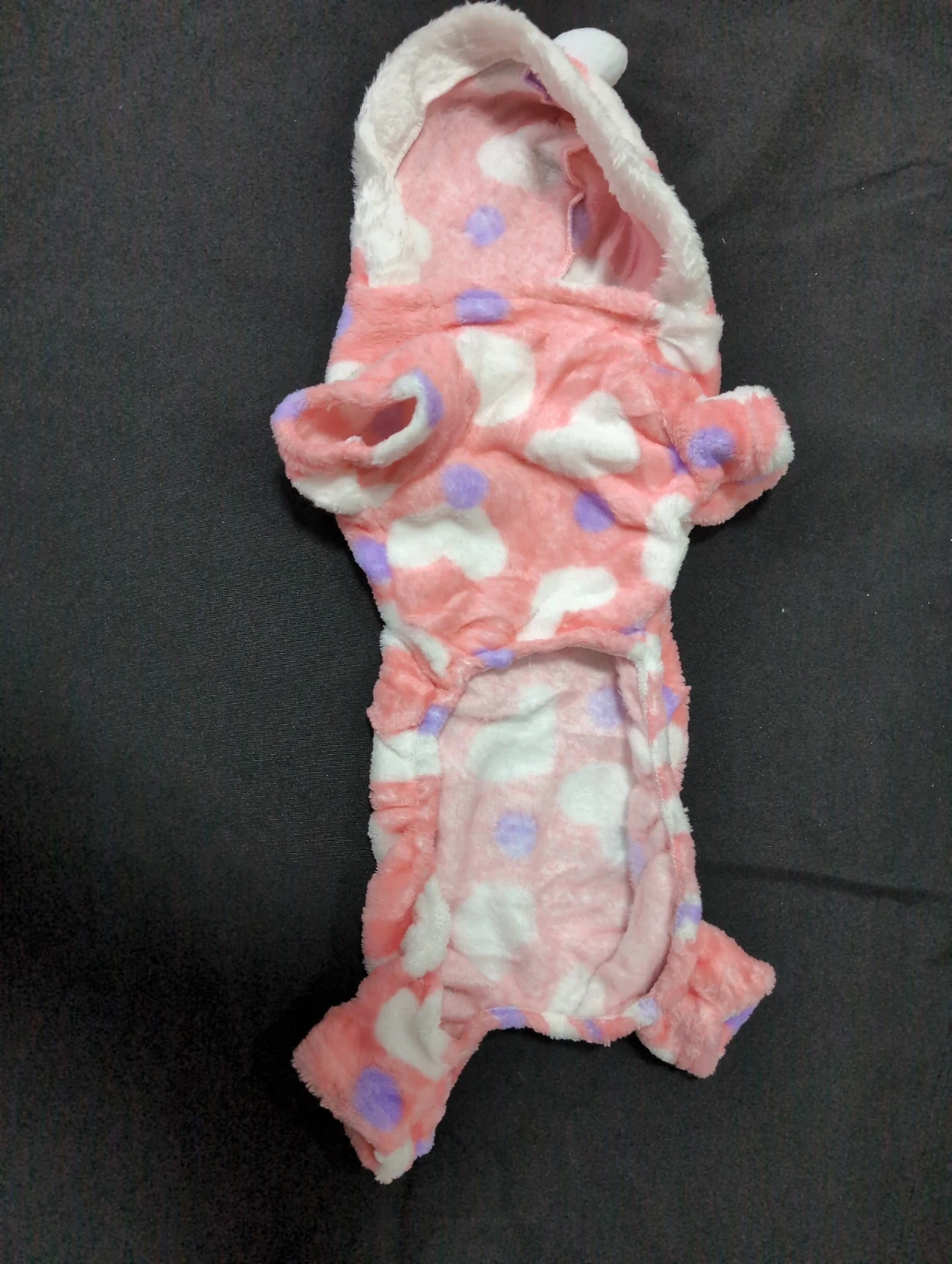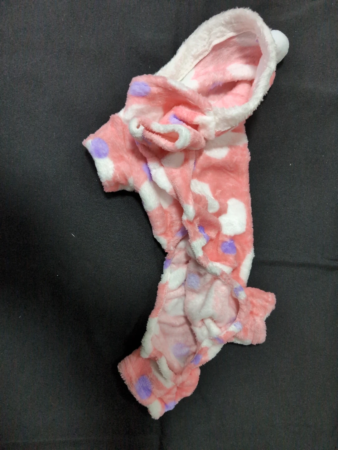 This adorable dog onesie is perfect for keeping your furry friend warm and cozy! It features a cute hood and a soft, plush material with a pink and white pattern. It looks to be in great condition and ready for a new pup to enjoy. Choice of size XL (front legs to butt 14") and L(front legs to butt 11" ), plus 5 color patterns.