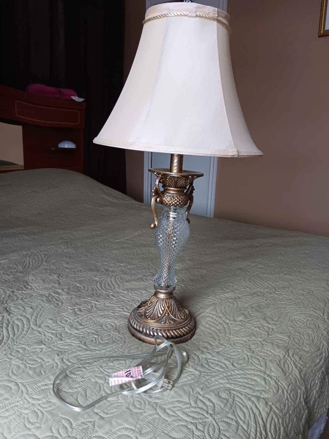 Selling a lovely accent table lamp. It features a cream-coloured shade and a decorative glass and gold-tone base. It would be a great addition to any room!