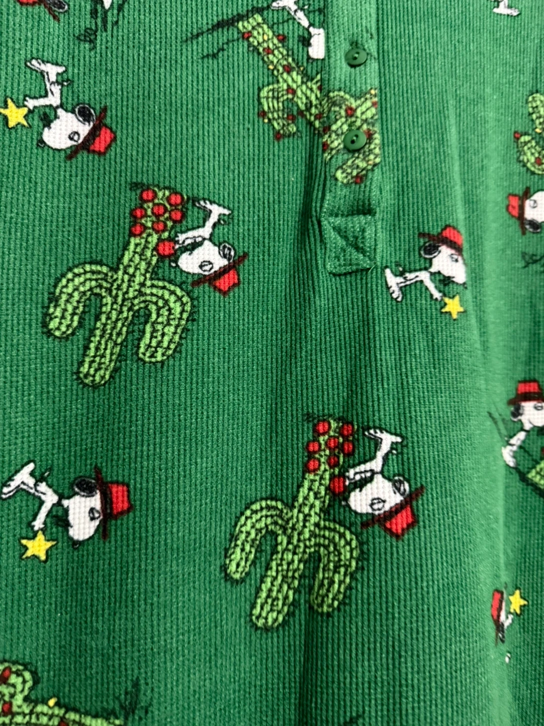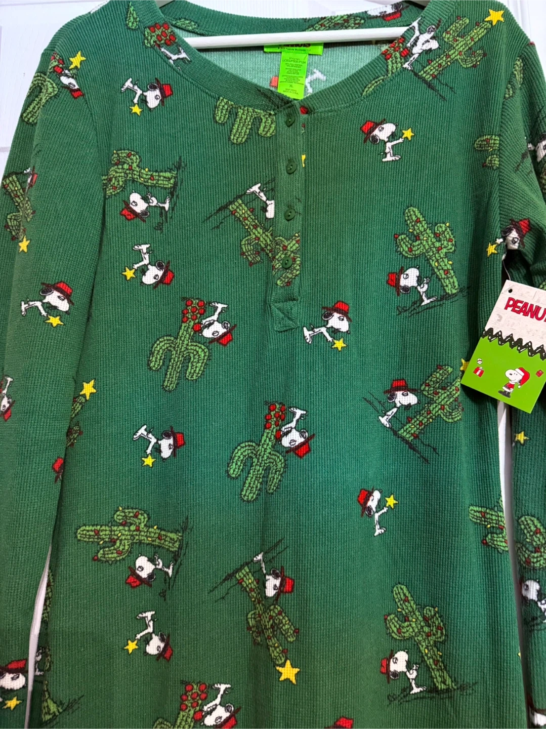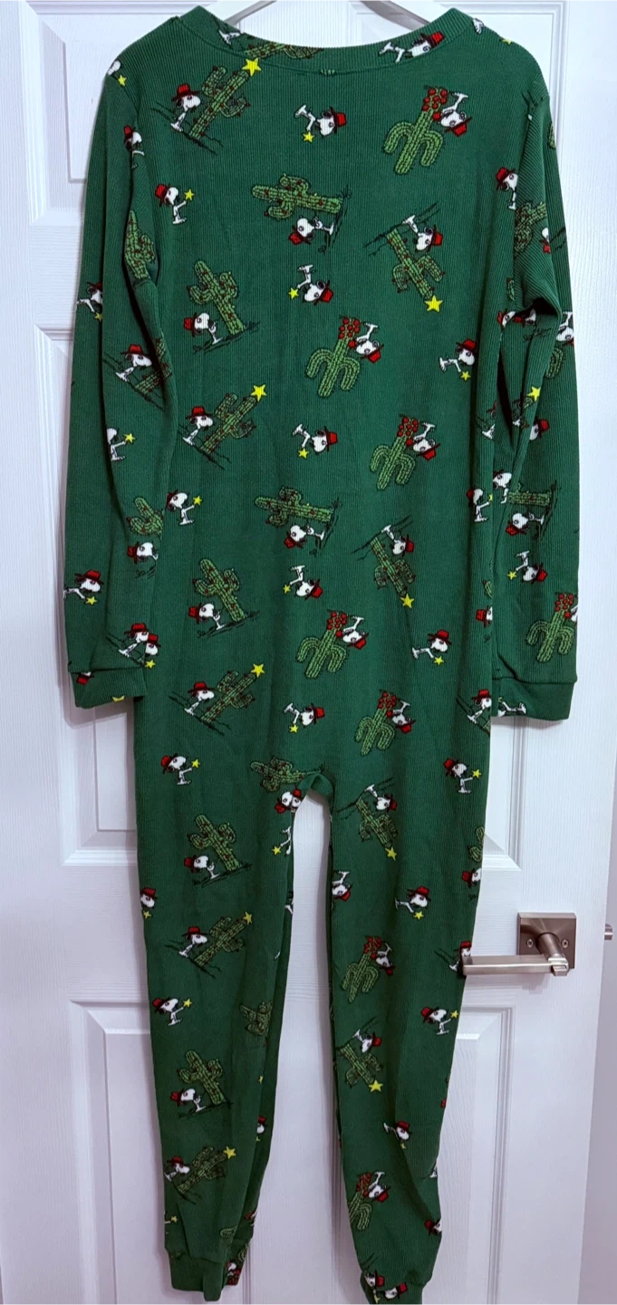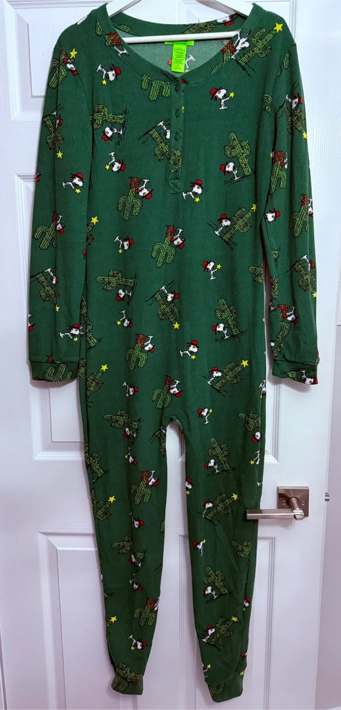 This is a brand new Peanuts onesie! It's green with a cute Snoopy and cactus pattern. Size is XL. The tag says © 2025 Peanuts Worldwide LLC, so it's a recent design!