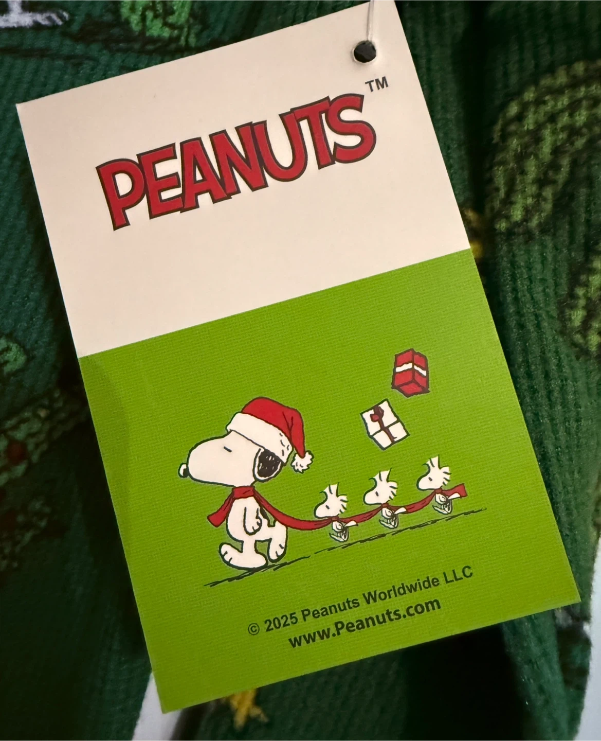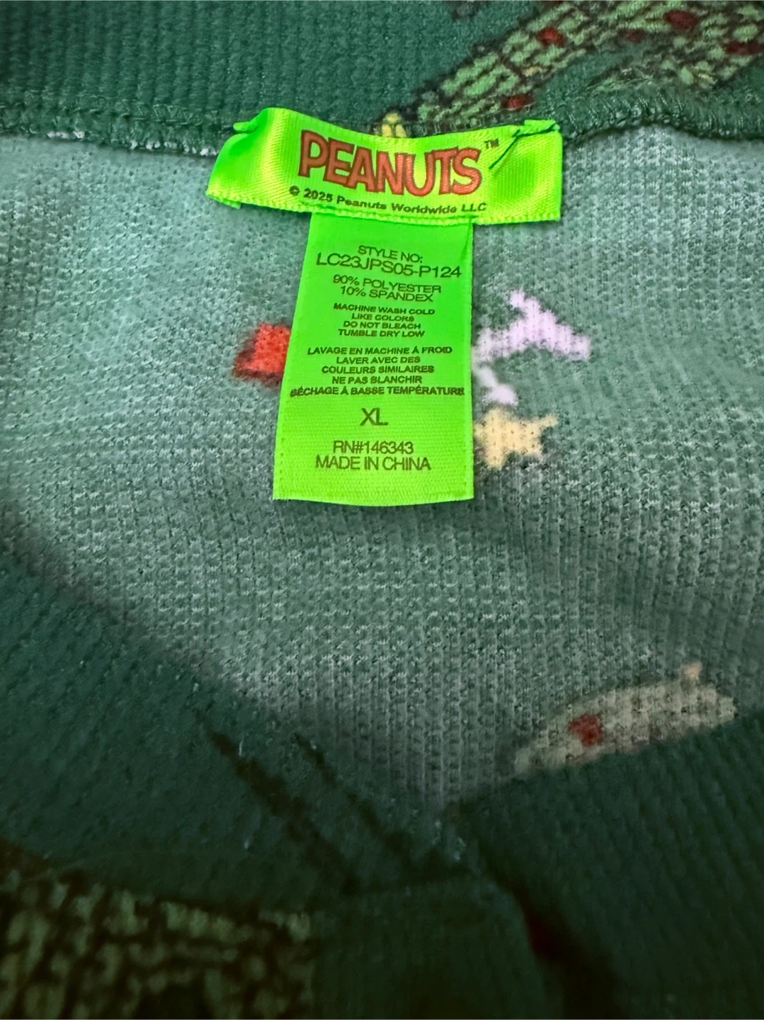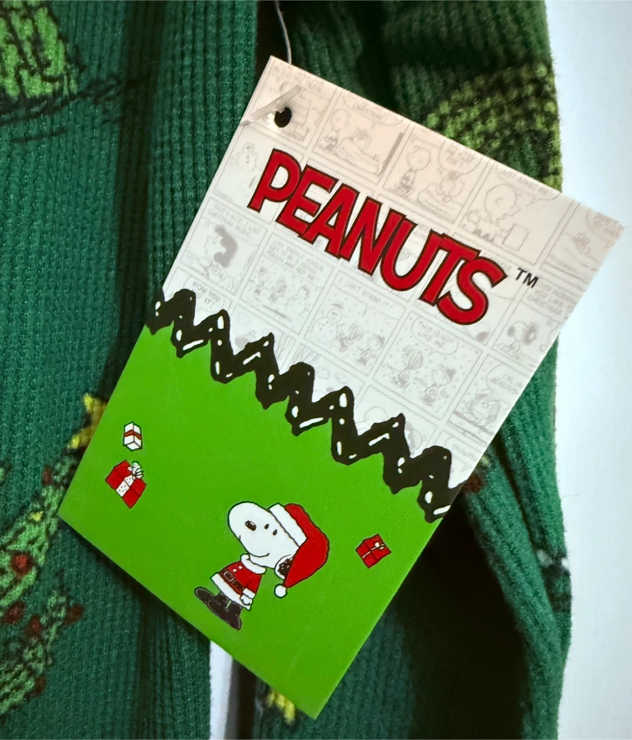 This is a brand new Peanuts onesie! It's green with a cute Snoopy and cactus pattern. Size is XL. The tag says © 2025 Peanuts Worldwide LLC, so it's a recent design!