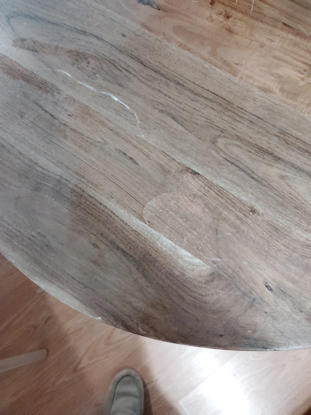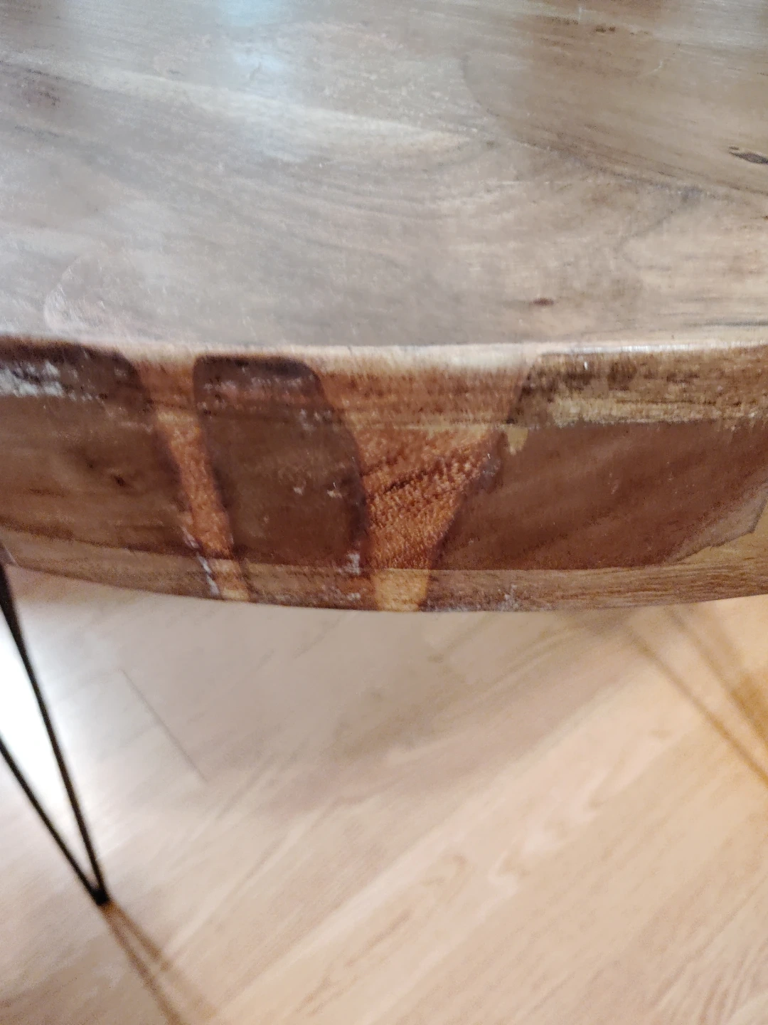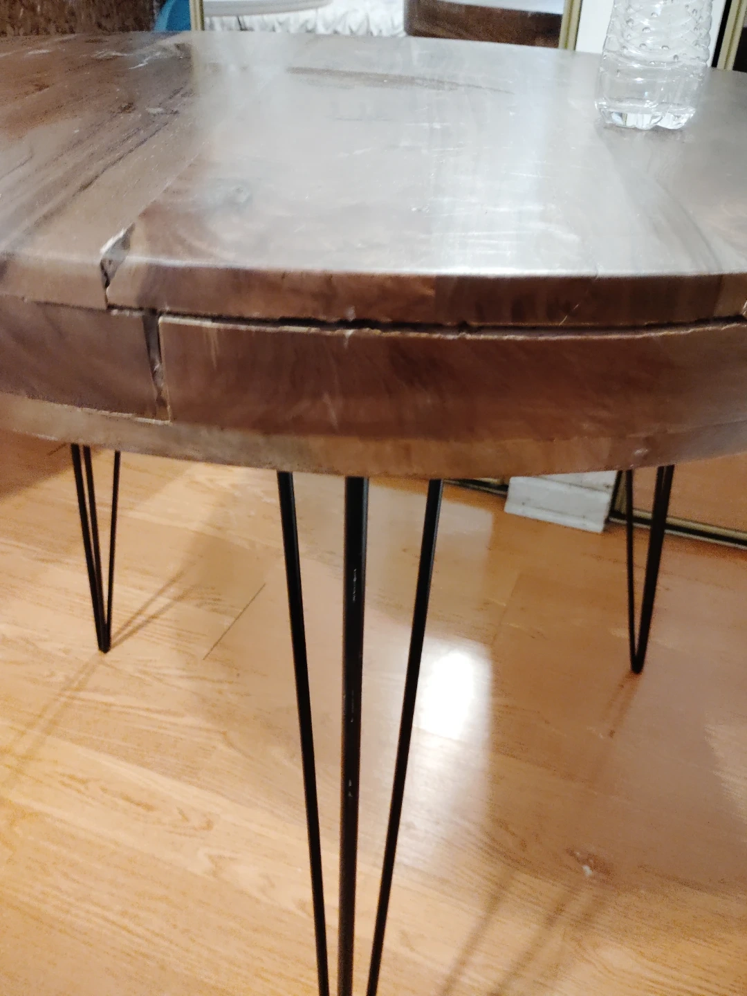 Selling a round coffee table with a solid wood top and metal hairpin legs. It has a rustic look and feel. 43" around.