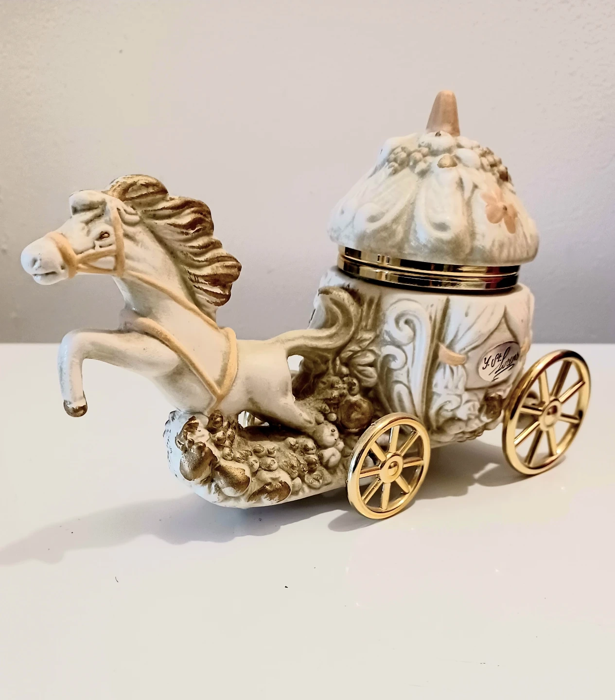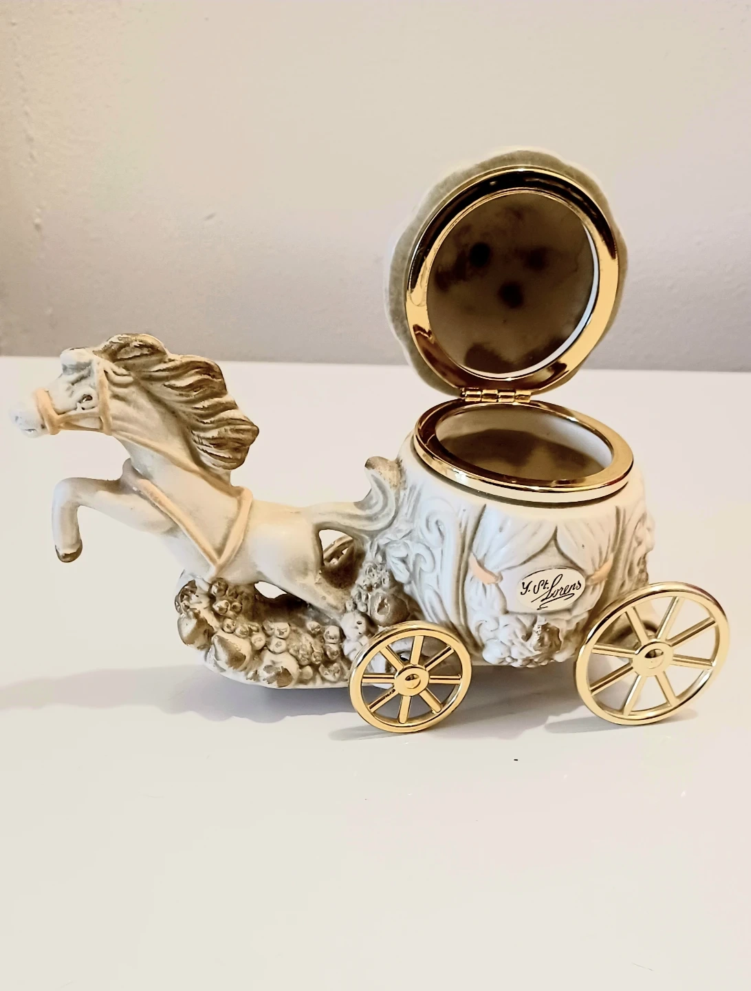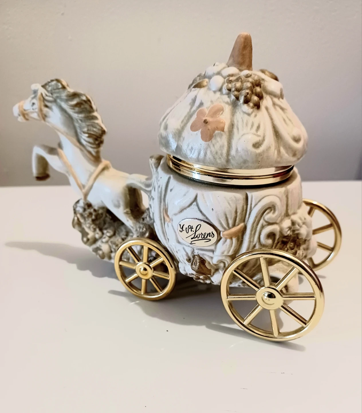 This vintage Italian Lorens Executive Carriage is a charming decorative piece, featuring a horse-drawn carriage design with gold-tone accents. It is perfect for collectors or as a unique home décor item. This exquisite piece is made in Italy by Lorens. It's in very good condition. It is stamped on the bottom. Add this whimsical piece to your home or give it as a gift. Don't delay! If the ad is up, it's available!
