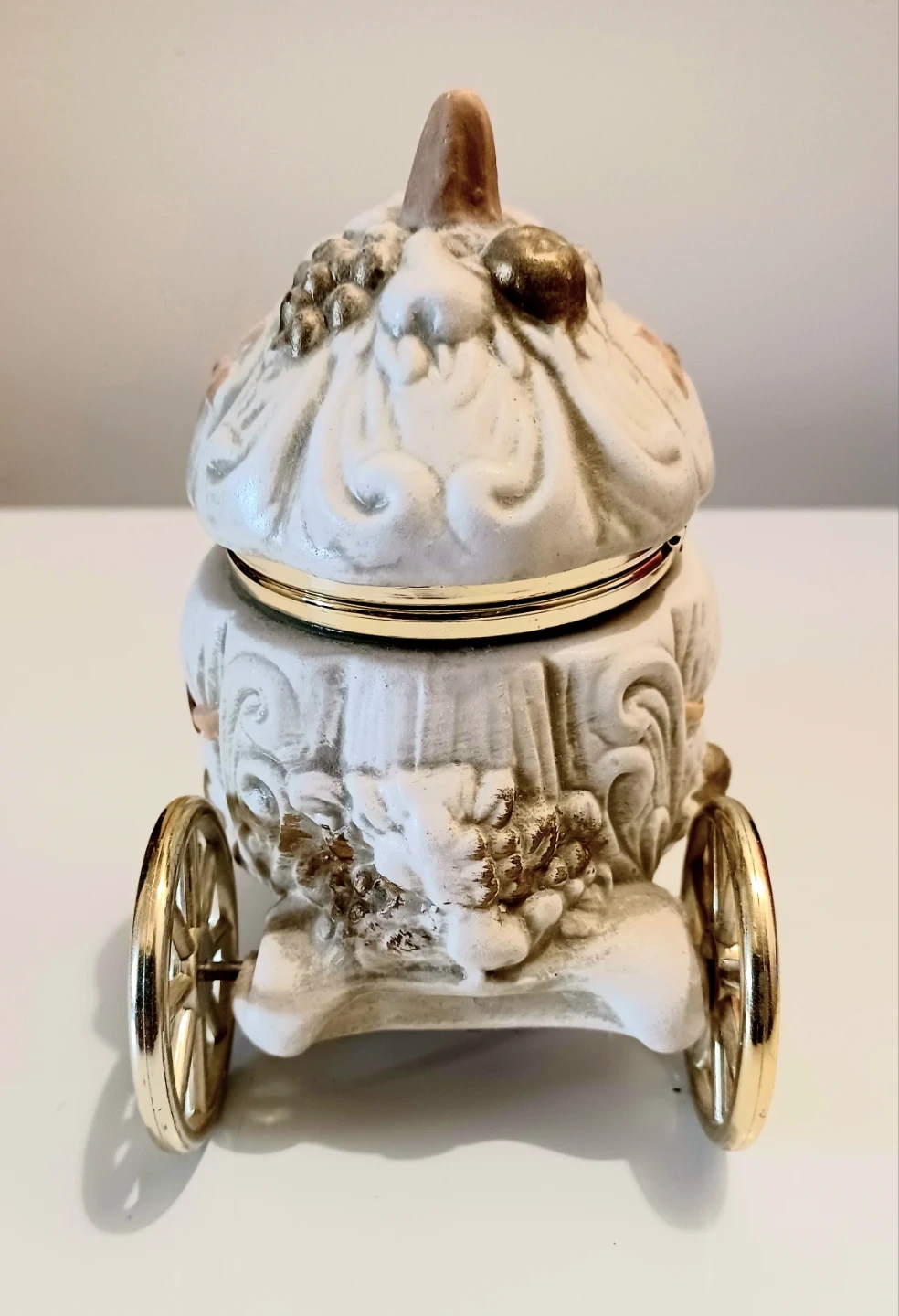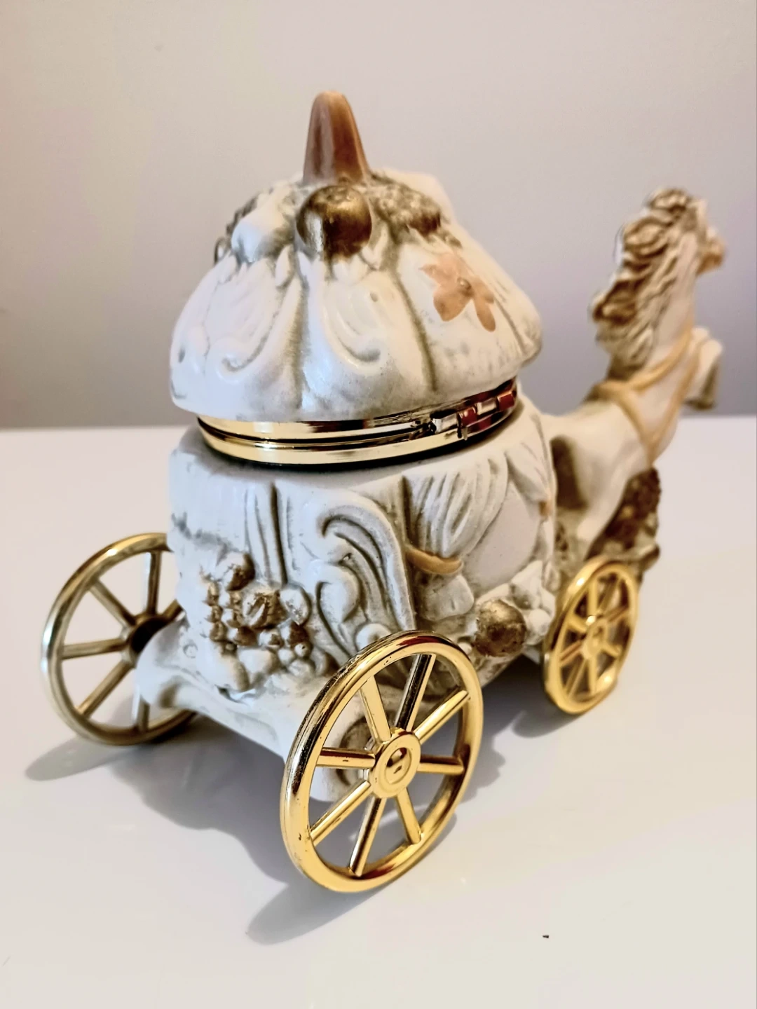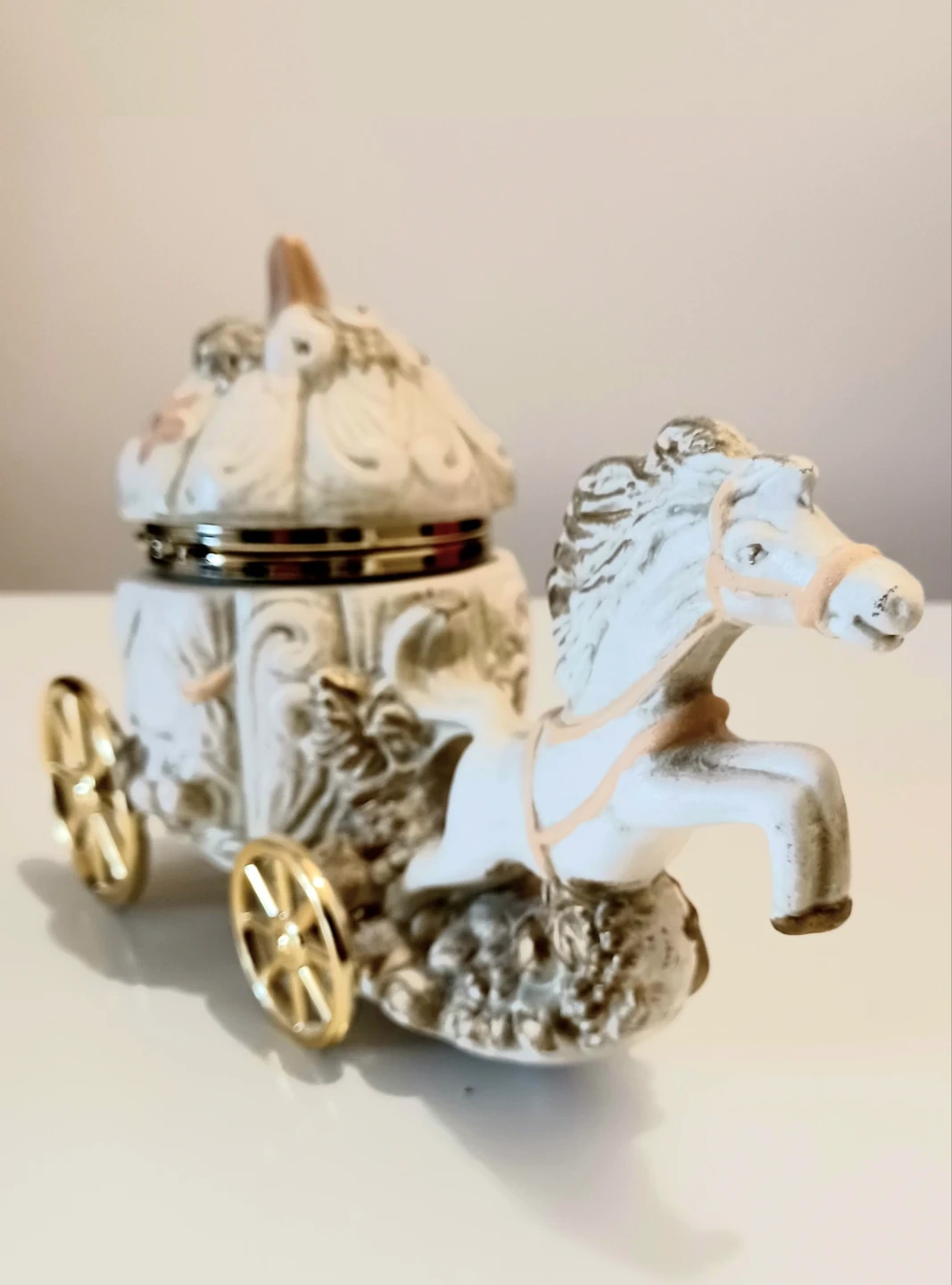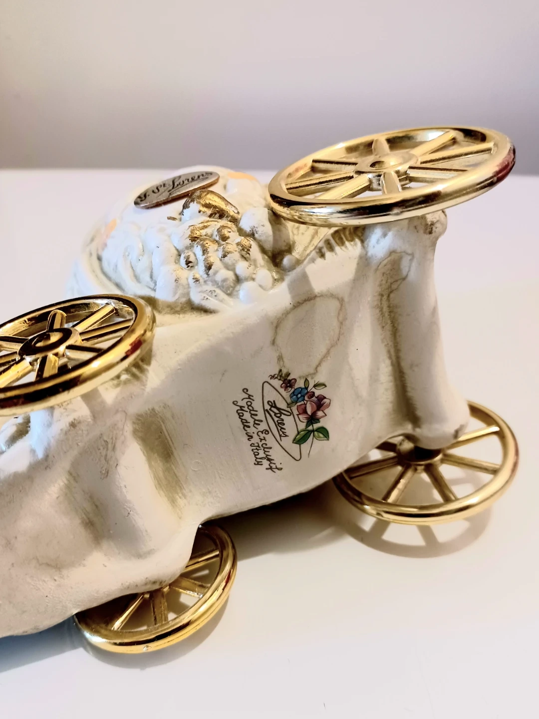 This vintage Italian Lorens Executive Carriage is a charming decorative piece, featuring a horse-drawn carriage design with gold-tone accents. It is perfect for collectors or as a unique home décor item. This exquisite piece is made in Italy by Lorens. It's in very good condition. It is stamped on the bottom. Add this whimsical piece to your home or give it as a gift. Don't delay! If the ad is up, it's available!