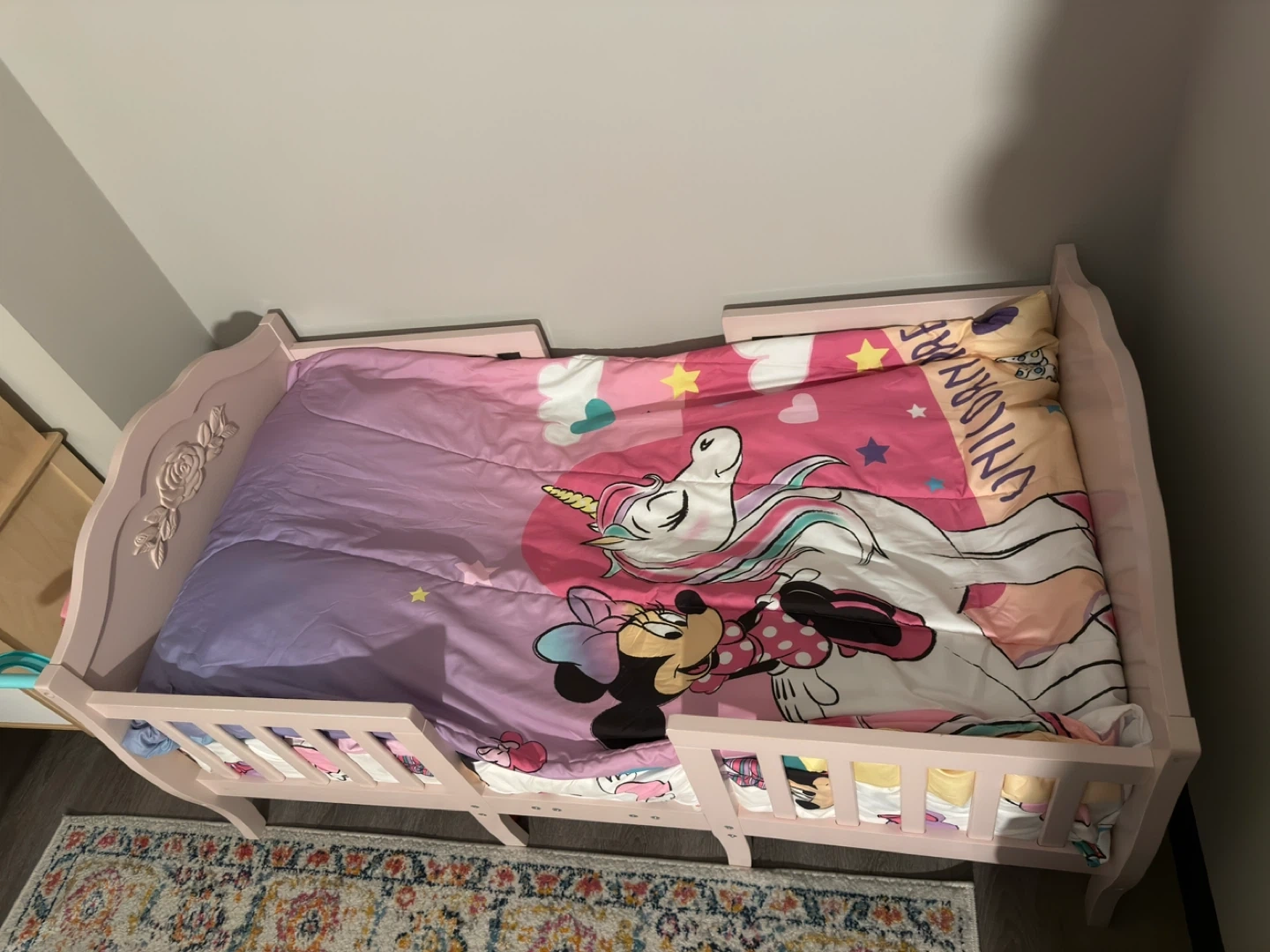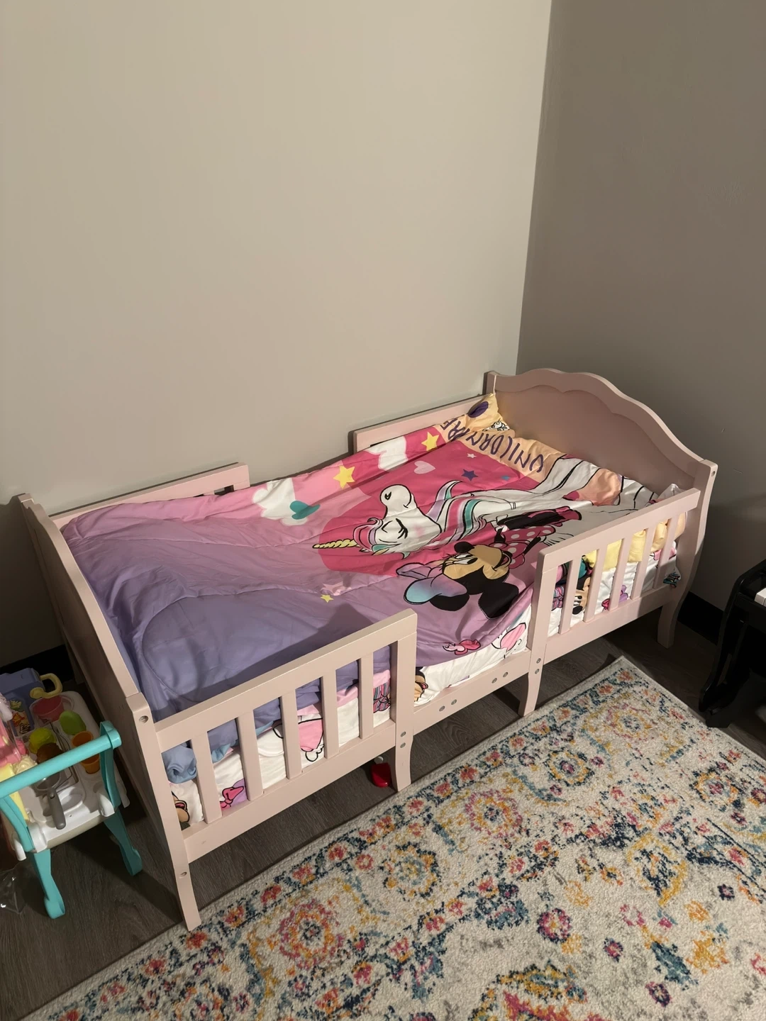 Selling a toddler bed in pink with a toddler mattress & waterproof cover. It's in great condition and ready for a new home. Perfect for transitioning your little one from a crib to a bed.