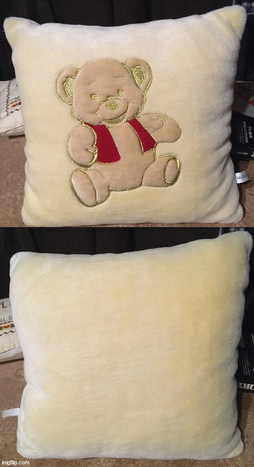 VERY GOOD CONDITION. BEIGE PILLOW WITH A BEAR IN A RED VEST WITH A GOLD TRIM.