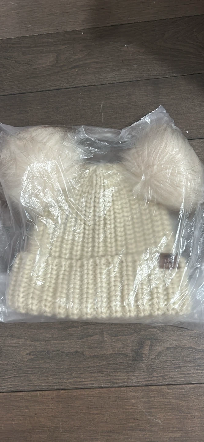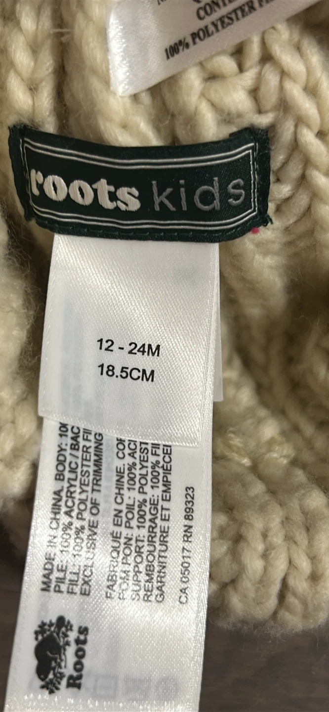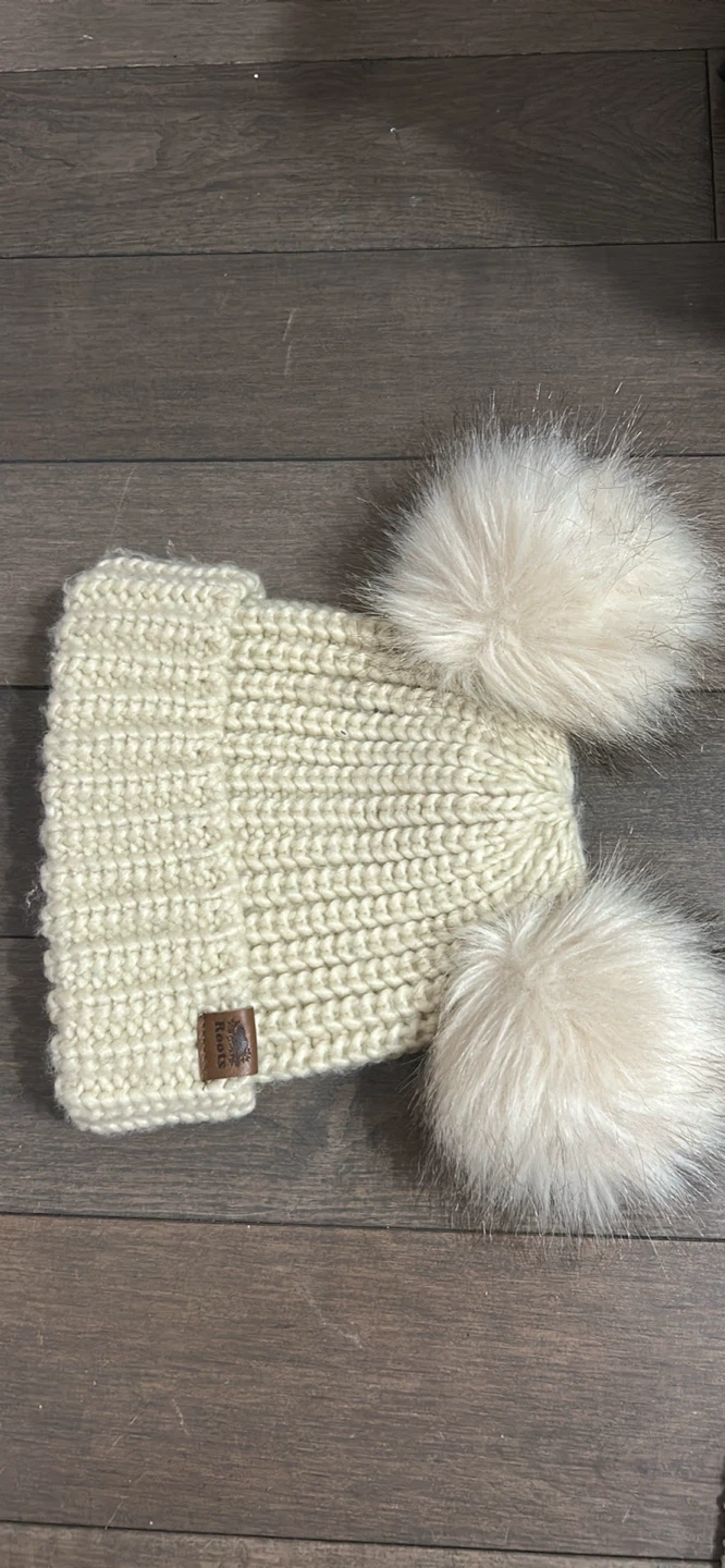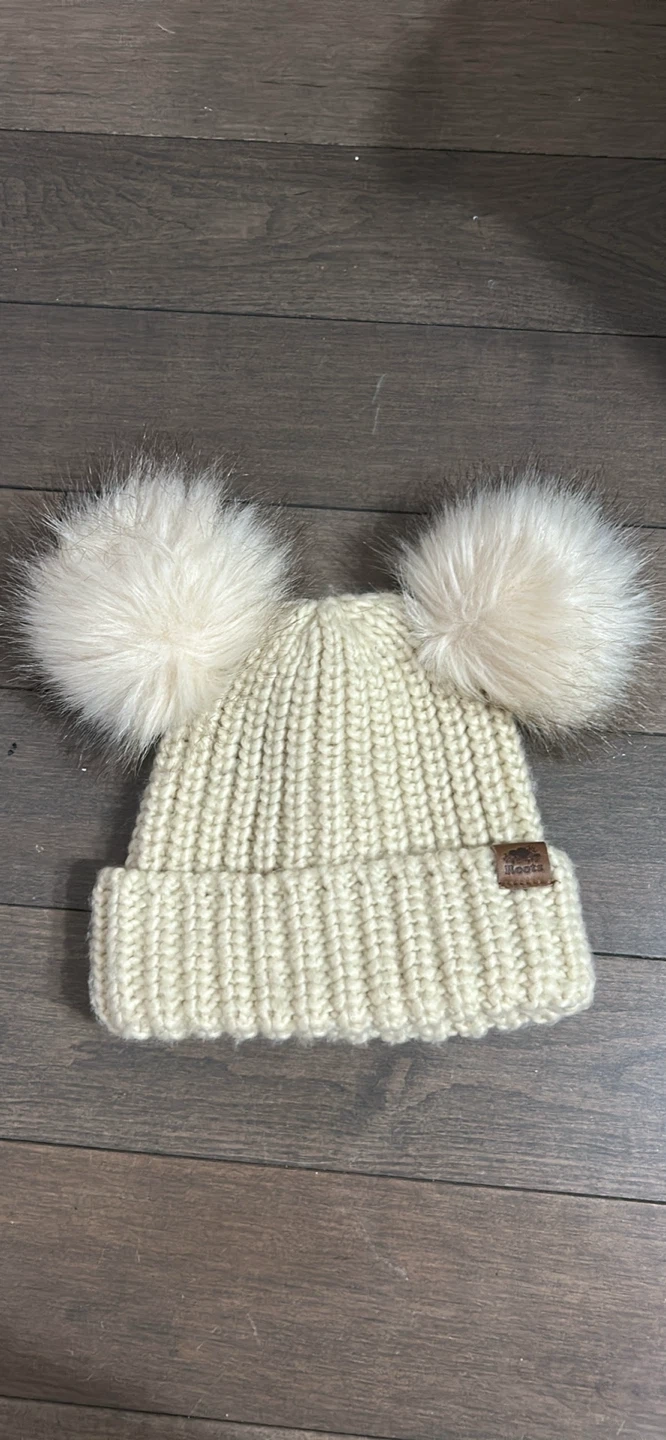 Keep your little one cozy with this adorable Roots Kids knit hat! It's in great condition and features cute cream-coloured pom poms. The size is 12-24 months (18.5cm). Made with 100% acrylic body and 100% polyester fill. Perfect for keeping your little one warm this winter!