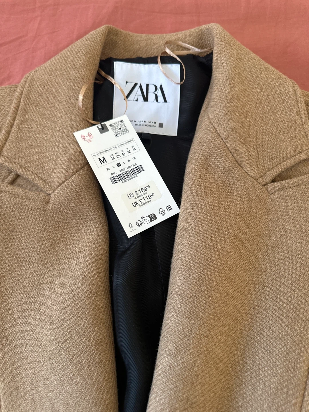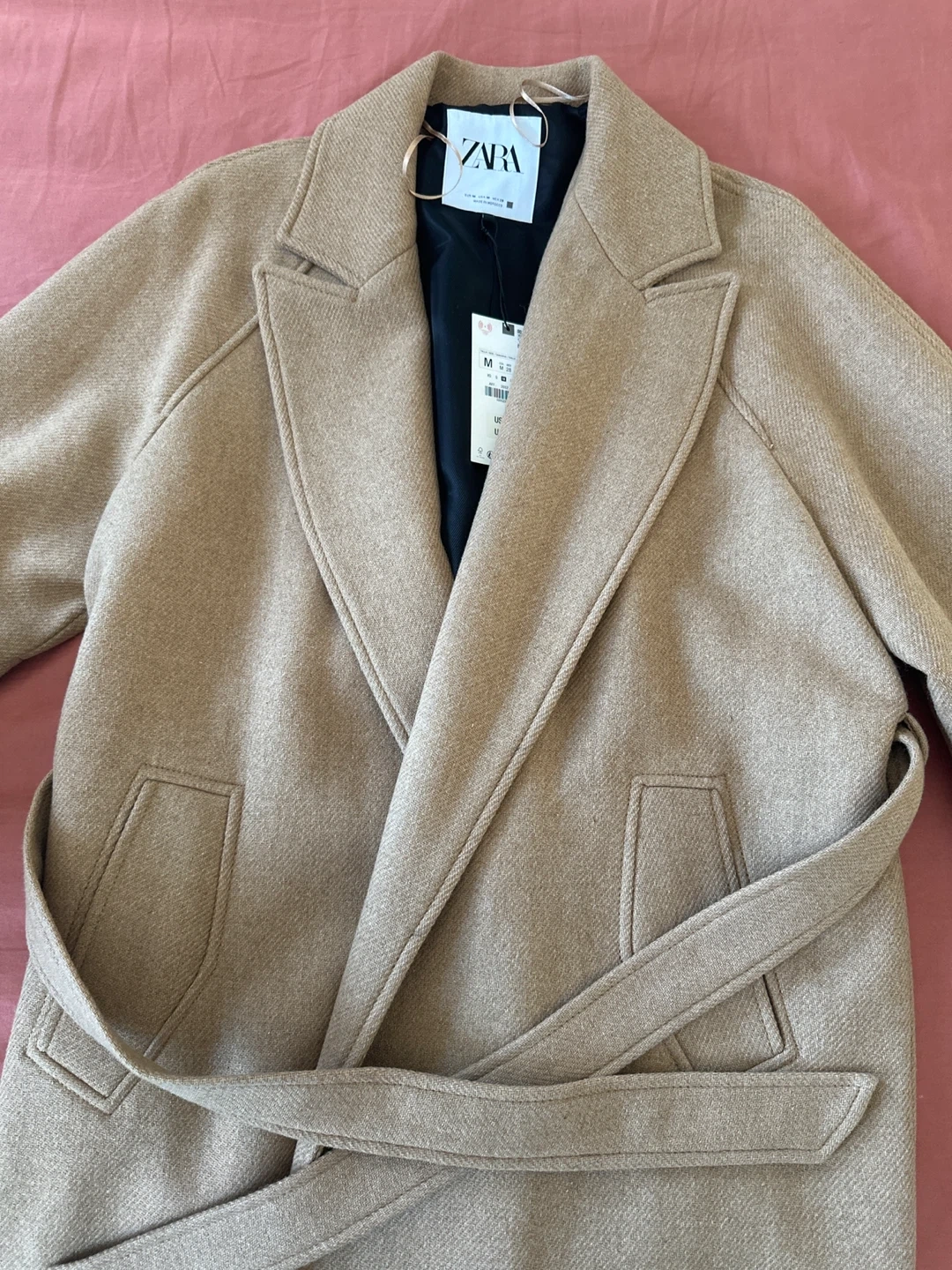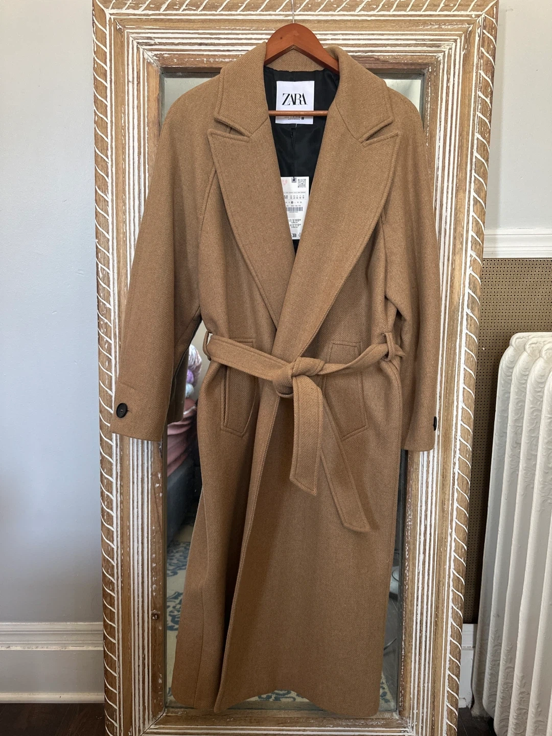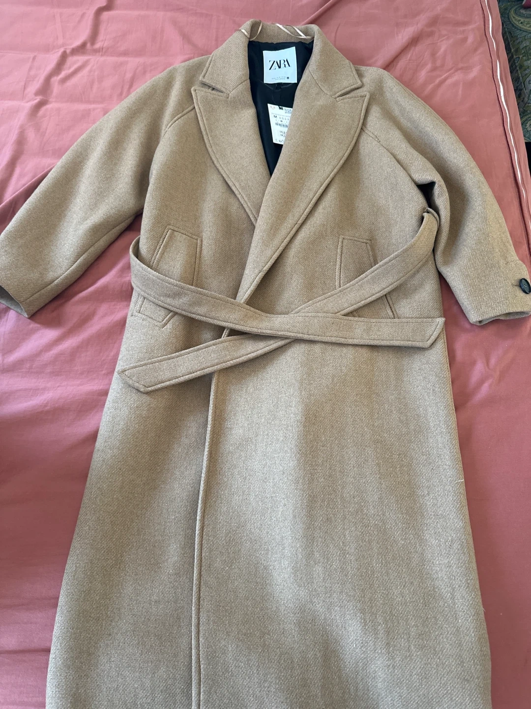 Selling a Zara camel colored wool blend belted coat in a size medium. It's a beautiful coat that's perfect for fall or winter. Oversized, drop-shoulder style. The coat is new with tags and originally cost $169!
